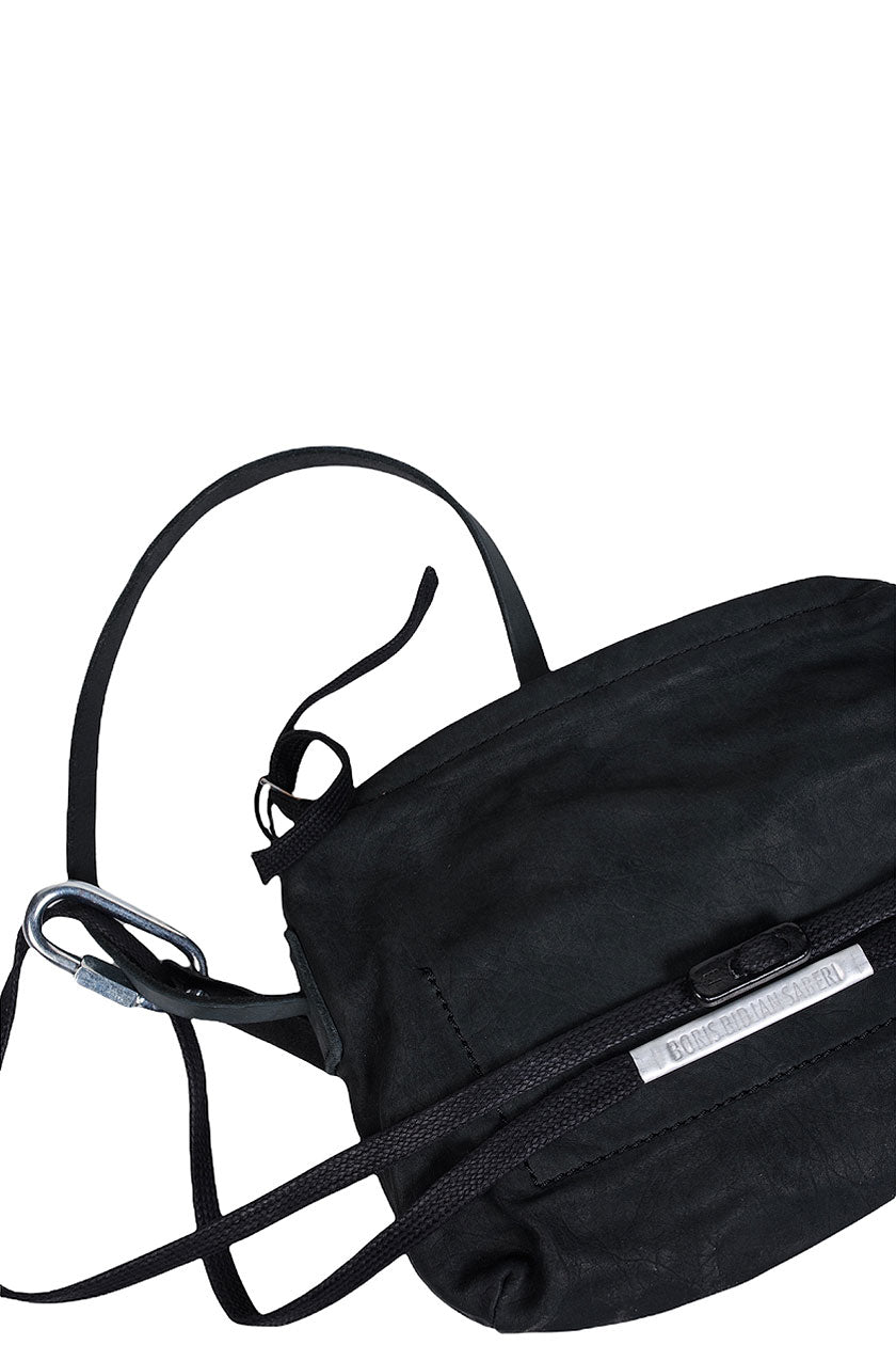 Handcrafted Horse leather messenger bag in black. Fading throughout. Suede shoulder strap in black. Zip closure. Two patch pockets at interior. Unlined. Tonal waxed cotton keychain with carabiner fastening included. Silver-tone hardware.
