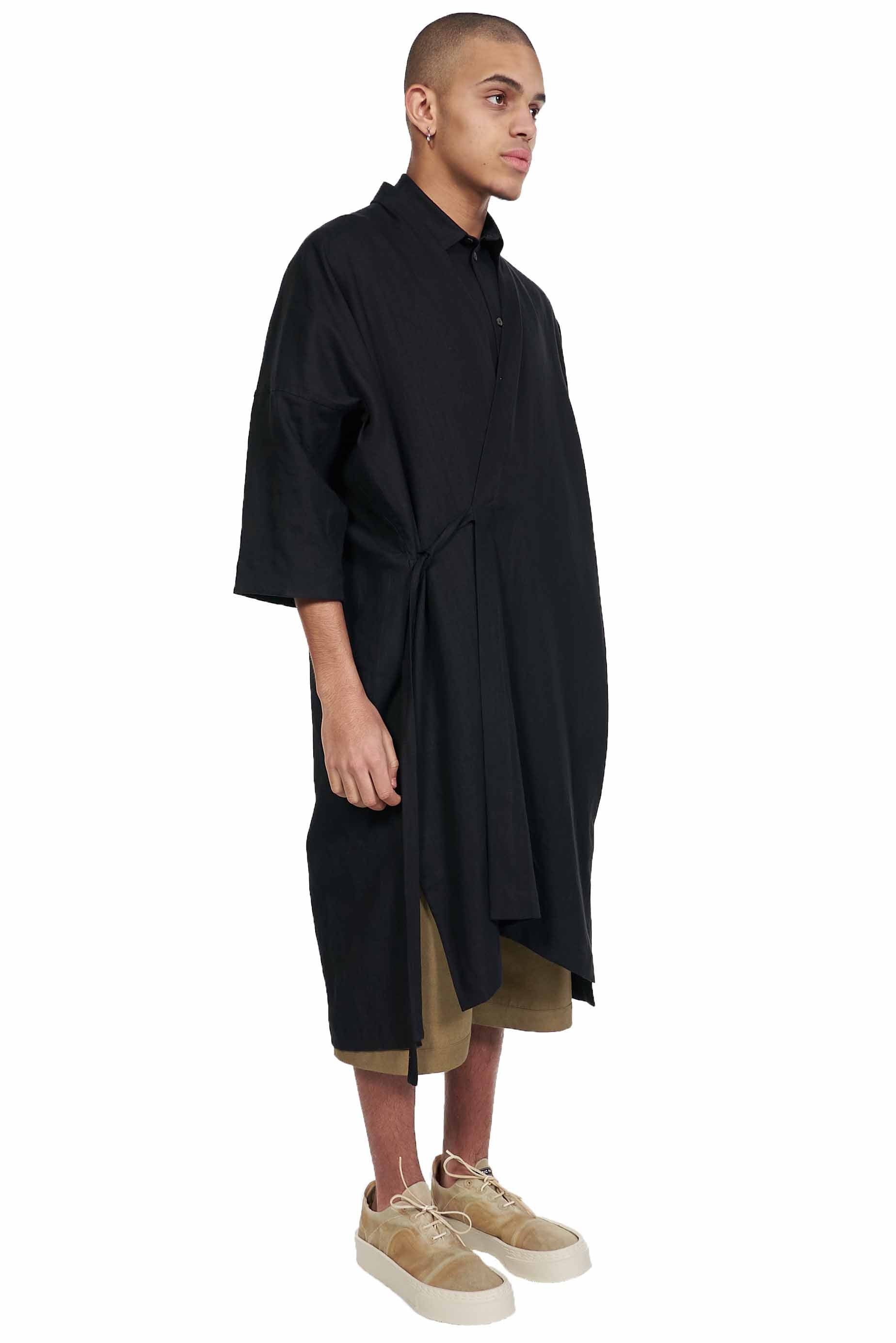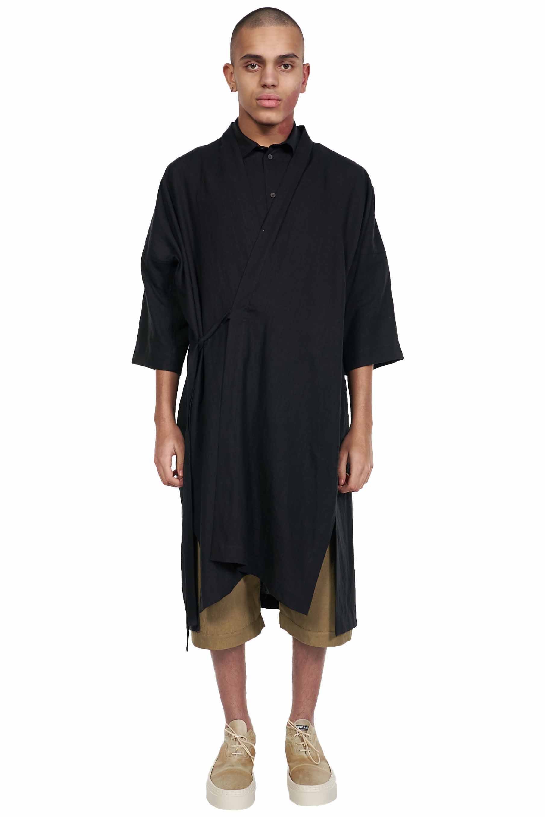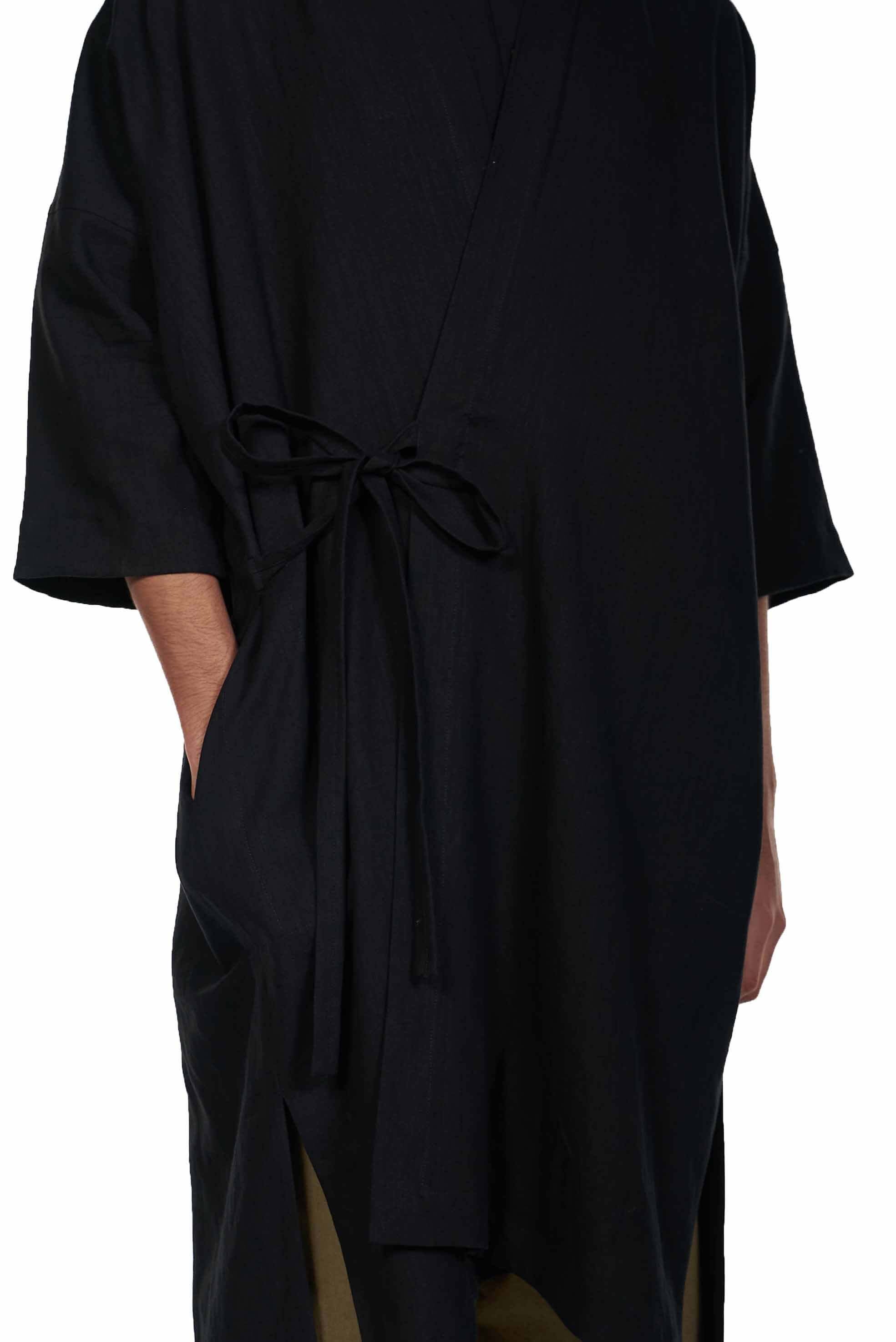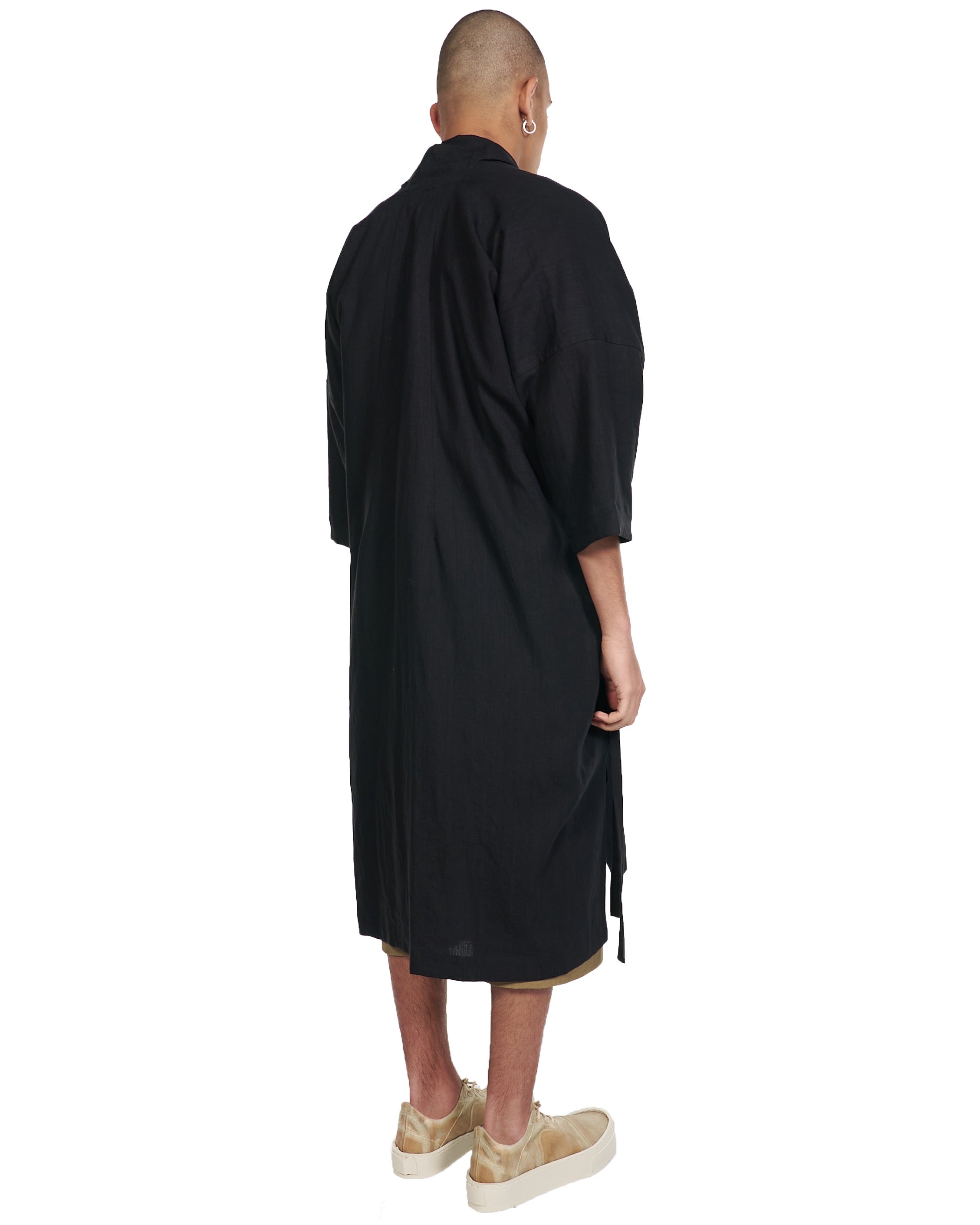 Half-sleeve linen and paper-blend broadcloth robe in black. Integrated self-tie closure at front. Shawl collar. Welt pockets at waist. Unlined.