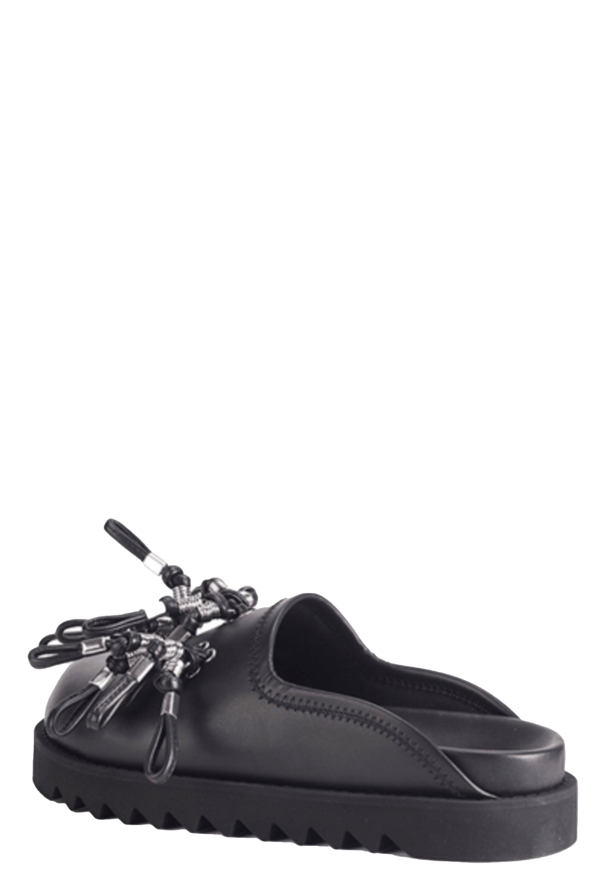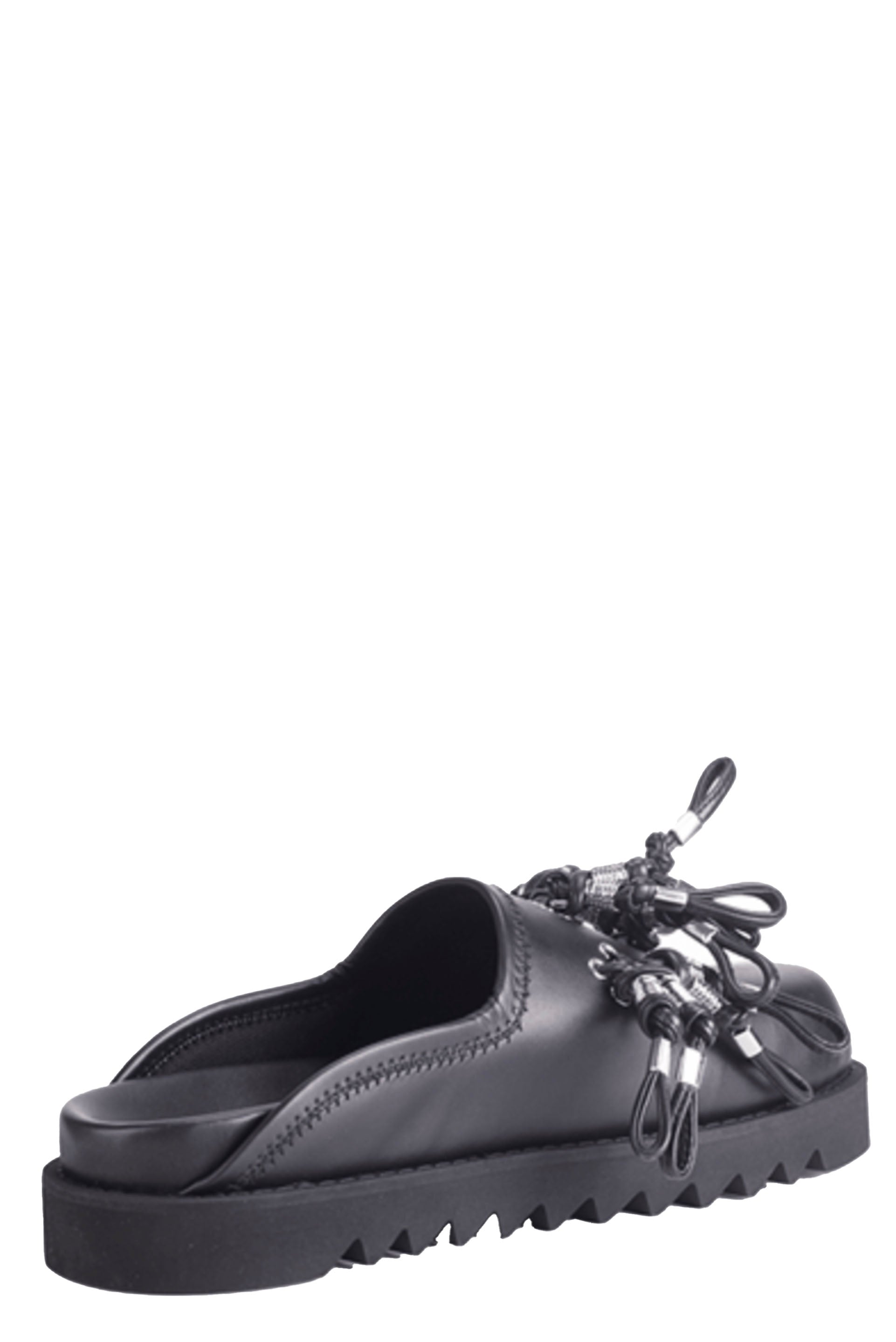 Toga Virilis Black leather sabot. Black finish. Flat rubber sole. Branded foot bed. Metal eyelet detailing. Charm detail throughout.