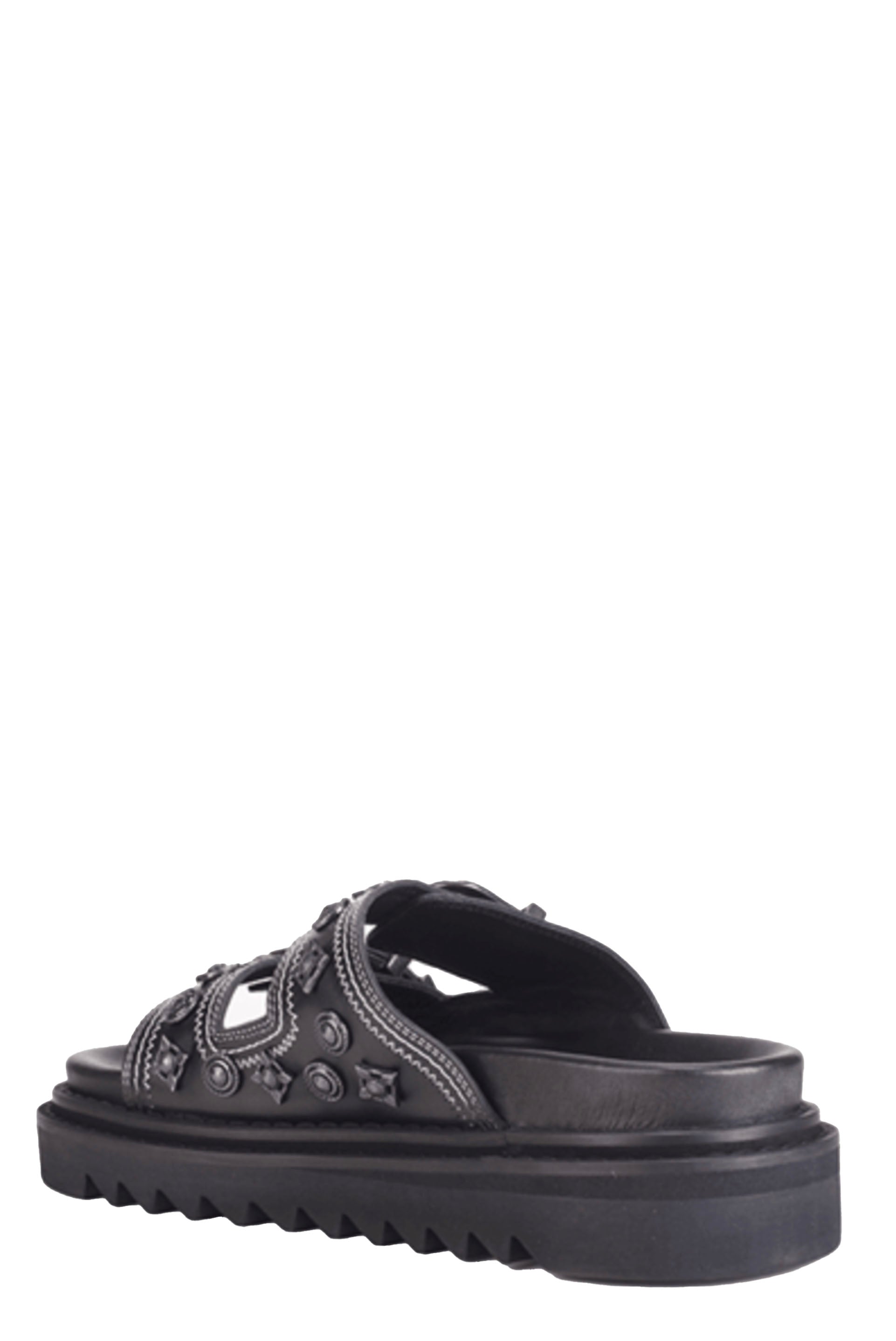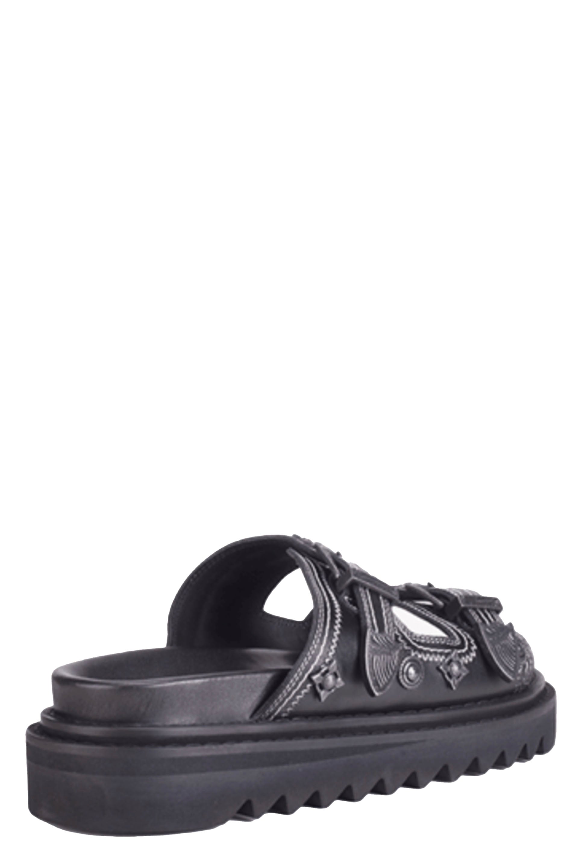 Toga Virilis shoes aesthetic was born from a desire to fuse contemporary western styles with traditional Japanese design, detailing and materials. Toga's footwear take inspiration from vintage elements, brought up to date with contemporary shapes and bold prints as seen with the Black Leather White Stitch Buckle Sandal.