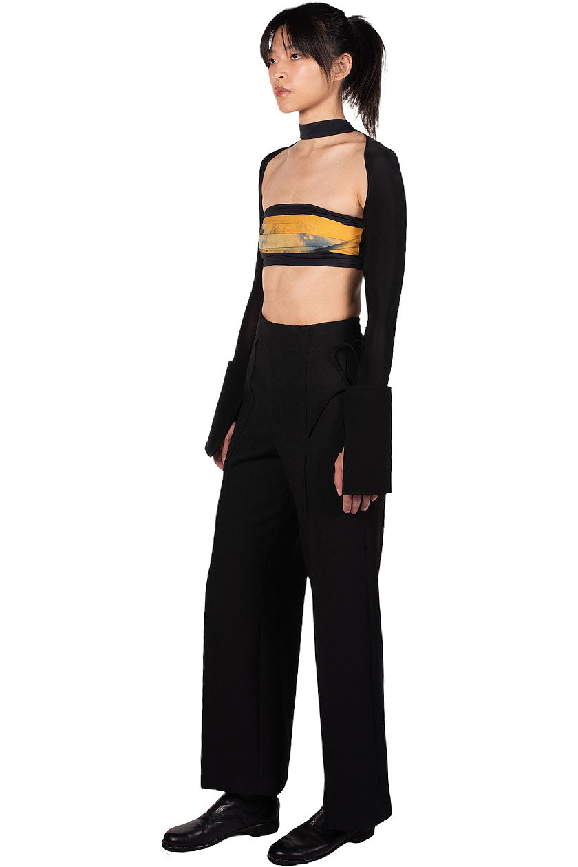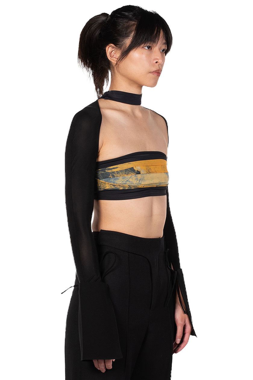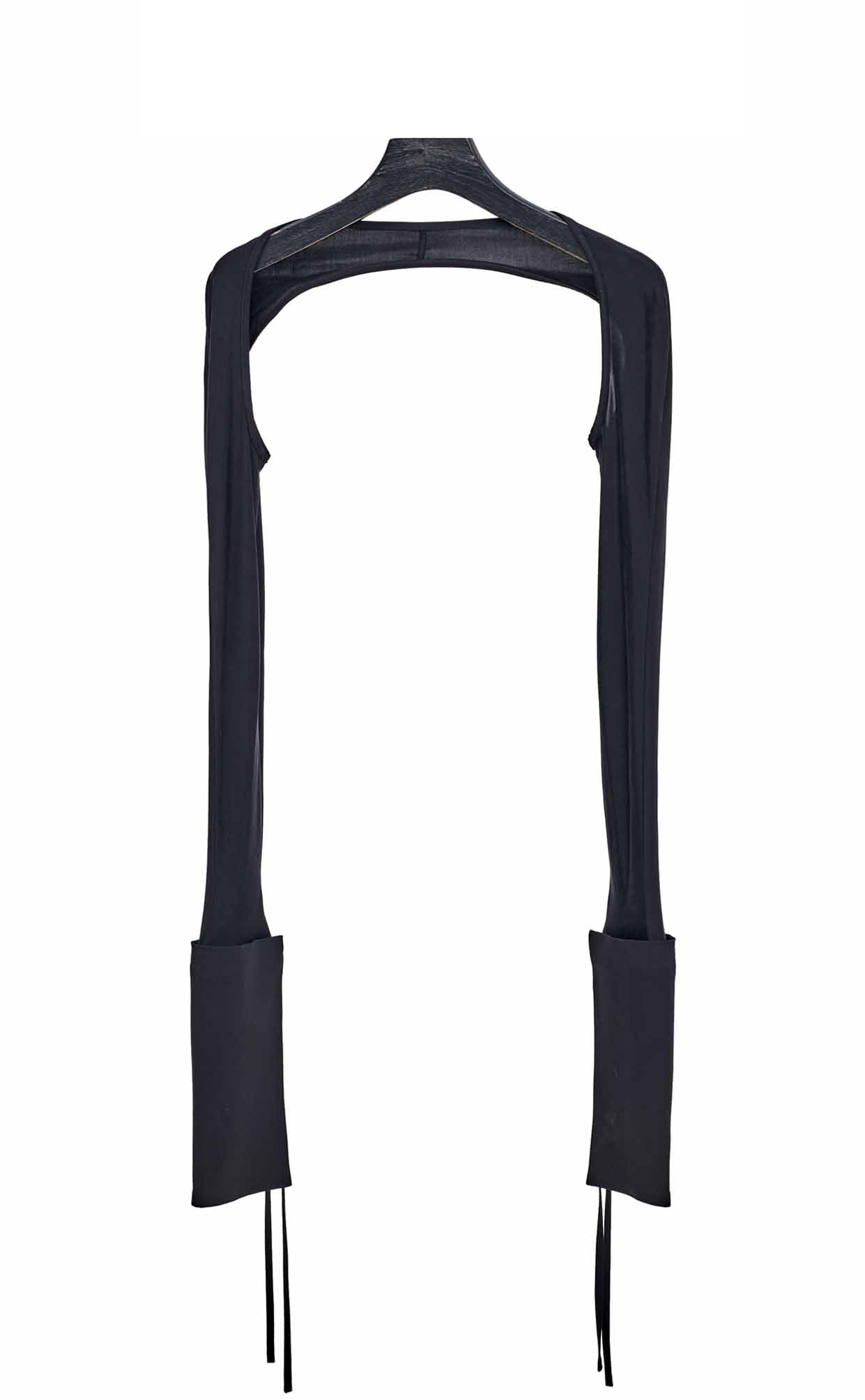OUDE WAAG strikes a balance between Asian aesthetics and Western cutting. It is at the heart of designer’s philosophy: celebrating the power of women, yet simultaneously critiquing the ongoing objectification and idealisation of the body as you can see with the Black Mesh Oversleeves.