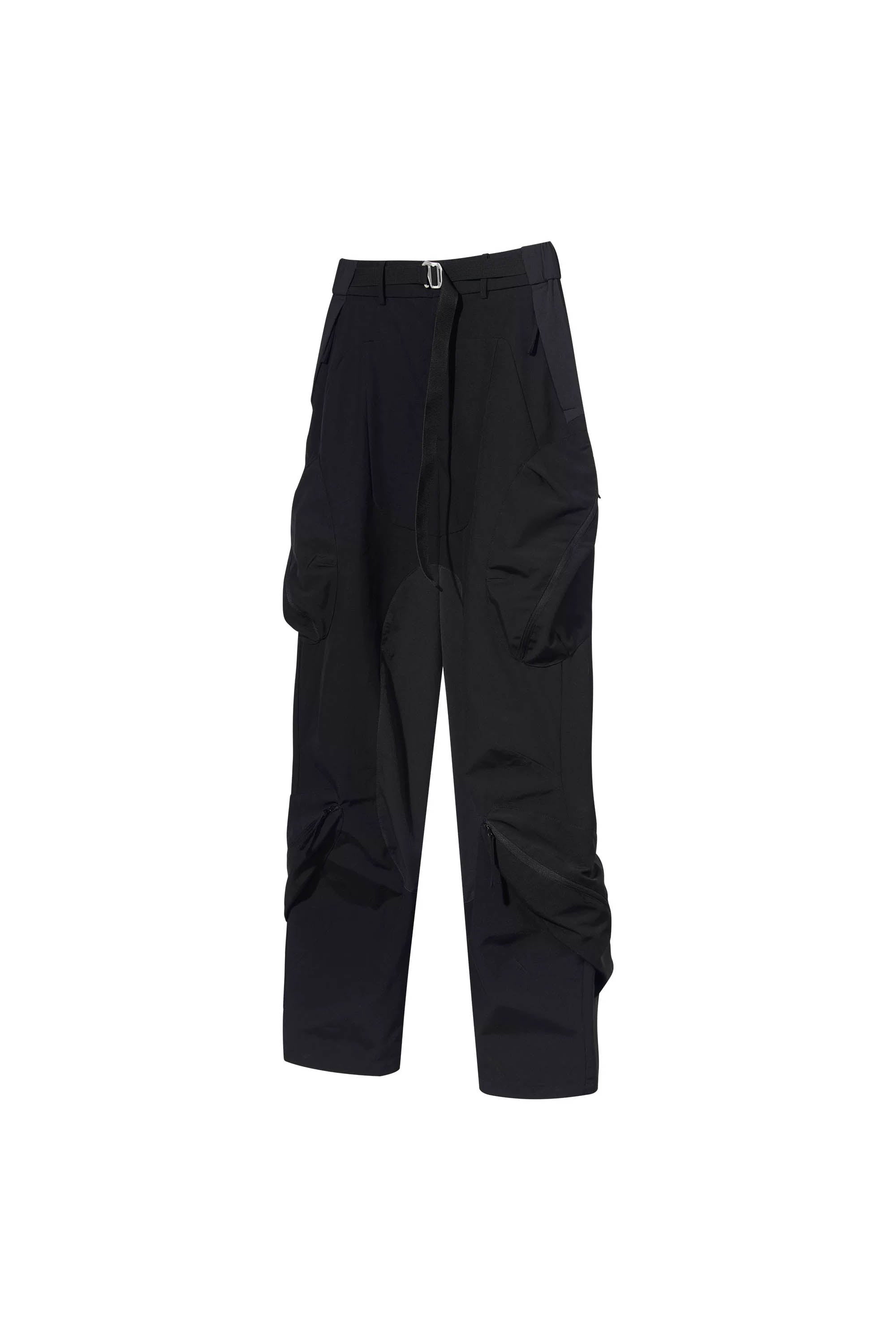 ATTEMPT reconstructs different styles and elements to create a new aesthetic system. By taking a more experimental approach to creation and production, which involves an understanding of the past and the current form of society, Attempt is creating an aesthetic form that is anchored in the present but different from it. It must ultimately be a product that cannot be defined as seen with the Black Multi-Dimensional Pocket Trousers.