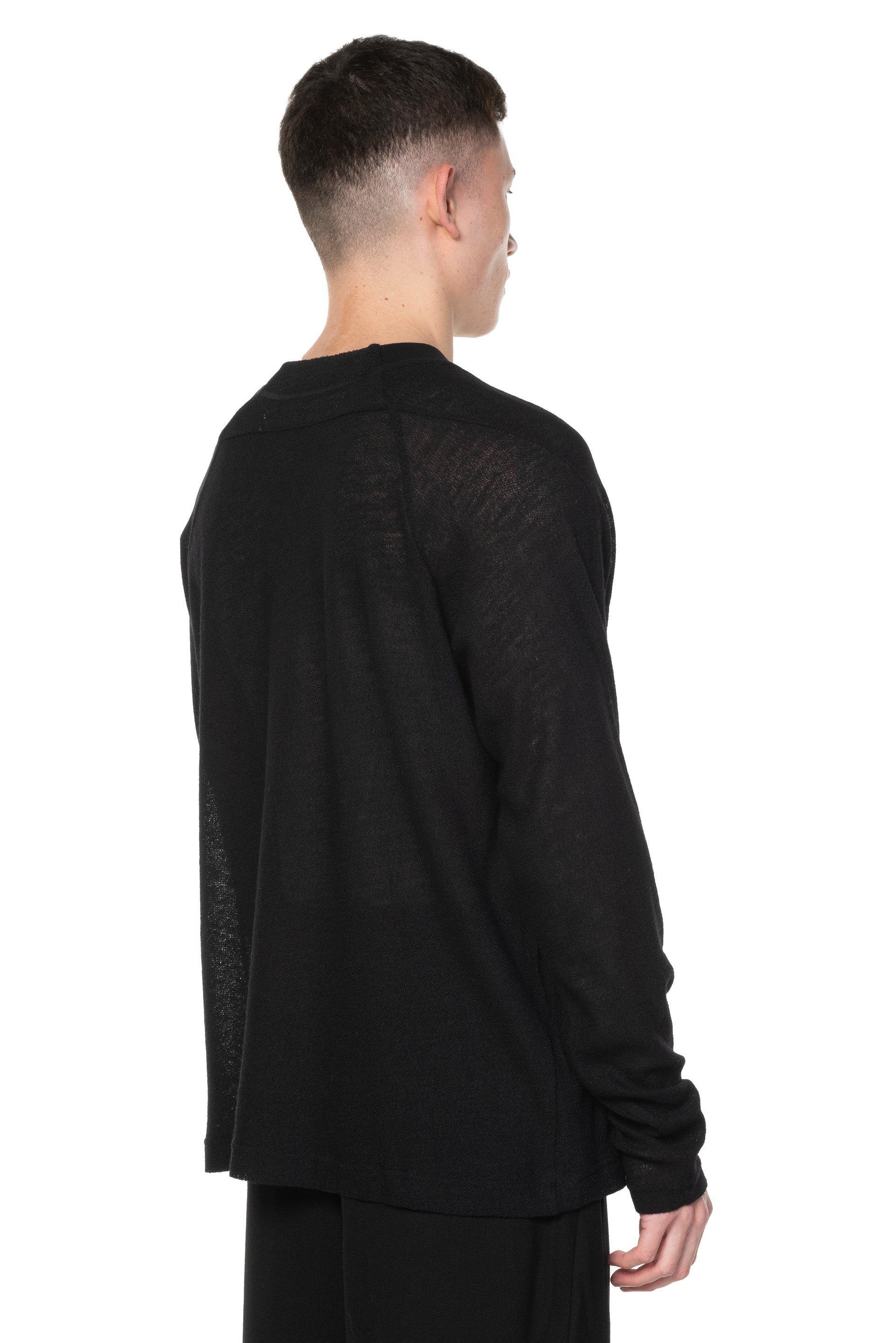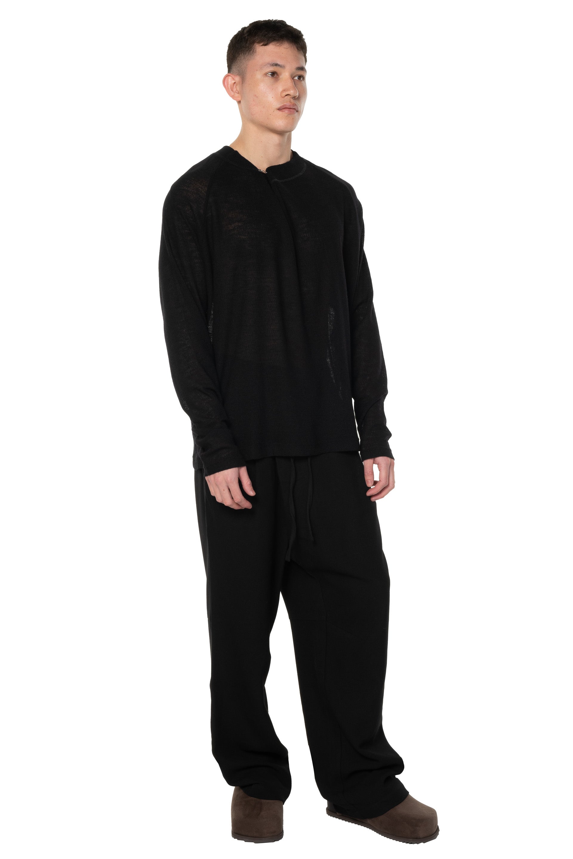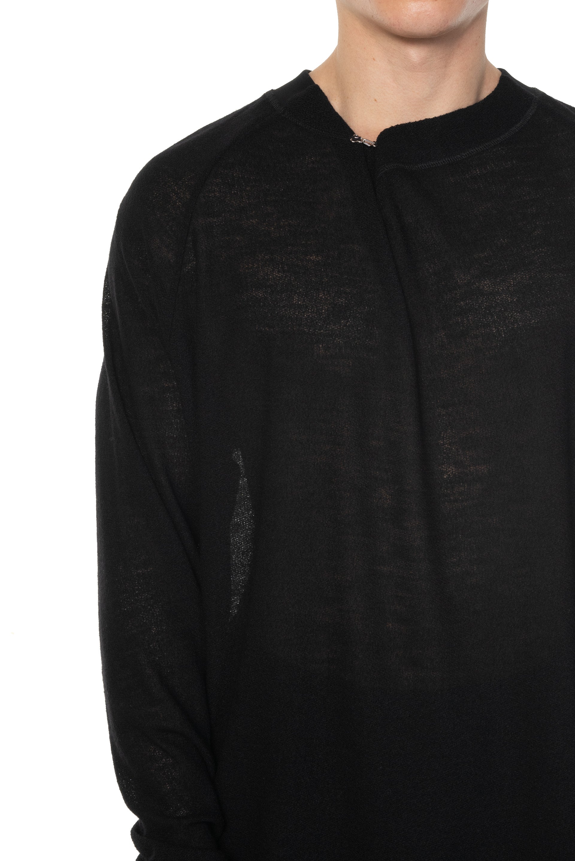 Long sleeves. Round neck with hook closure, offering a wide fit and simple detail at front. Light textural fabric. slightly see through.