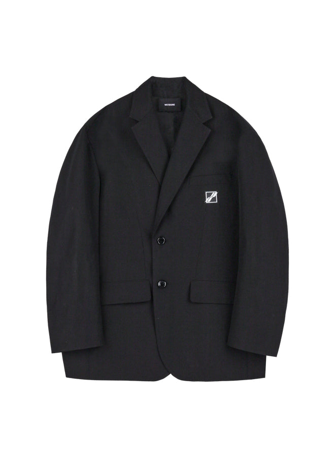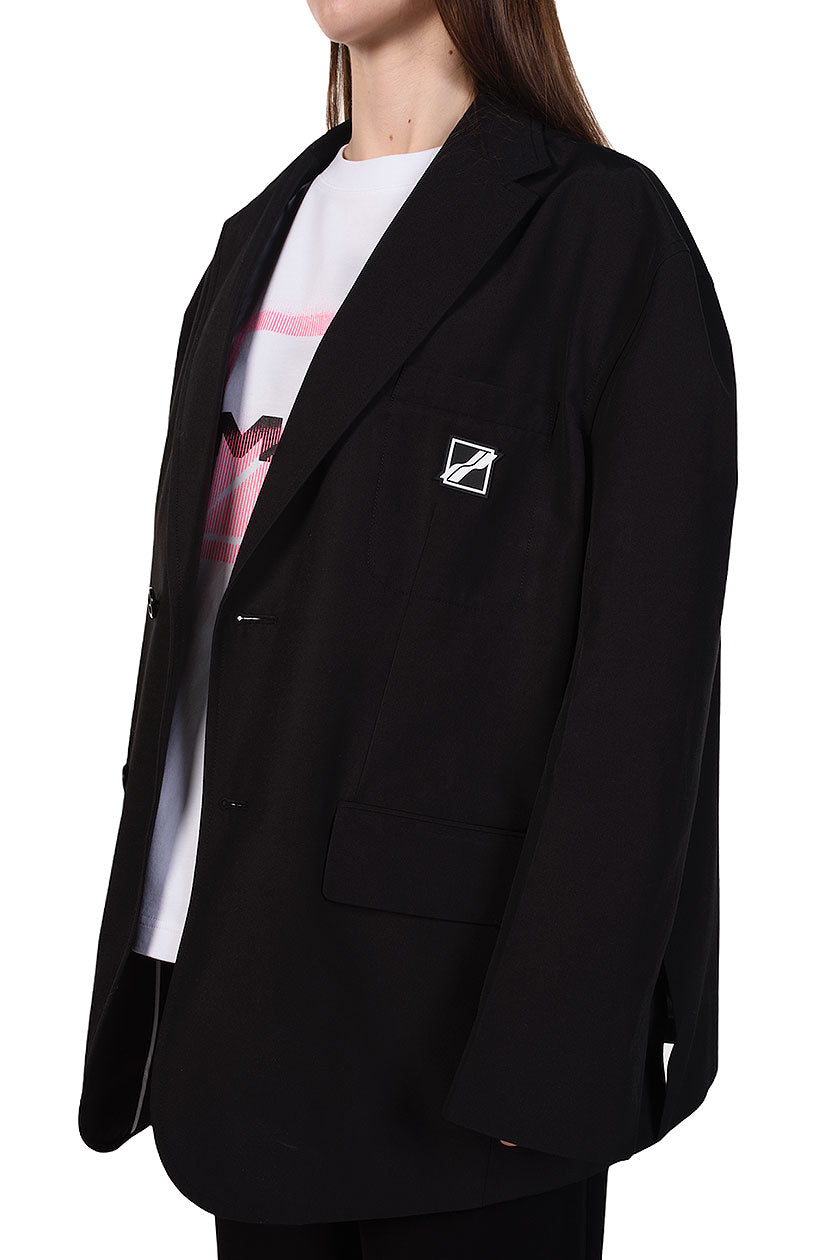 Long sleeve twill blazer in black. Notched lapel collar. Two-button closure at front. Welt pocket and rubberised logo patch at chest. Flap pockets at waist. Four-button surgeon's cuffs. Twin vents at back hem. Slit on both sides. Tonal satin lining. Fully lined.