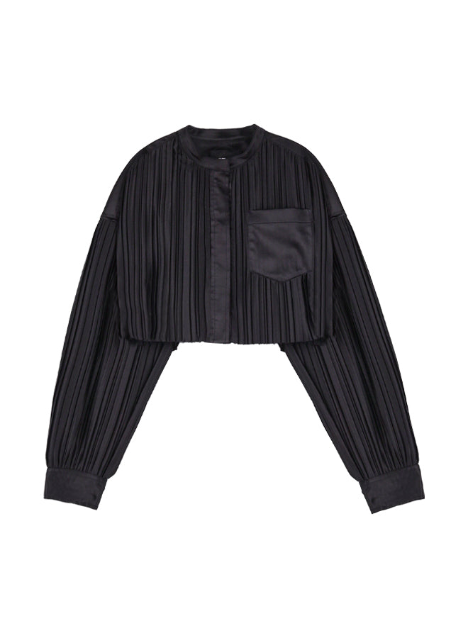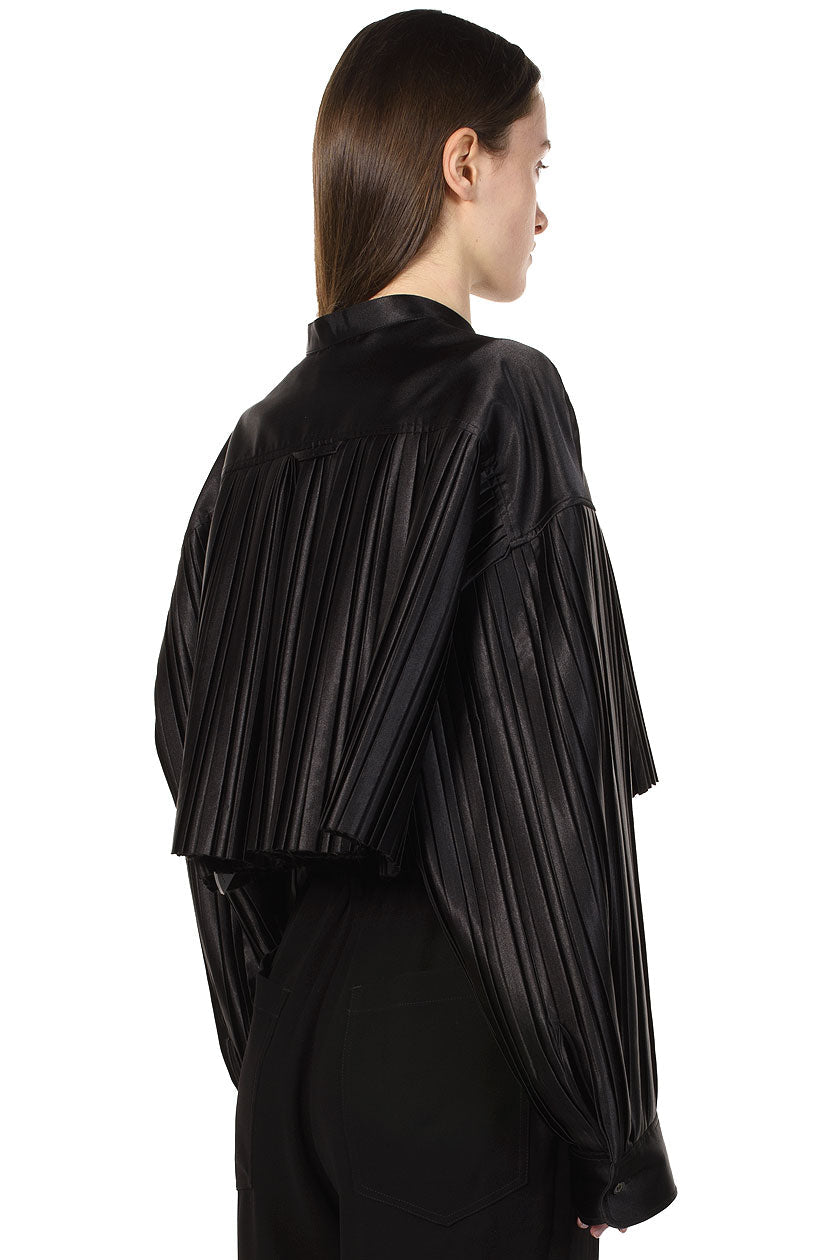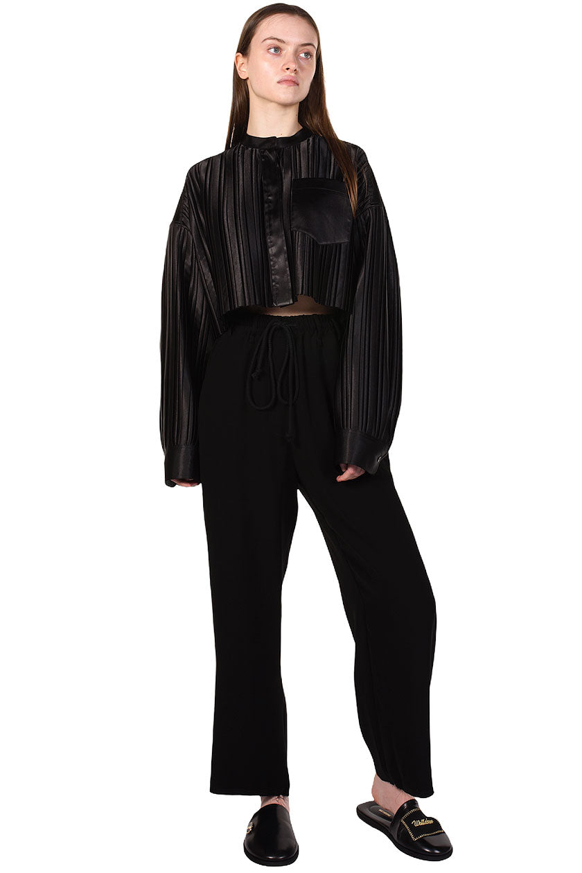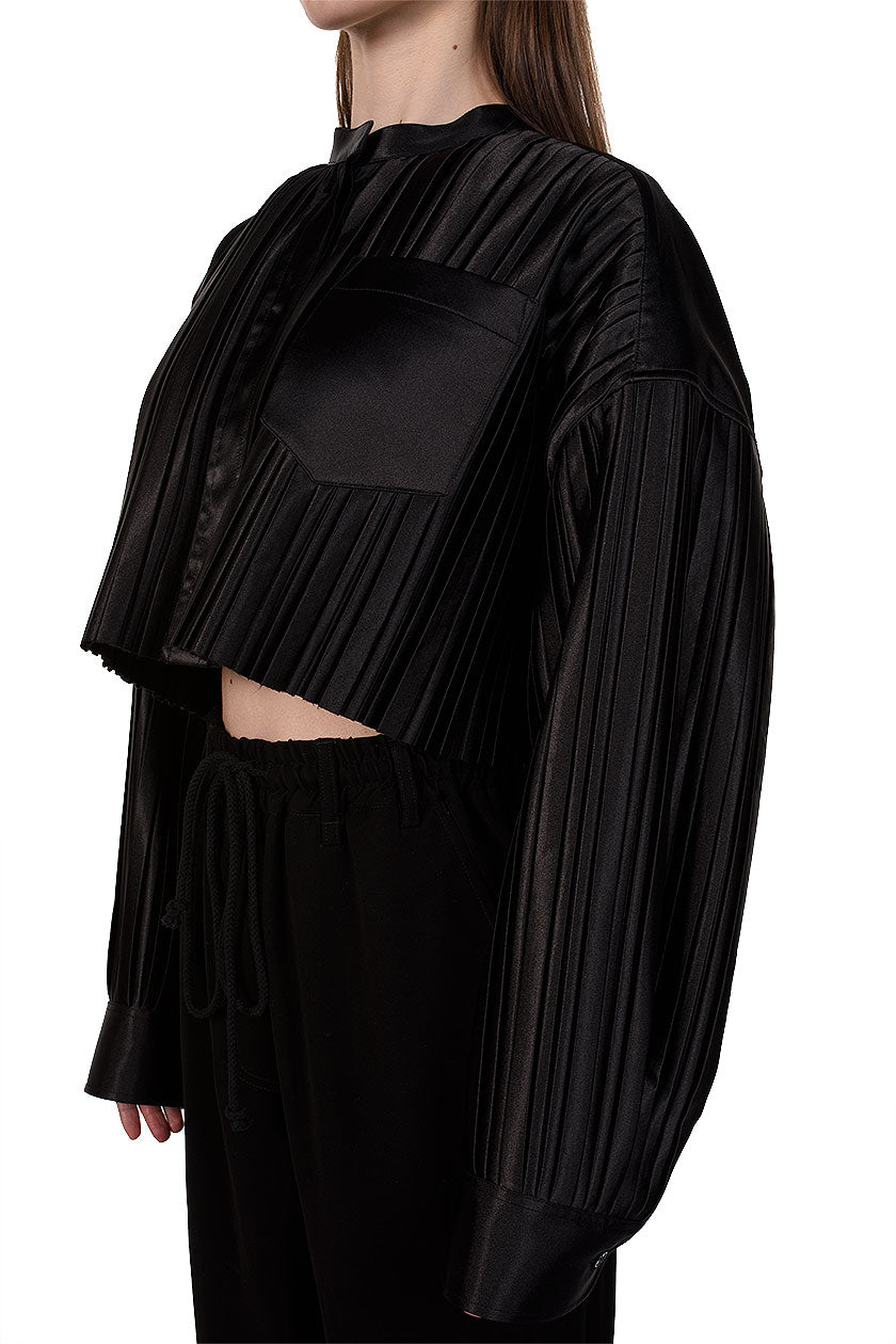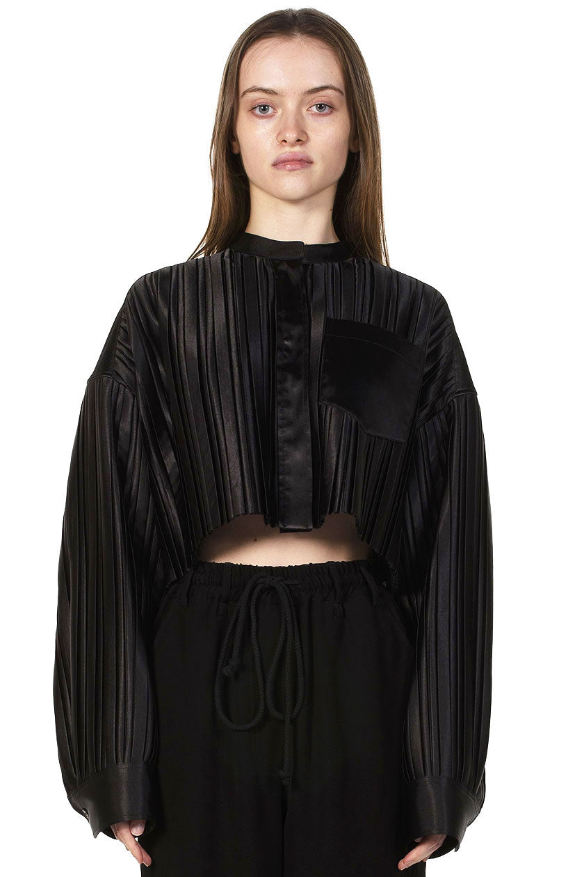 We11done merges late 1990s and early 2000s aesthetics creating a feeling of futurity. Functional, sportive, and sleek, We11done’s versatile designs refine classic elements into contemporary lifestyle pieces as seen with the Black Pleated Blouse. Button closure at front. Mao collar. Round neck. Long sleeves. Pocket at chest. Dropped shoulder. Oversized fit. Button closure at cuffs. Pleats throughout. Cropped.