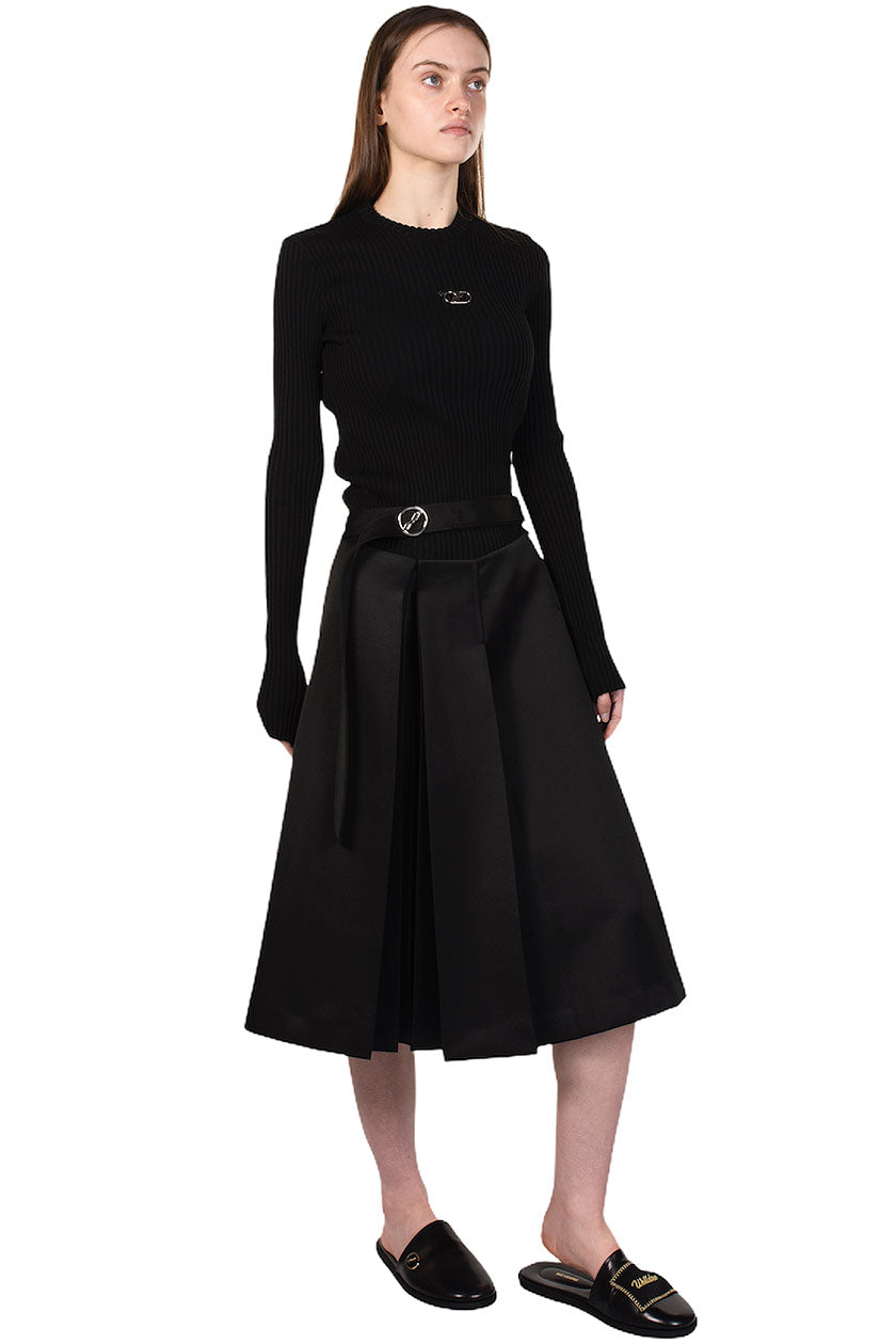 We11done merges late 1990s and early 2000s aesthetics creating a feeling of futurity. Functional, sportive, and sleek, We11done’s versatile designs refine classic elements into contemporary lifestyle pieces as seen with the Black Pleated Midi Skirt.