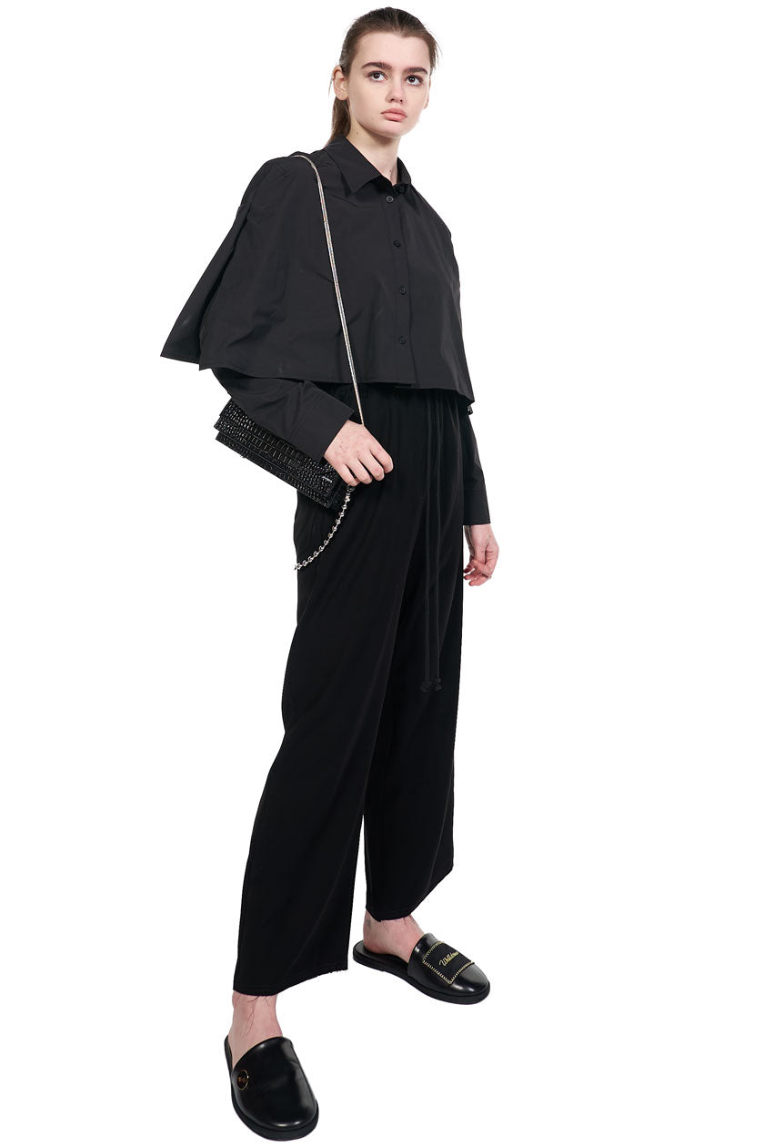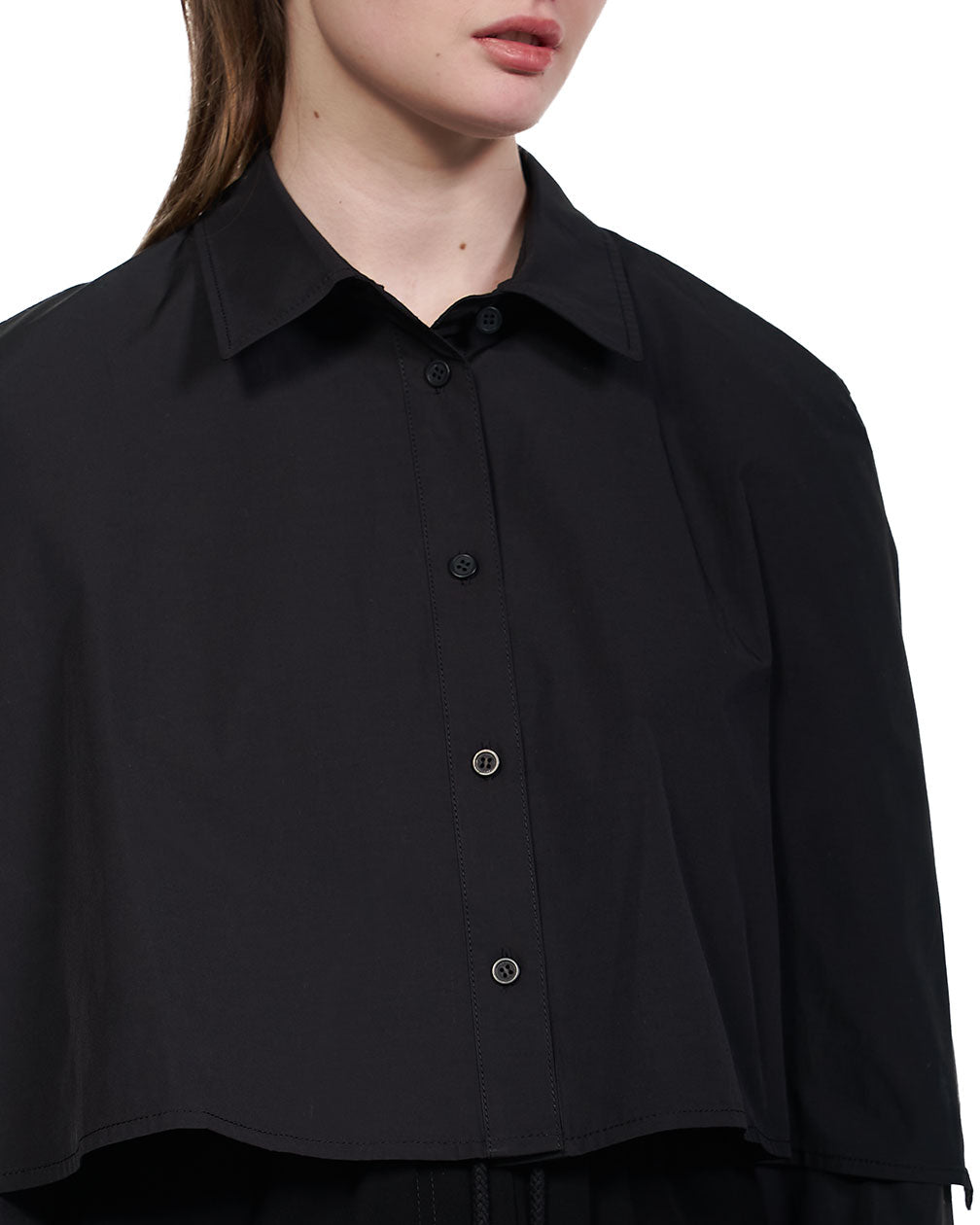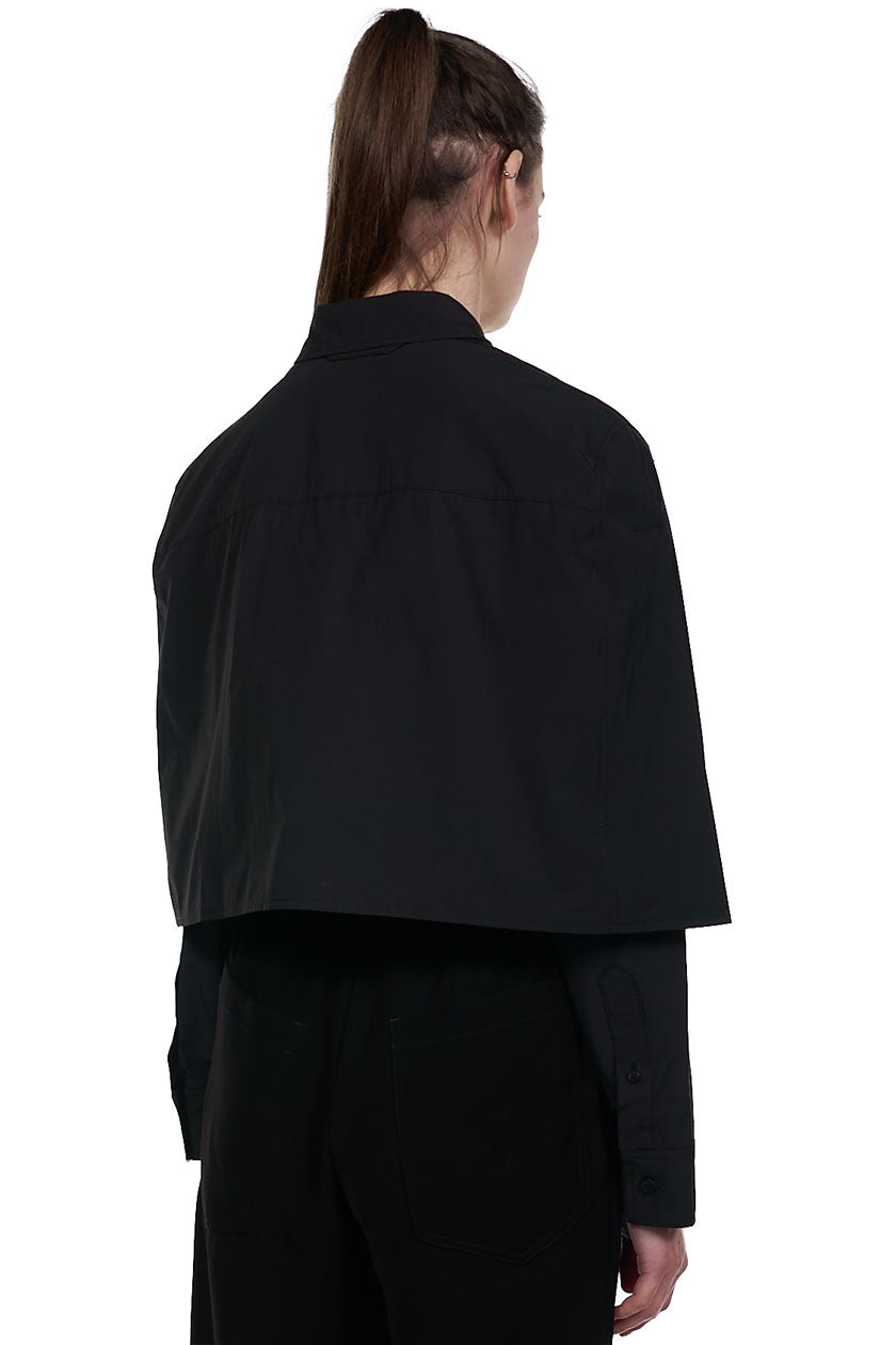 We11done merges late 1990s and early 2000s aesthetics creating a feeling of futurity. Functional, sportive, and sleek, We11done’s versatile designs refine classic elements into contemporary lifestyle pieces as seen with the Black Scallop Shirt. Cape sitting on shoulders. Button closure at front. Long sleeves with button closure at cuffs. Spread collar.