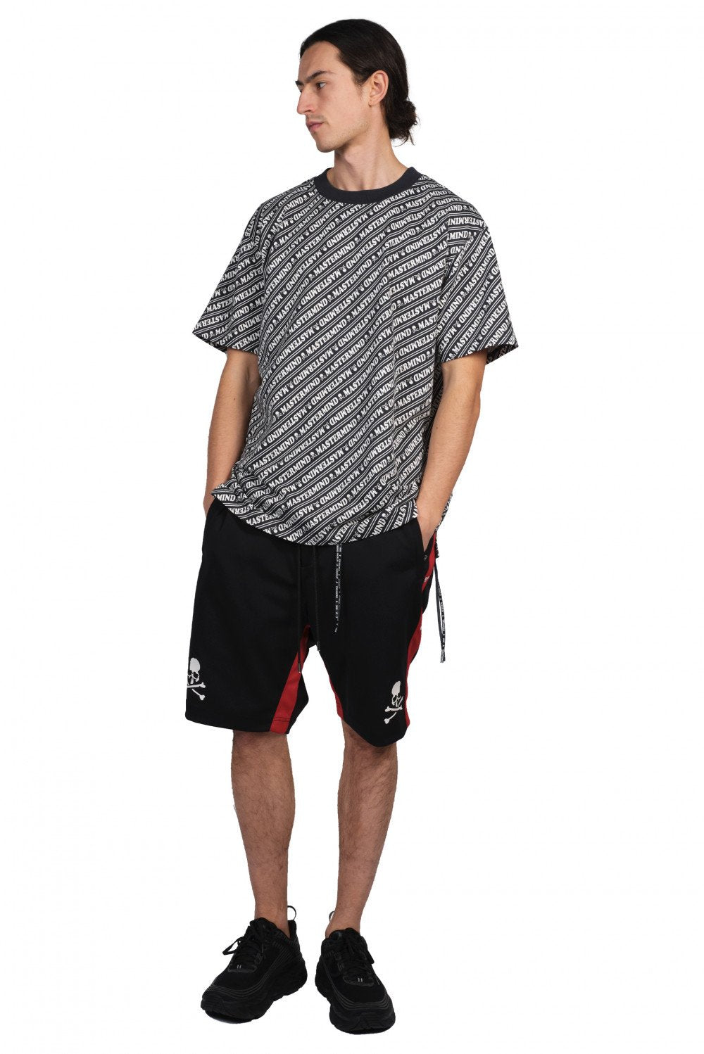 Mid-rise with four-pocket styling. Drawstring and D-ring hardware at elasticised waistband. Mastermind text print on side red stripe in white. Skull and crossbones print on front of each leg. Logo-engraved silver-tone hardware