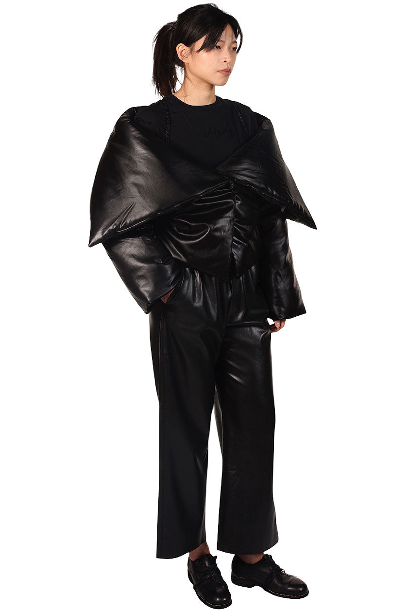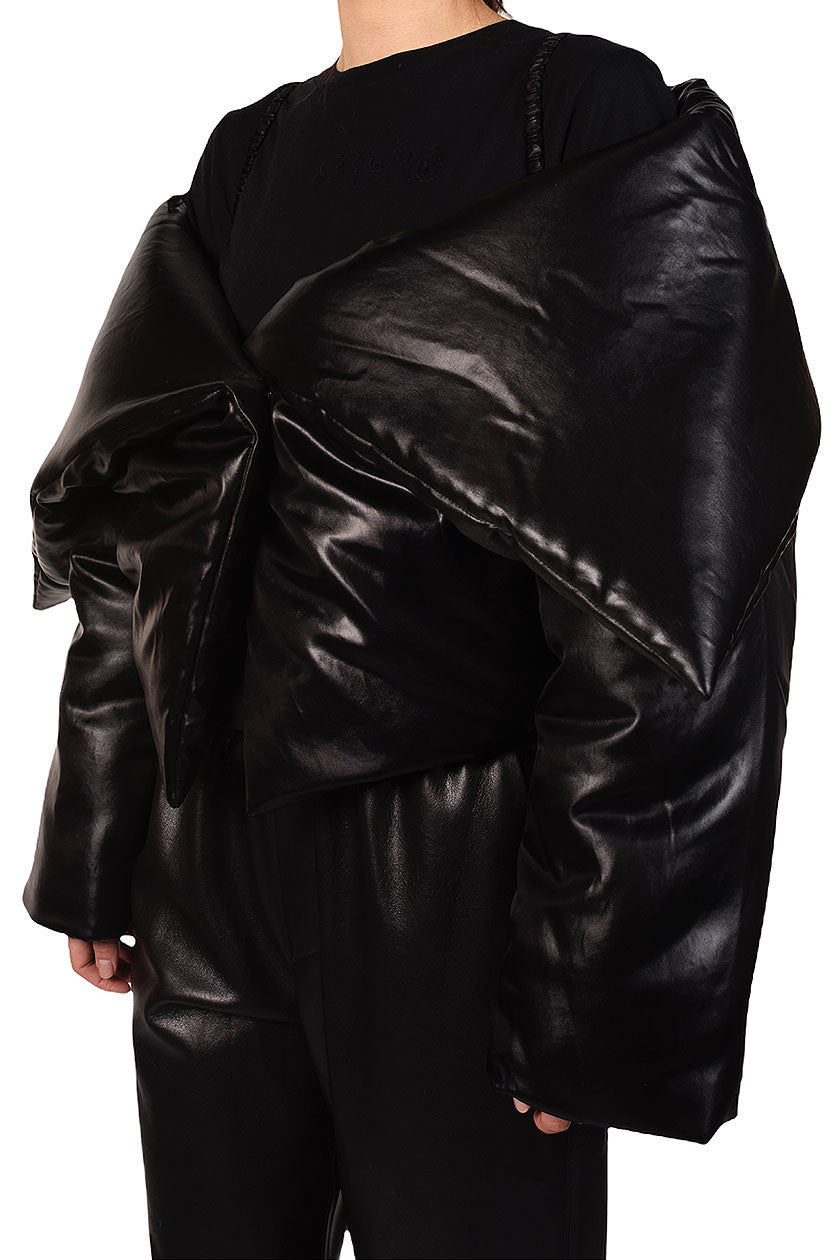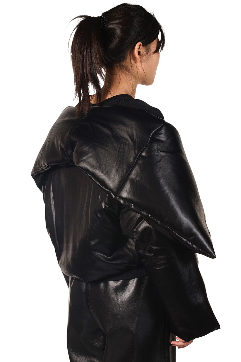 Black Slip Satin Puffer Jacket. Long sleeve insulated triacetate-blend satin puffer jacket in black. Open spread collar. Elasticised shoulder straps. Single press-stud closure at front.