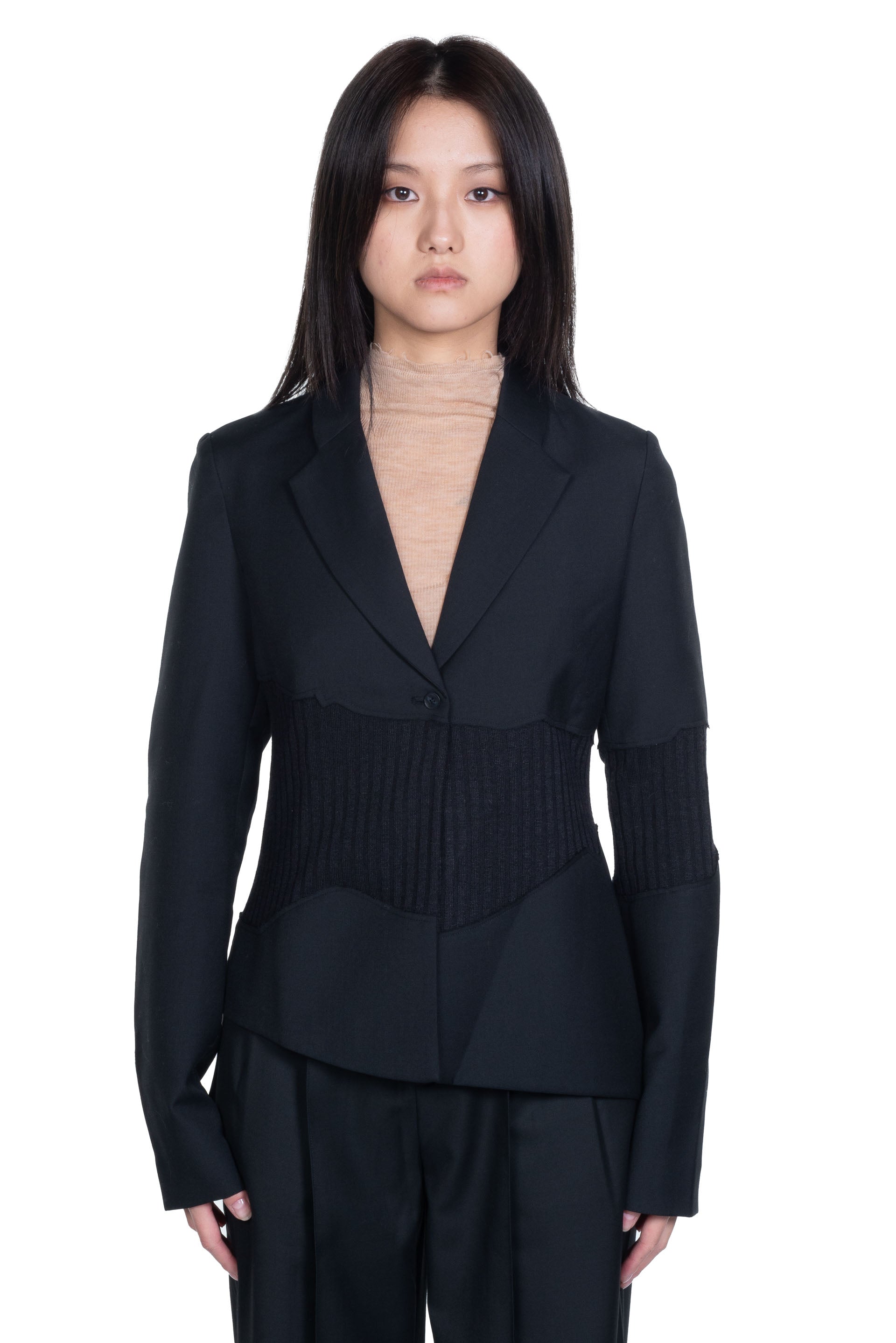 ii delivers a sense of originality, simplicity, spontaneity and a hint of childlike innocence pushing boundaries among ages to present qualitative collections with timeless touches designed for independent individuals as seen with the Black Smart Cut Suit Jacket. Long sleeves. Button closure at front. Mixed fabric patchwork.
