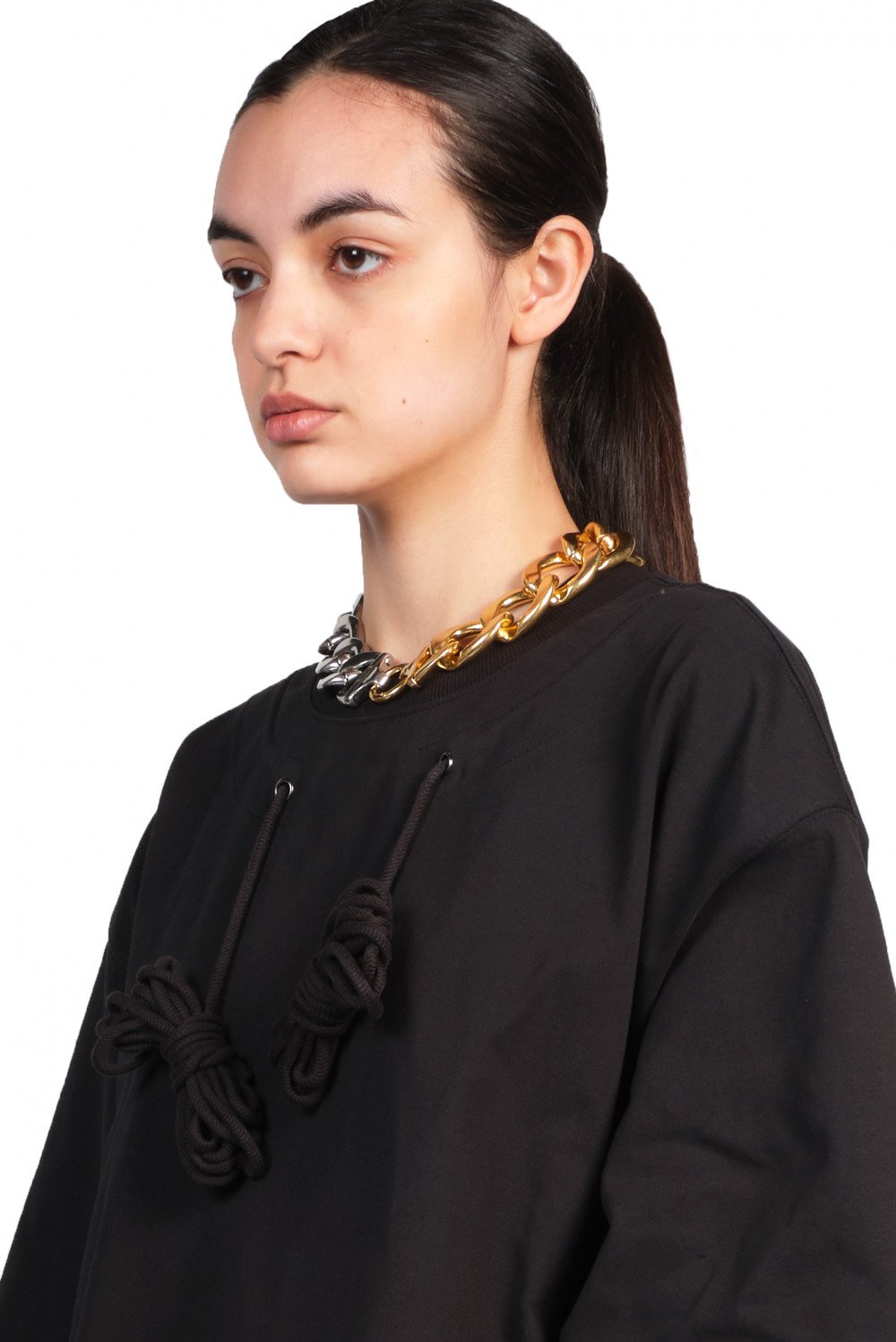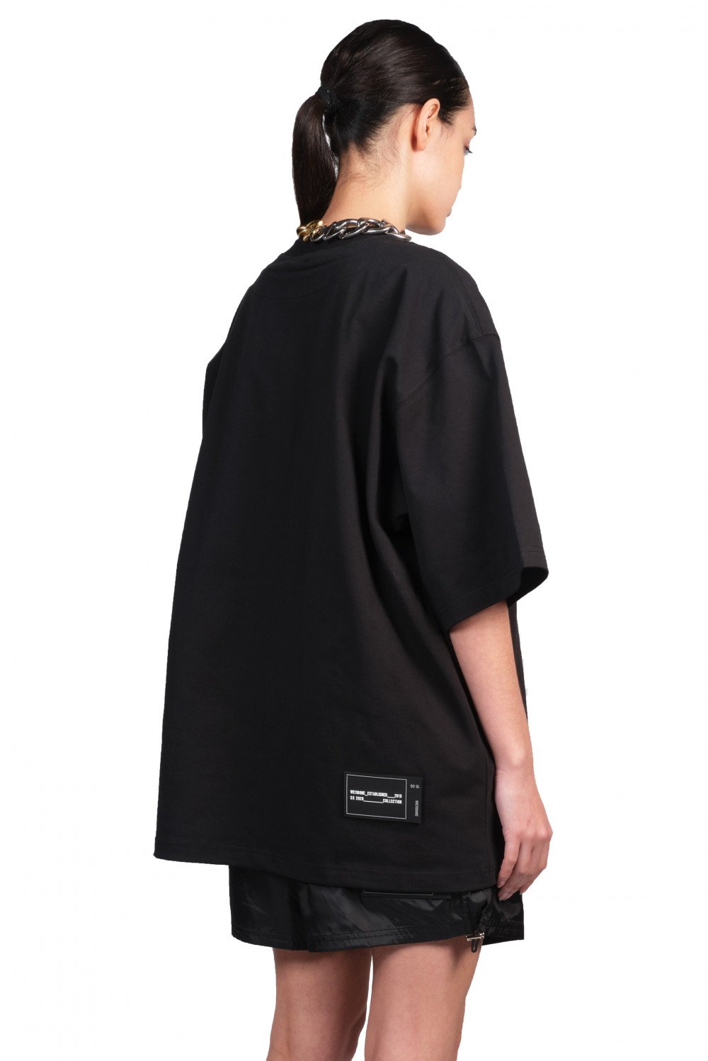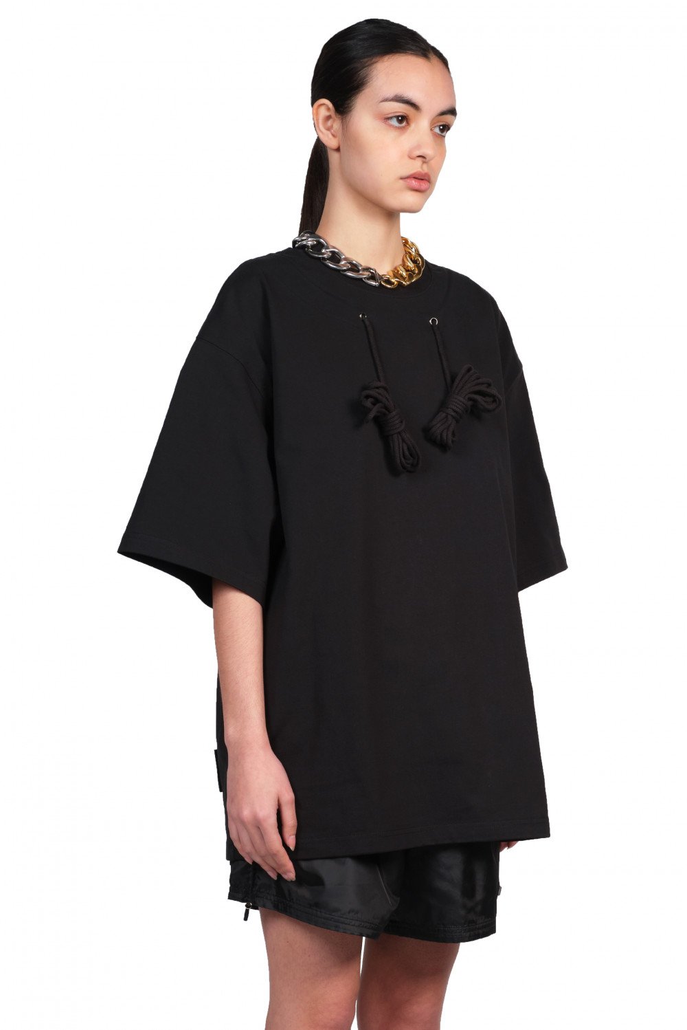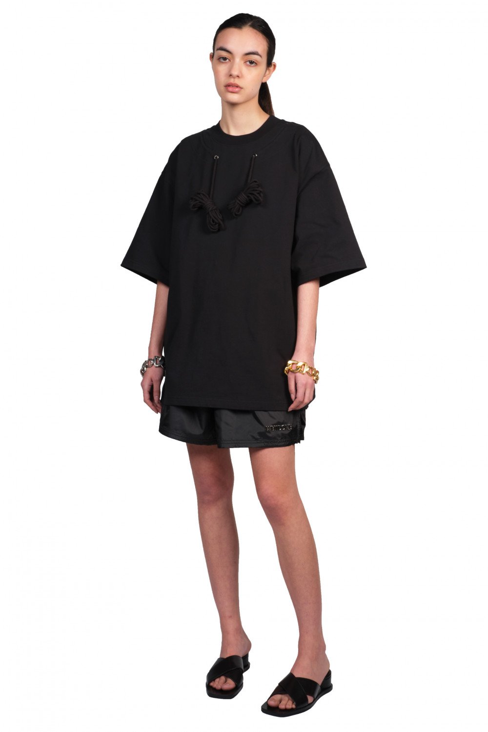 A collection of athleisure and streetwear-inspired silhouettes, merging loose-fitting styles with late 1990’s and early 2000’s refinement and understated sophistication as seen in the We11Done Black T-shirt with Drawstring and Chain Detail.