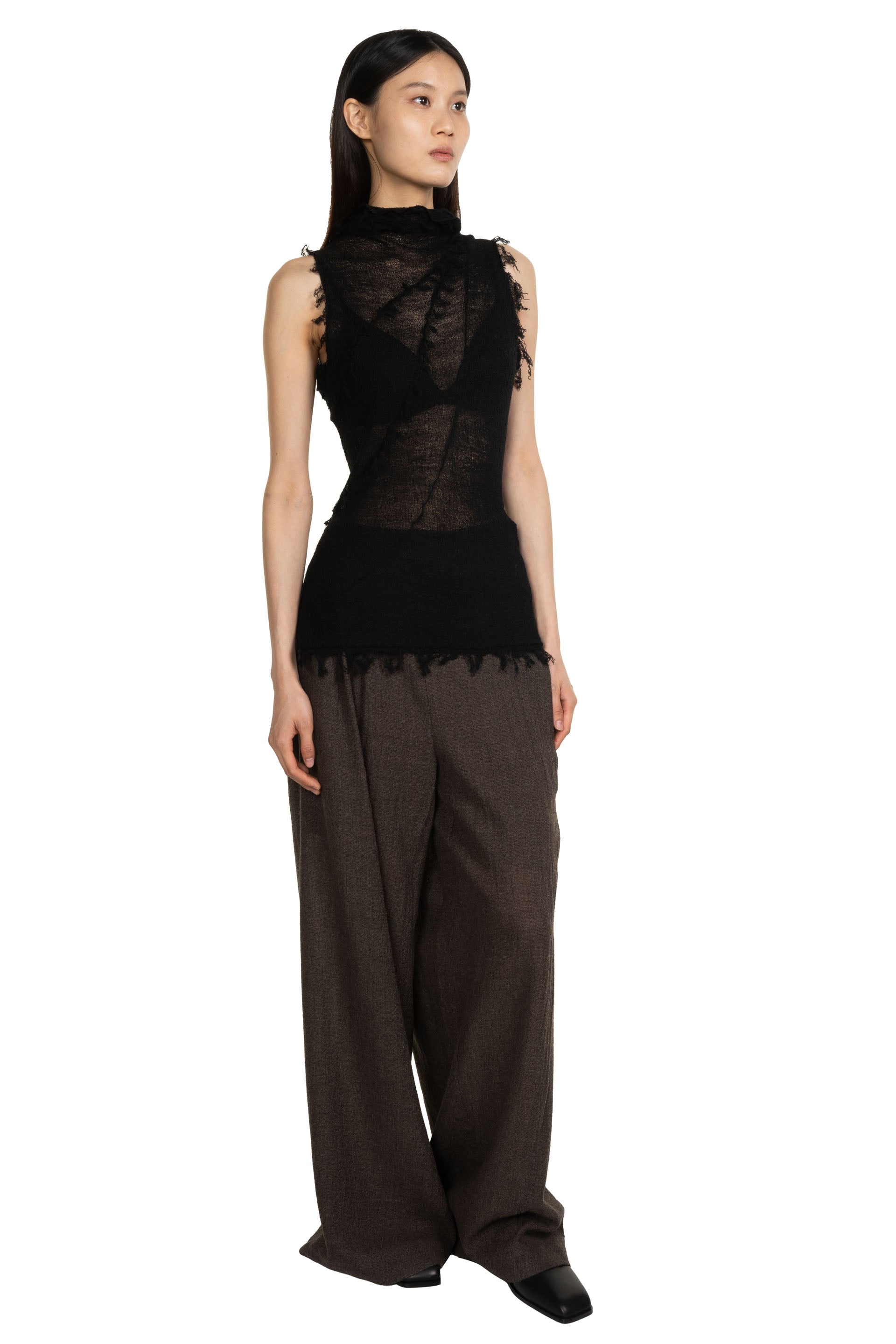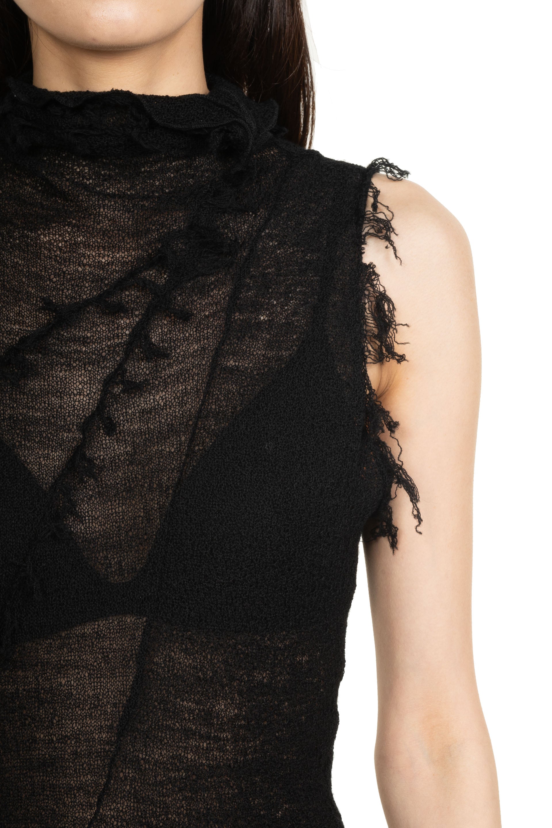 Yehuafan Black Tank Top. Asymmetric tank top in black. Sleeveless. Soft textural fabric. Fraying details throughout.