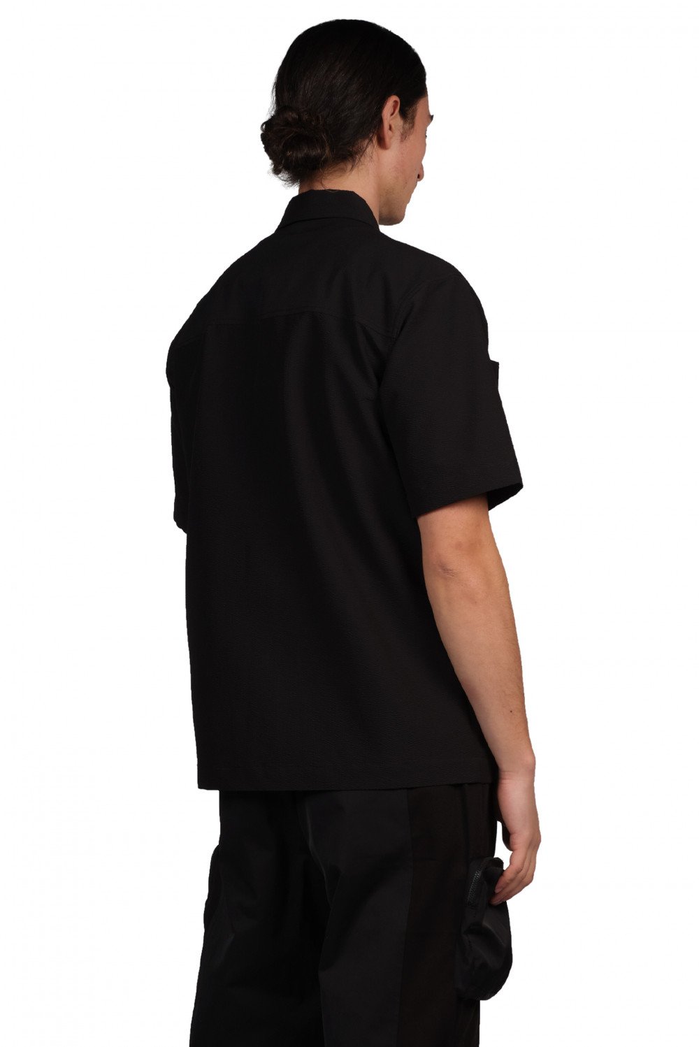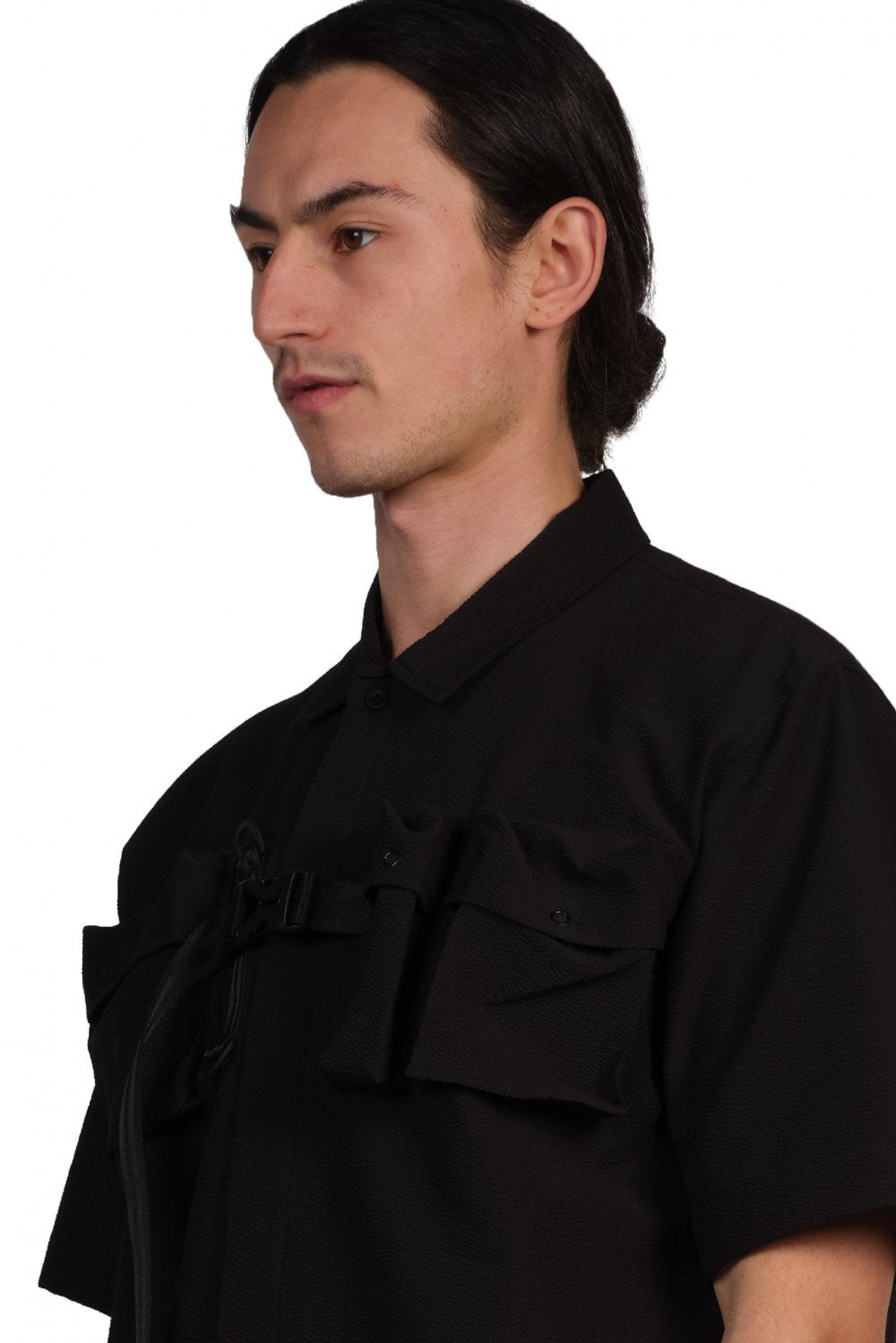 Classic shirt collar. Short sleeves. Concealed front button closure. Front buckle detail. Two breast pockets