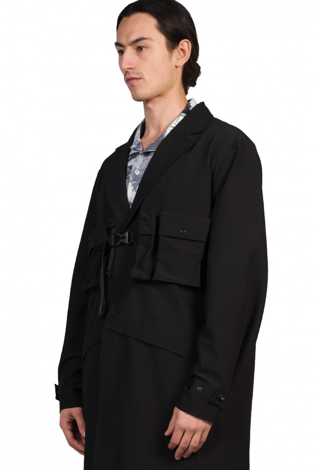 The brand’s Spring/Summer 2020 collection is based around the Korean institution of chaebols, the massive industrial conglomerate companies often controlled by their original founding families, which have traditionally exerted a powerful influence over Korea’s socioeconomic life. Each piece is made in Seoul, utilising a combination of Korean fabrics, techniques, and a mix of modern and traditional design aesthetics as can be seen in the IISE Black Utility Trench Coat.
