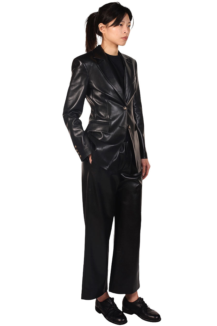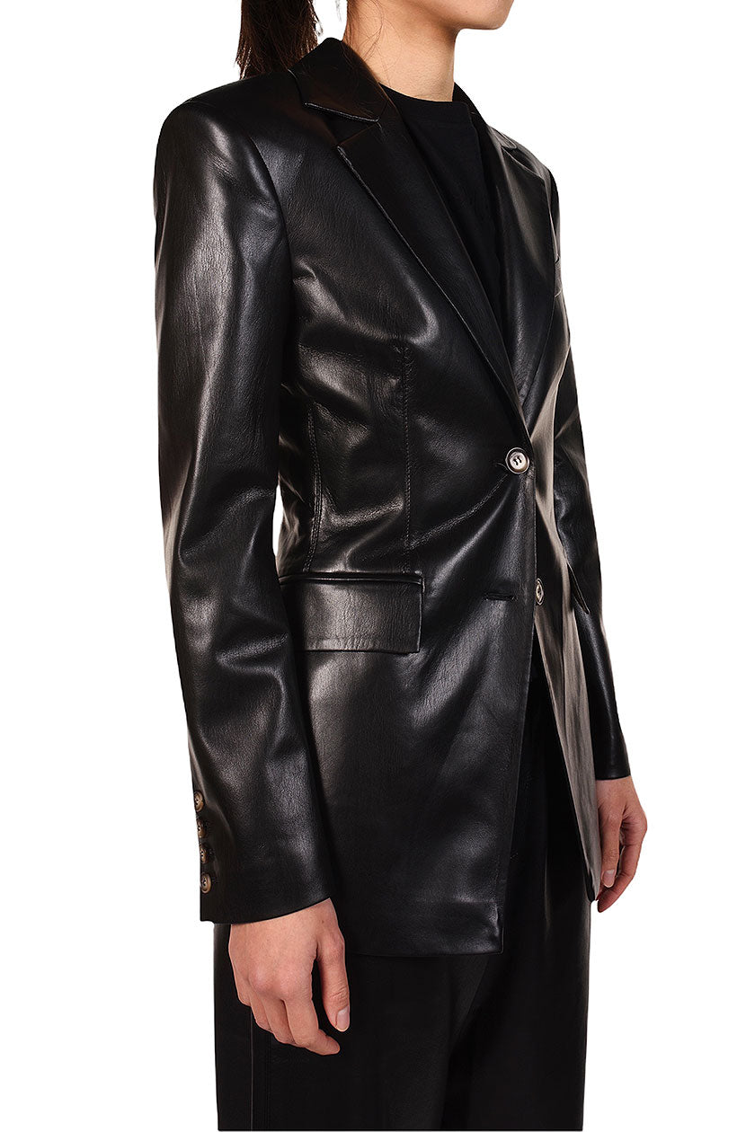 Black Vegan Leather Hathi Blazer. Long sleeve grained faux-leather blazer in black. Notched lapel collar. Button closure at front. Welt pocket at chest. Flap pockets at waist. Four-button surgeon's cuffs. Central vent at back hem. Viscose satin lining in beige. Fully lined. Tortoiseshell hardware.