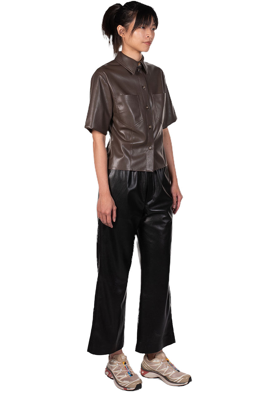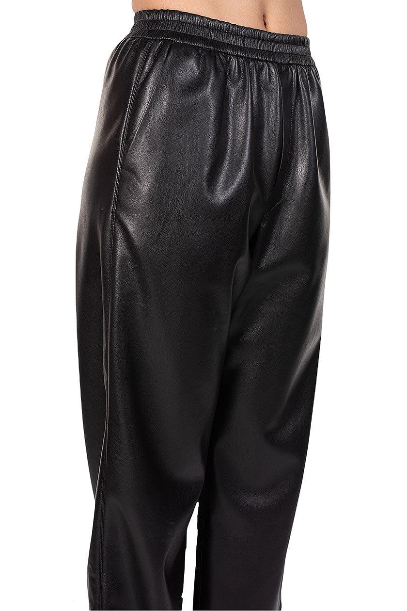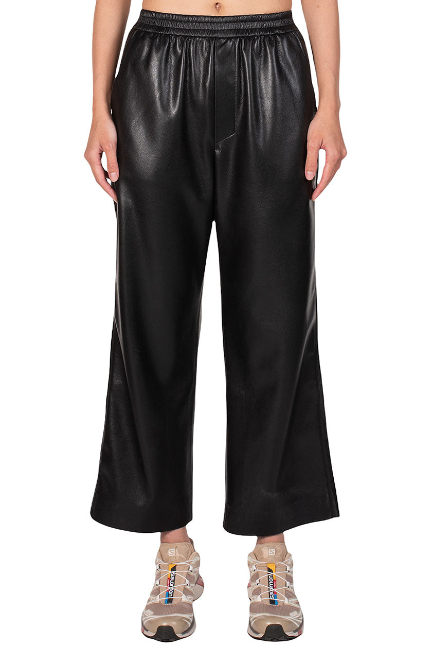 Black Vegan Leather Odessa Trousers. Relaxed-fit grained faux-leather trousers in black. Mid-rise. Four-pocket styling. Elasticised waistband. Colour: Black. Composition: 65% polyester, 35% polyurethane.