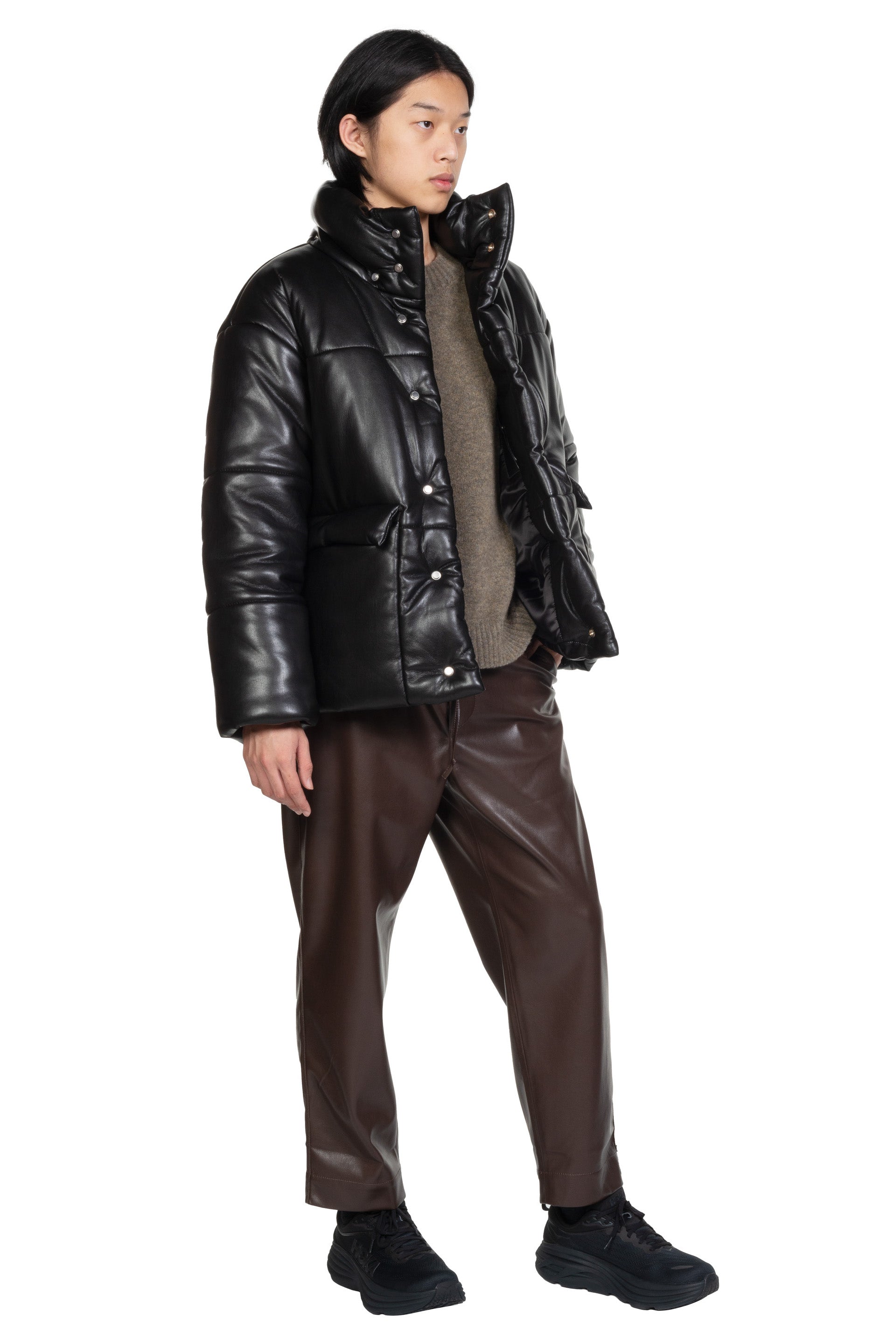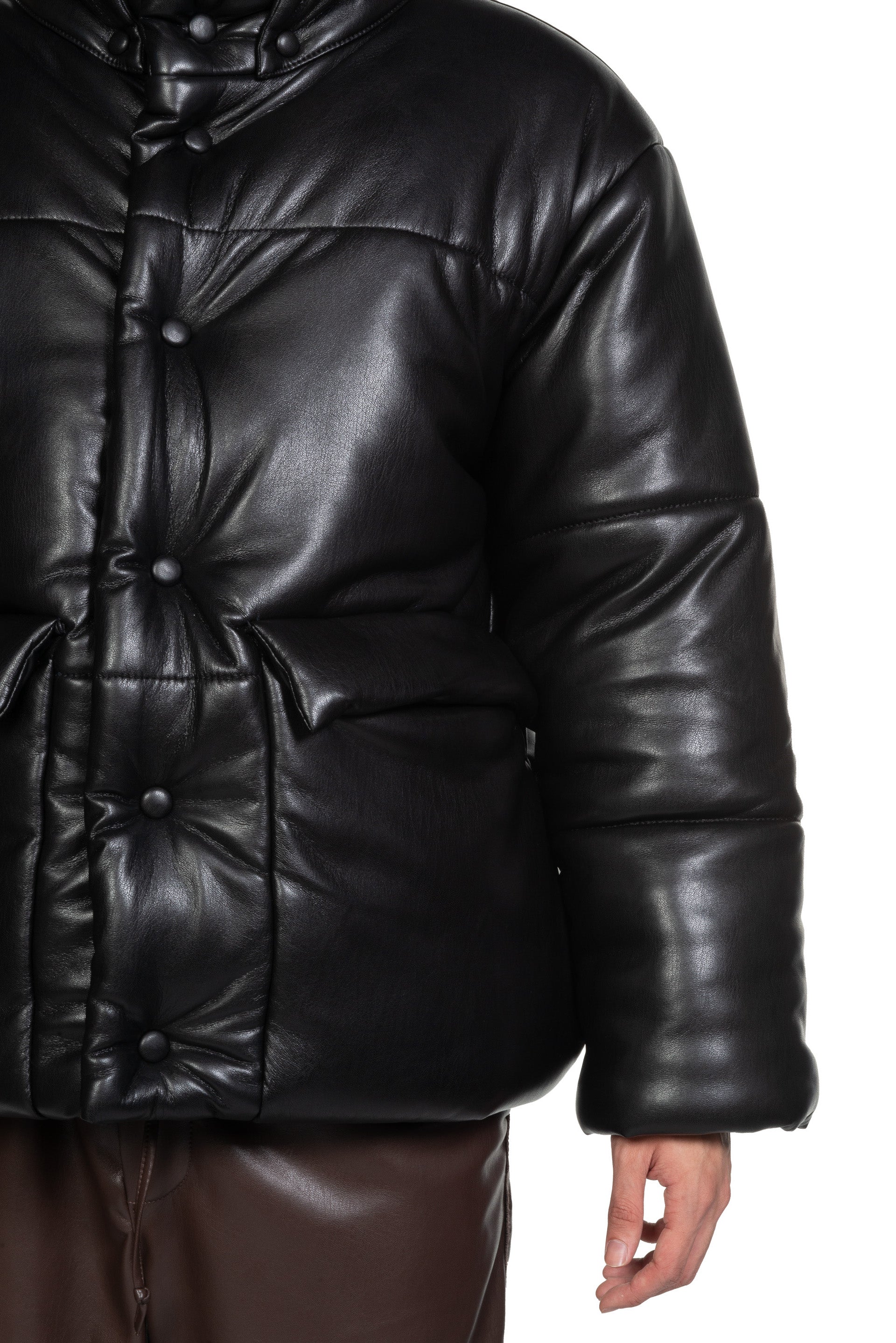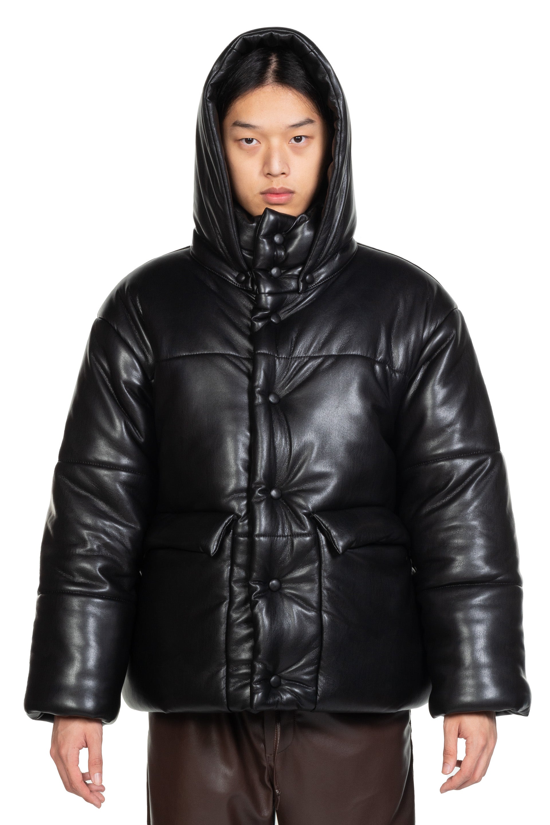 Black Vegan Leather Puffer Jacket. Long sleeve insulated faux-leather jacket in blue. Attachable hood with press-stud fastening. Fully lined.