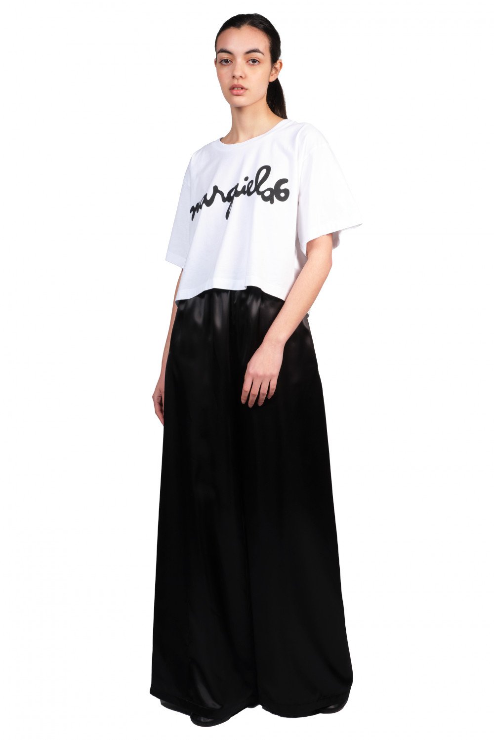 MM6 is known for its sporty ready-to-wear and off-beat accessories, more casual, street-inspired take on the Maison's intellectual approach to luxury as seen in the MM6 Black Wide Leg Trousers.