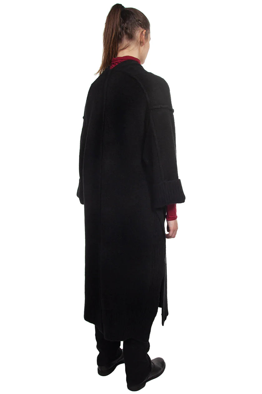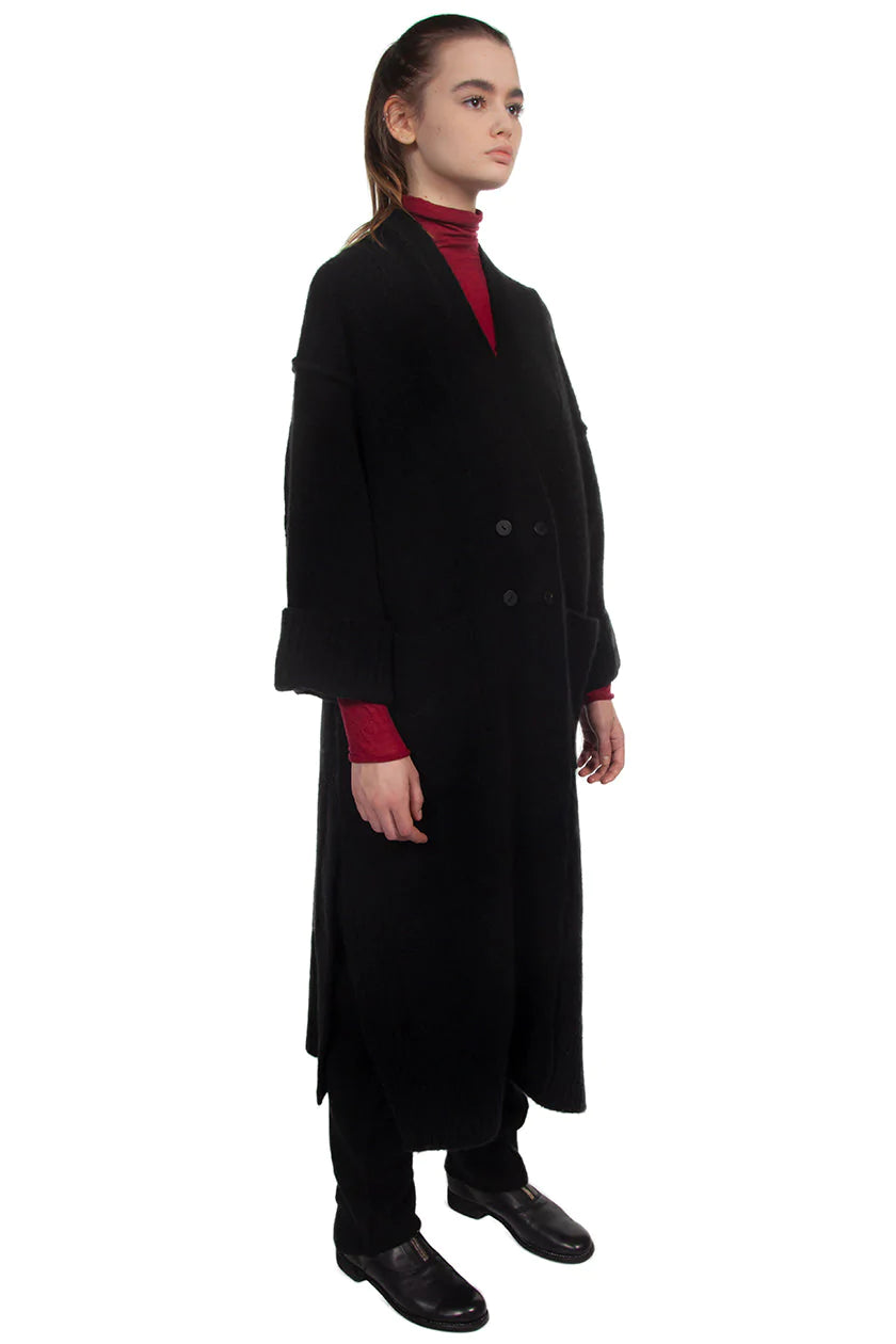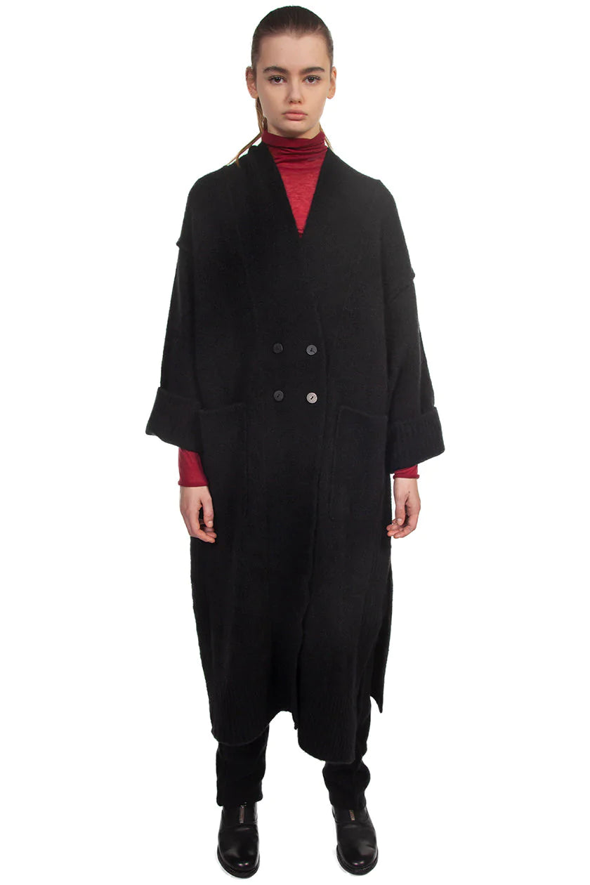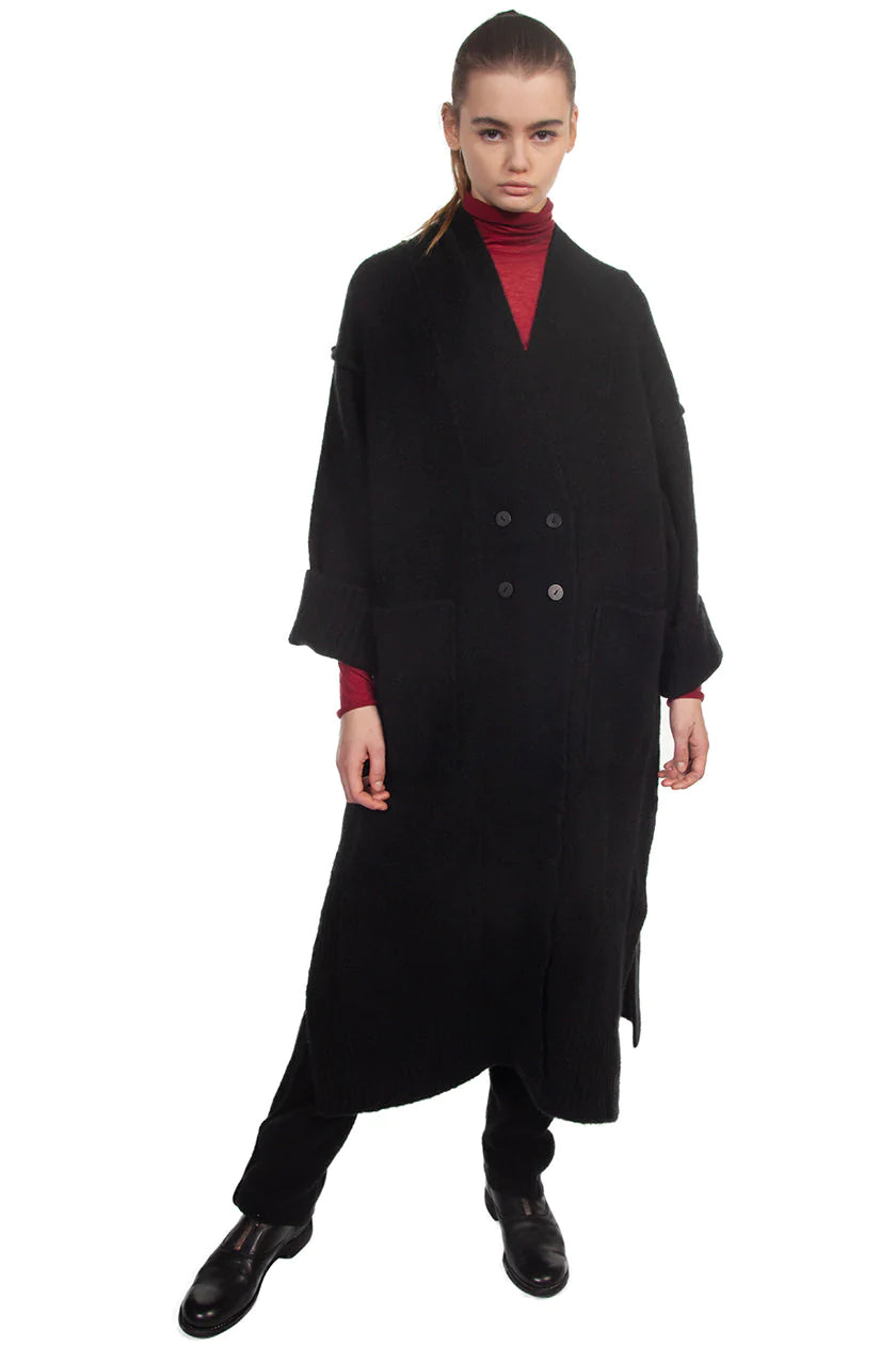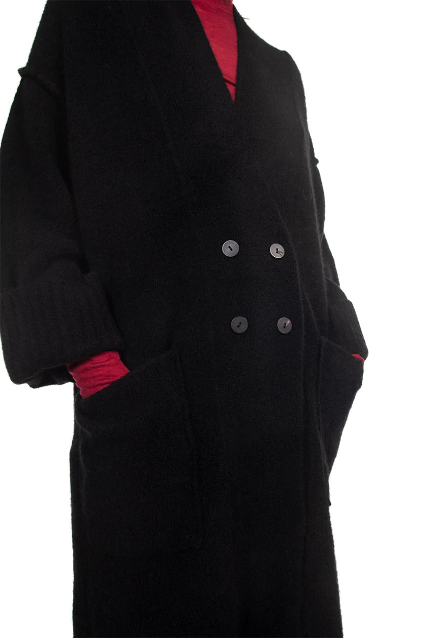 Double breasted yak knit long coat with pockets and external stitching details. Horn buttons closure. Regular fit.