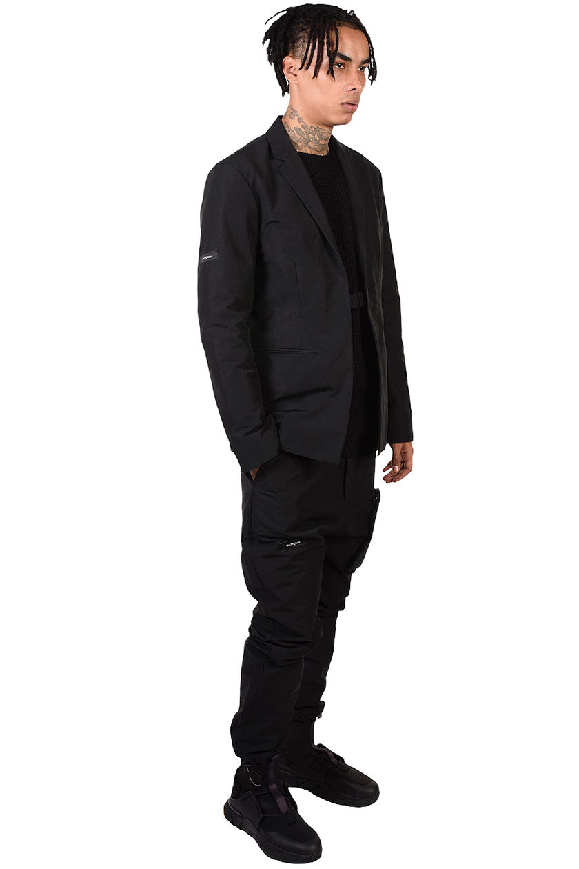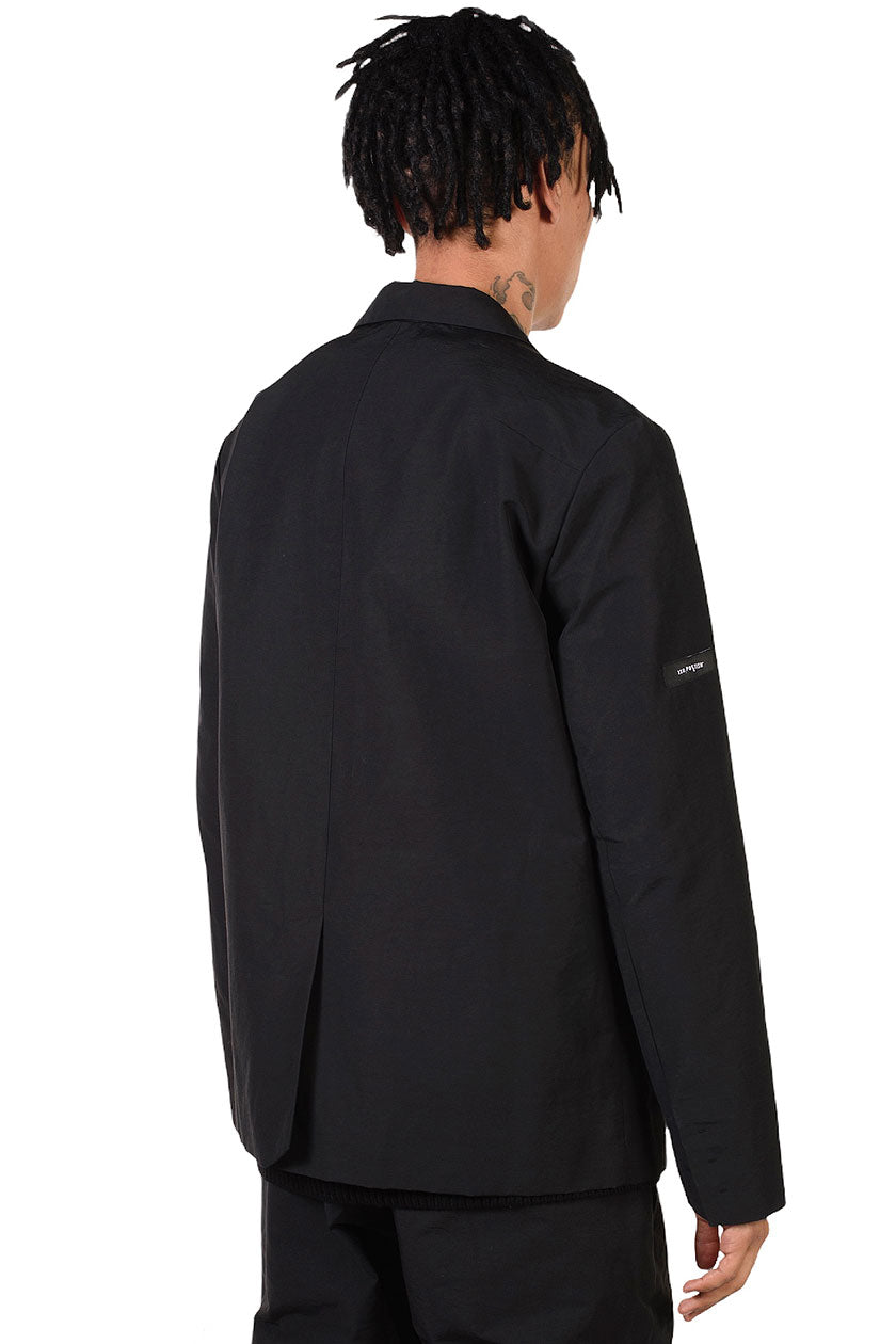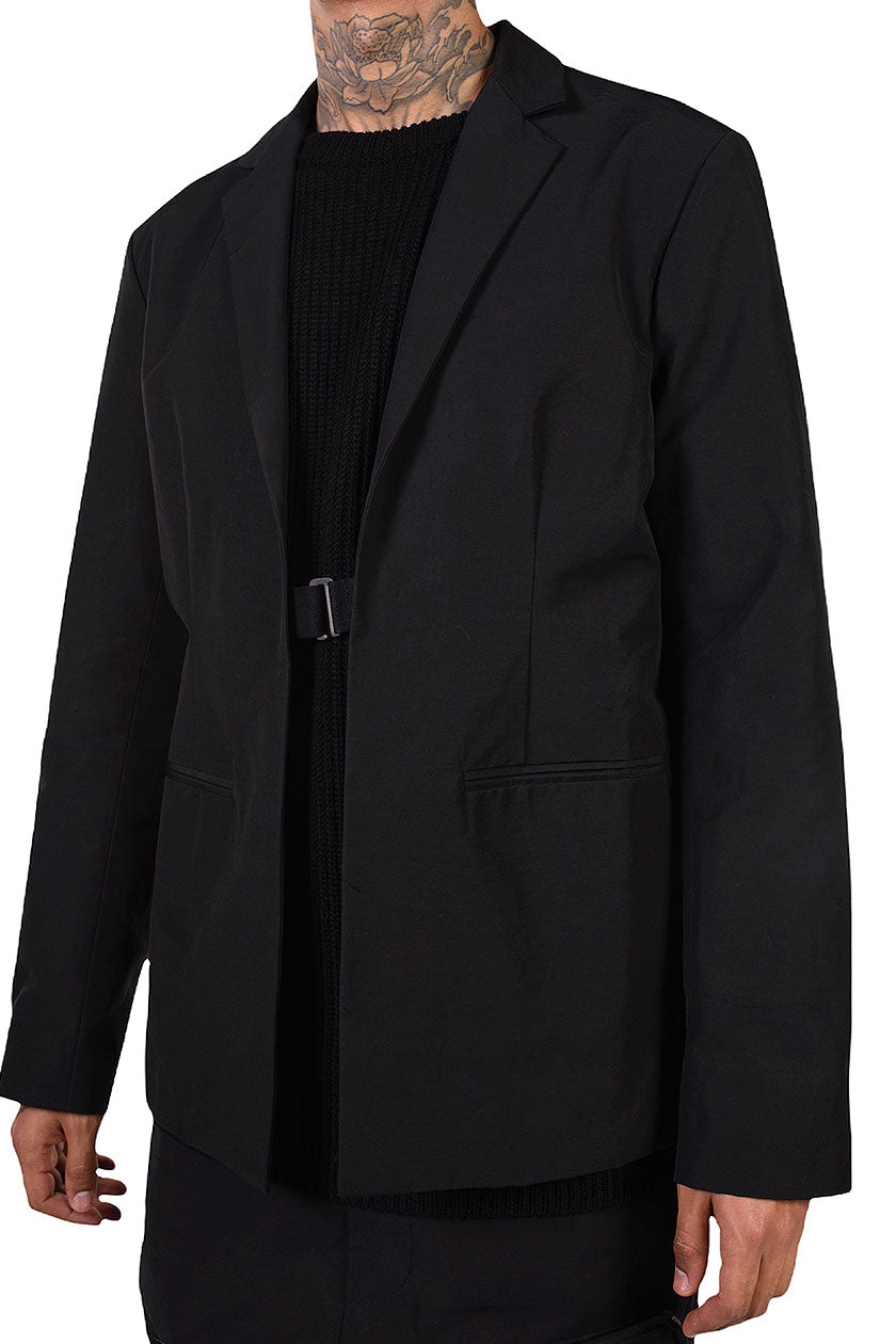 Loose fitted men's blazer. Notch lapel construction. Single vent. Straight hem. Logo patch is topstitched on upper right sleeve. Two double welt front pockets. Hidden metal G-hook closure w. canvas band. Inside pocket w. a button placket closure.