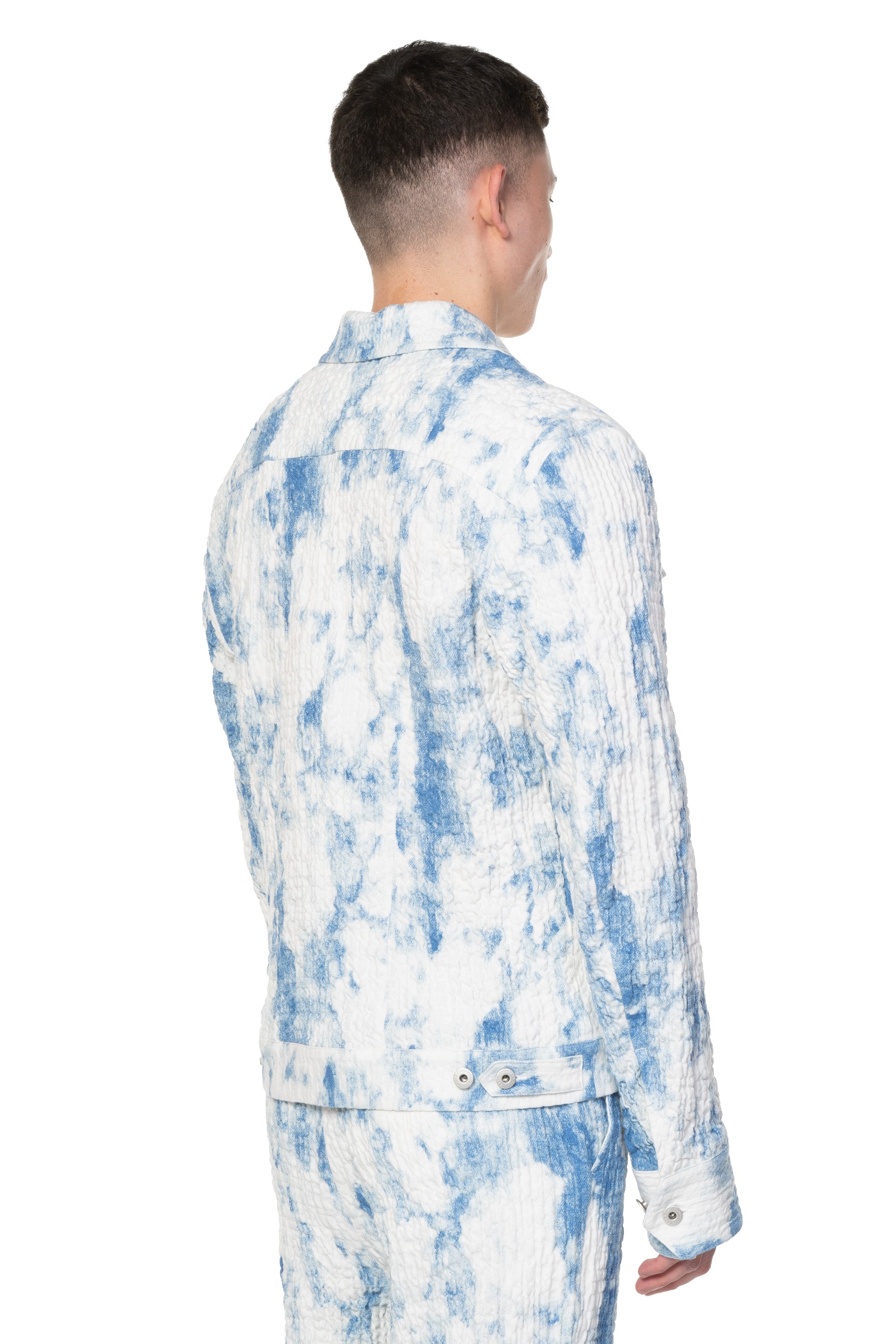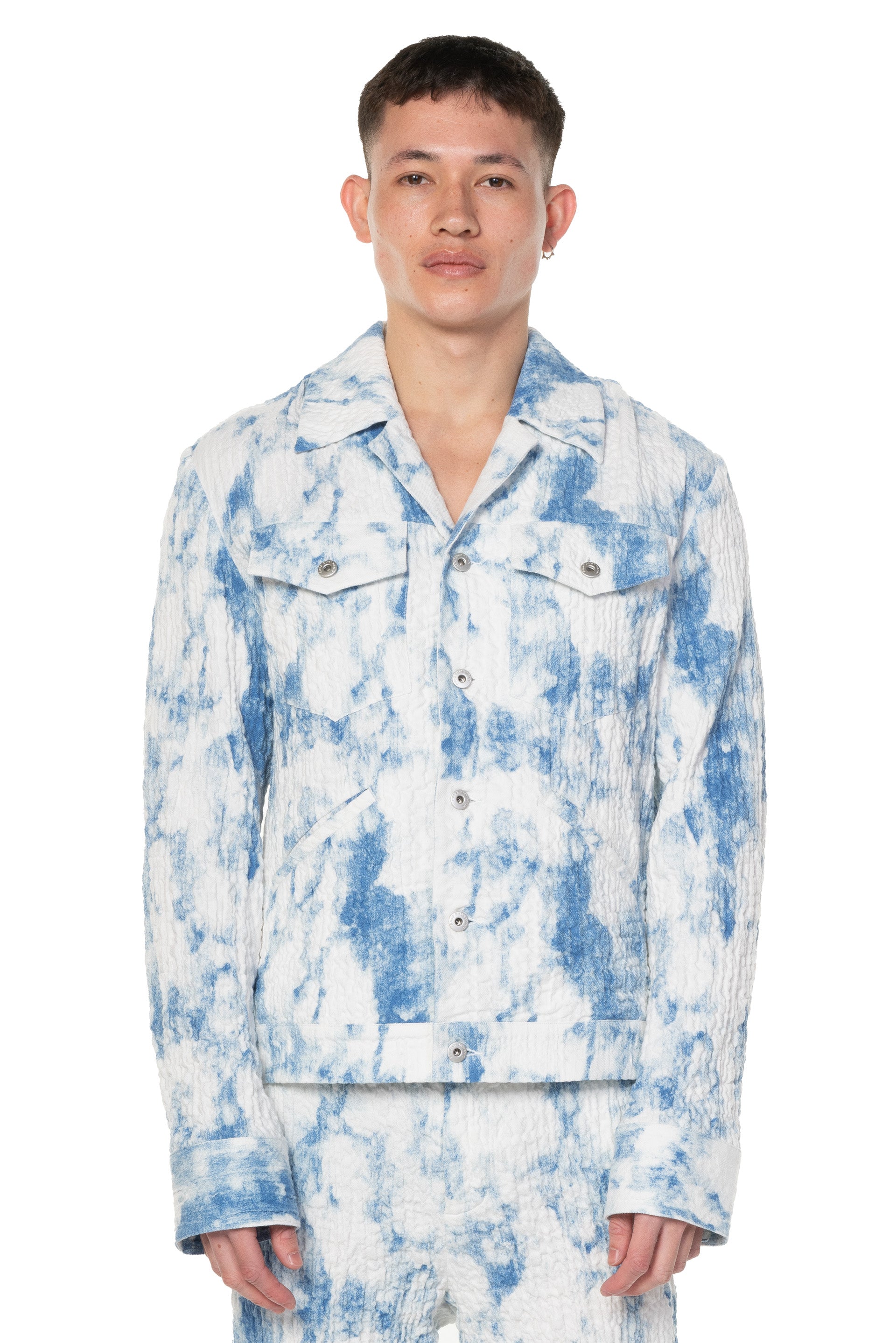 Button closure at front. Regular fit. Long sleeves. Open Collar. Two pockets at chest. Two pockets at side. Cloud sky textural fabric.