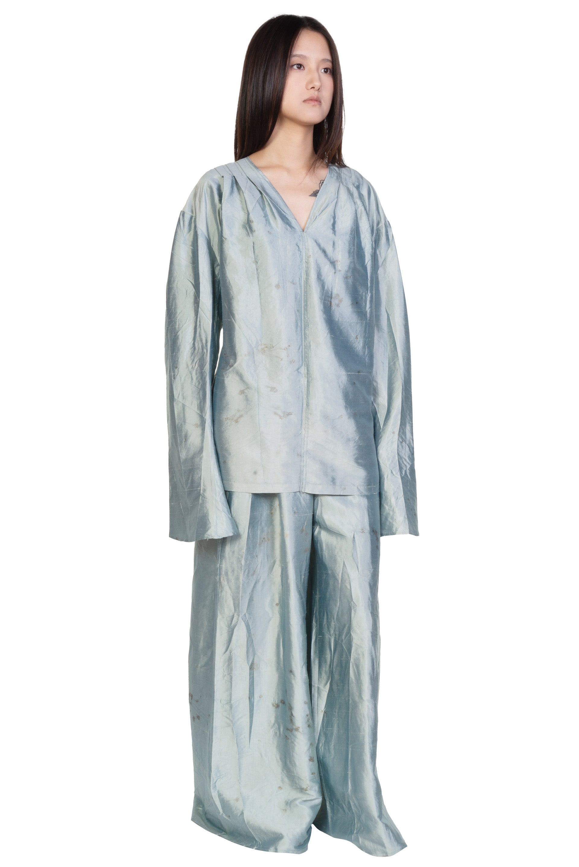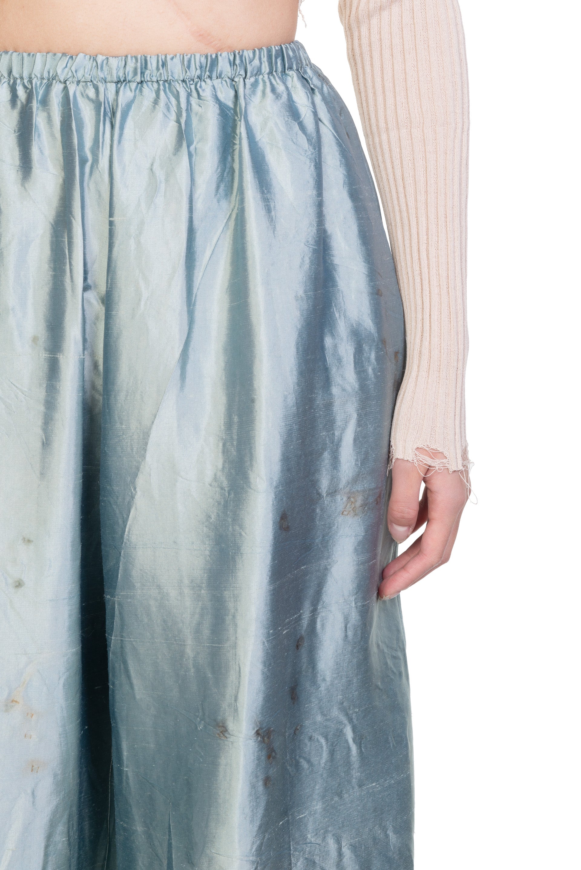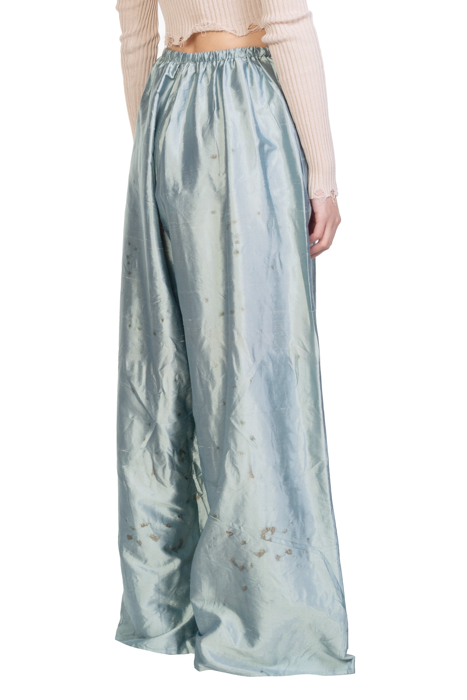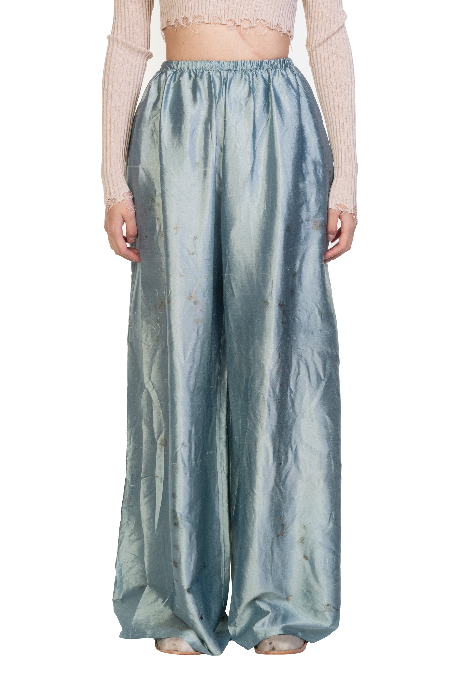 Elastic wait. Two side pockets. Blue dyed silk fabric. Wide leg.