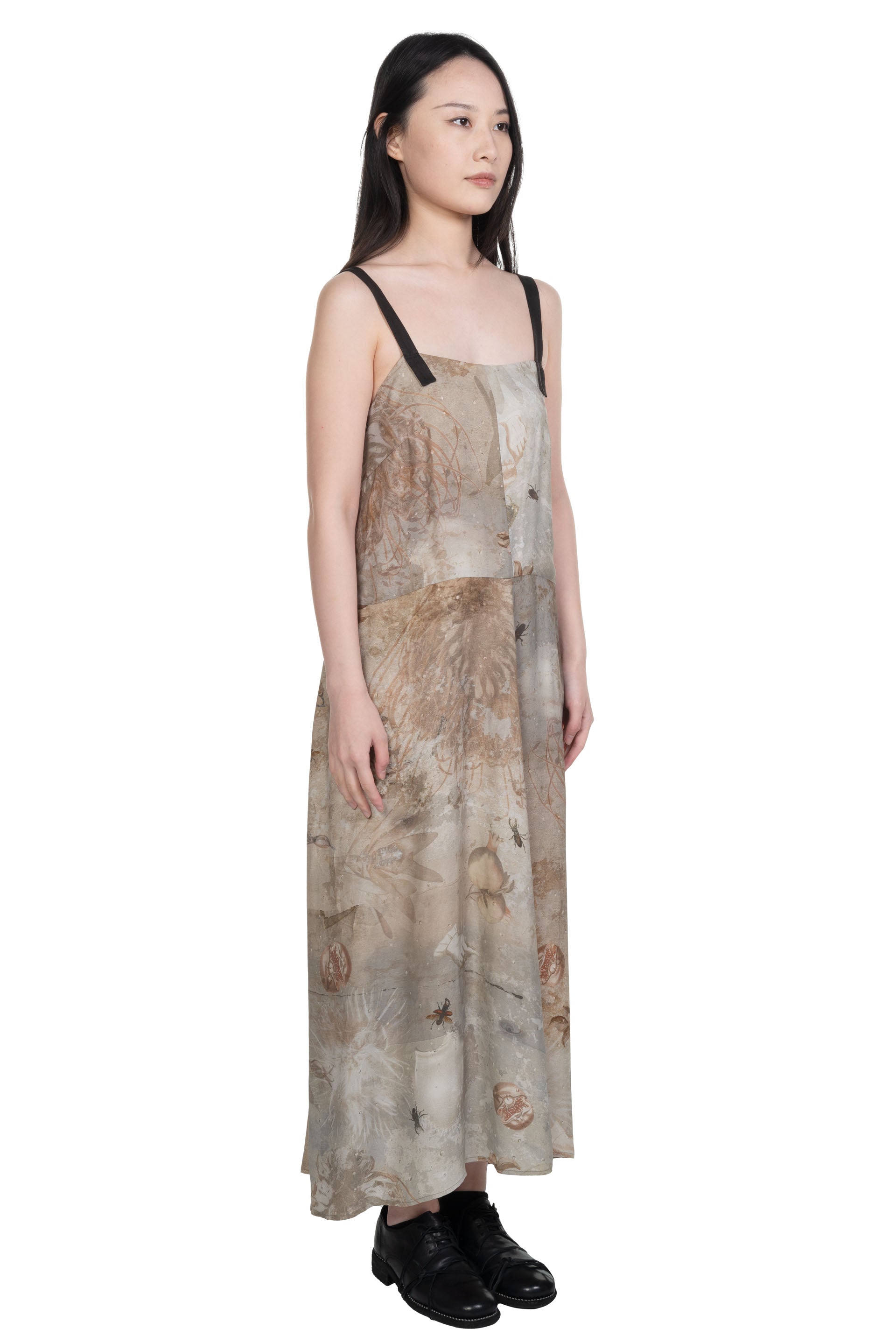 Full length. Regular fit. Open back with small pleats in the centre. Adjustable shoulder straps. Digital printed viscose twill with a crisp hand feel.