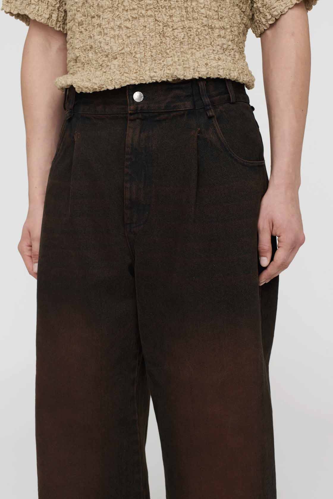 First introduced in 22.2 ‘Les Olympiades’, this pant features a single front pleat that lends subtle volume through the leg while maintaining a clean line. This iteration is constructed in a overdyed, washed denim that softens with wear, offering structure without stiffness. Featuring metal stud fastening, double stitched seams and a raw hemline. Finished with a raw hem. Pant length is specially graded across all sizes to reduce the need for alterations.