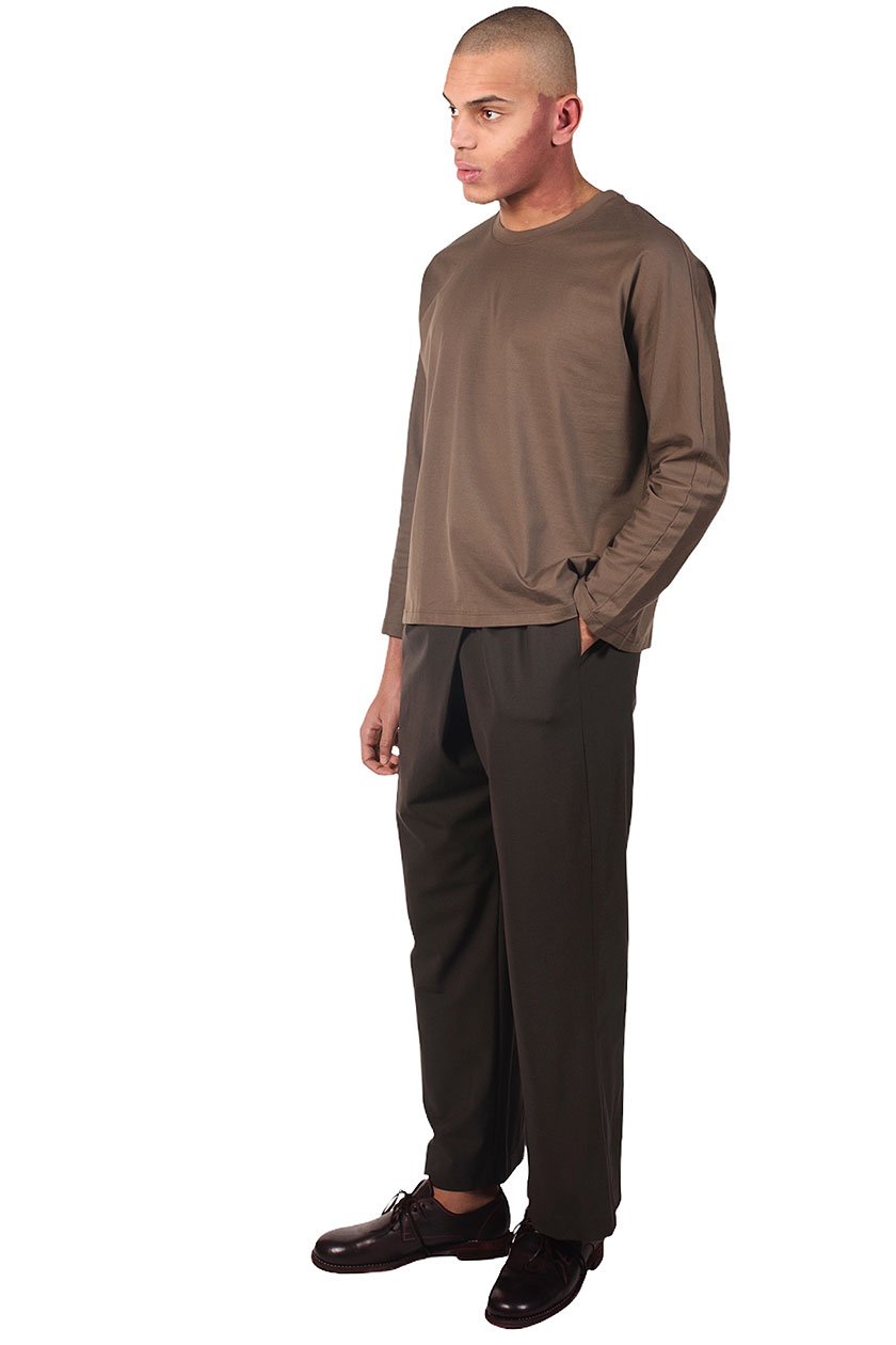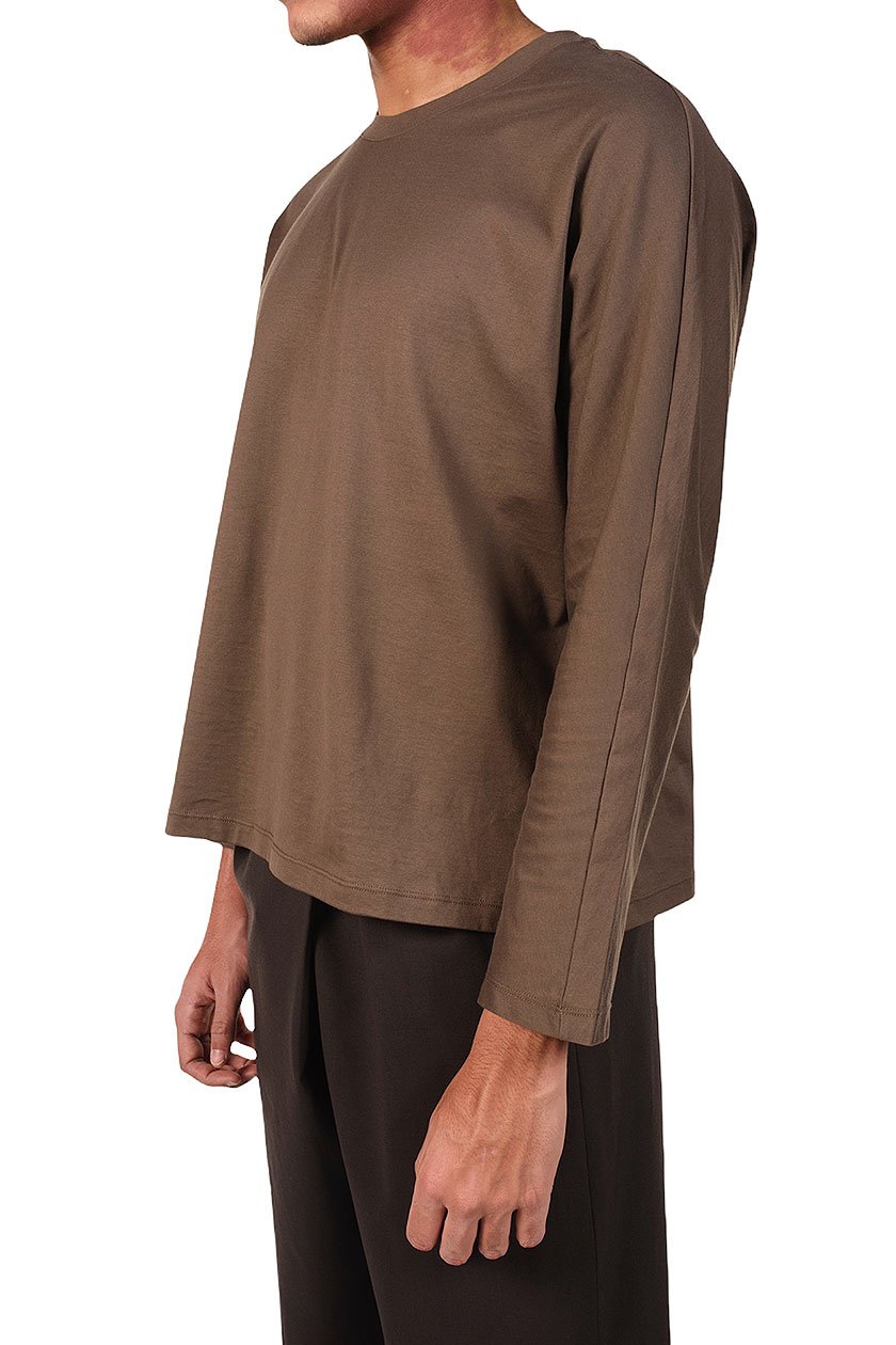 Brown T-shirt. Dropped shoulders. Long sleeves.