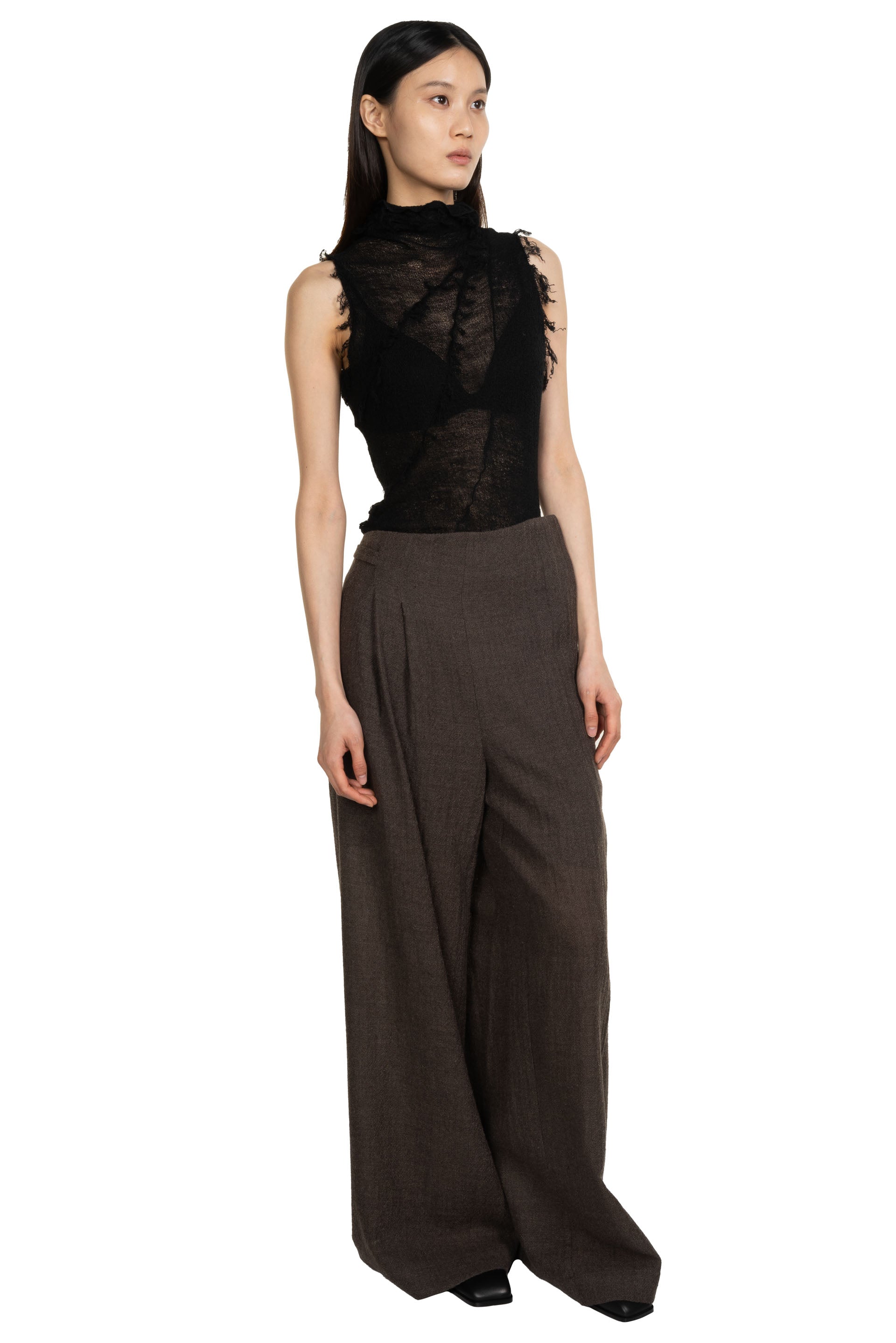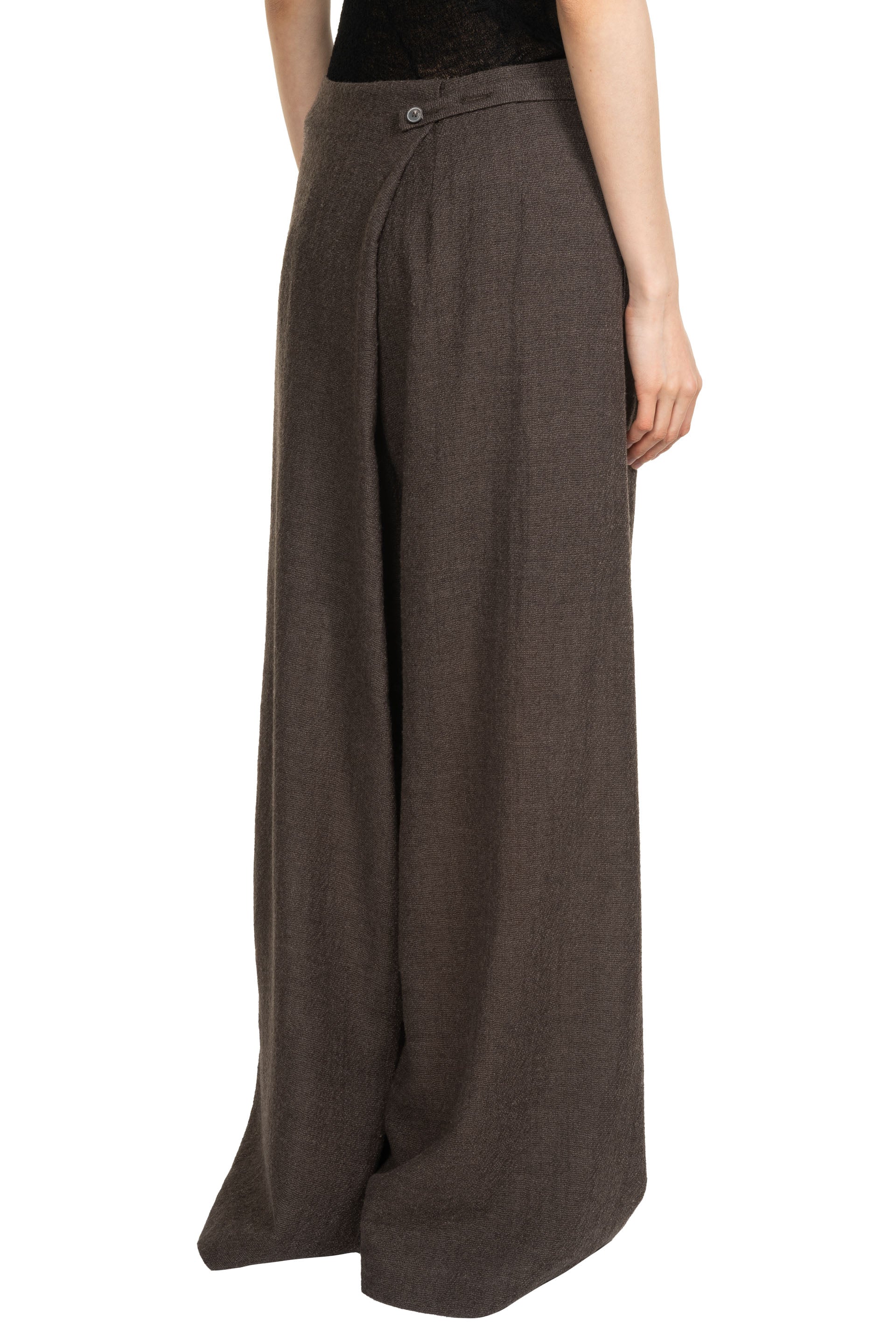 Yehuafan Brown Trousers. Wide leg. Soft textural light knitted fabric. Pleats at side and back. Button closure at back and side. Two side pocket.