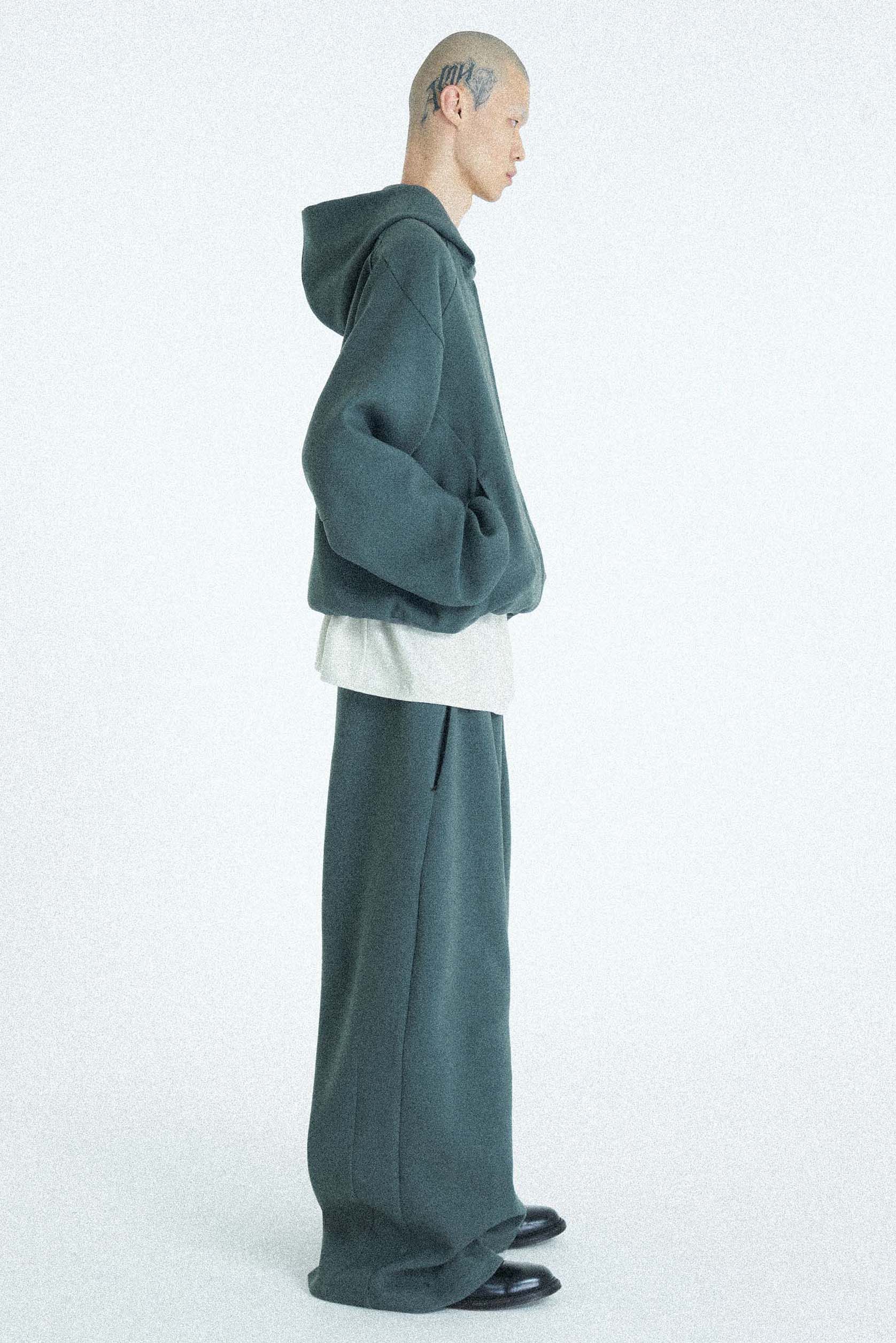 Green hoodie. Long sleeves. Two side pockets. Double zip at front. Front zip closure. Oversized cut.