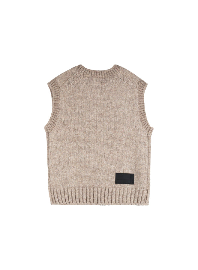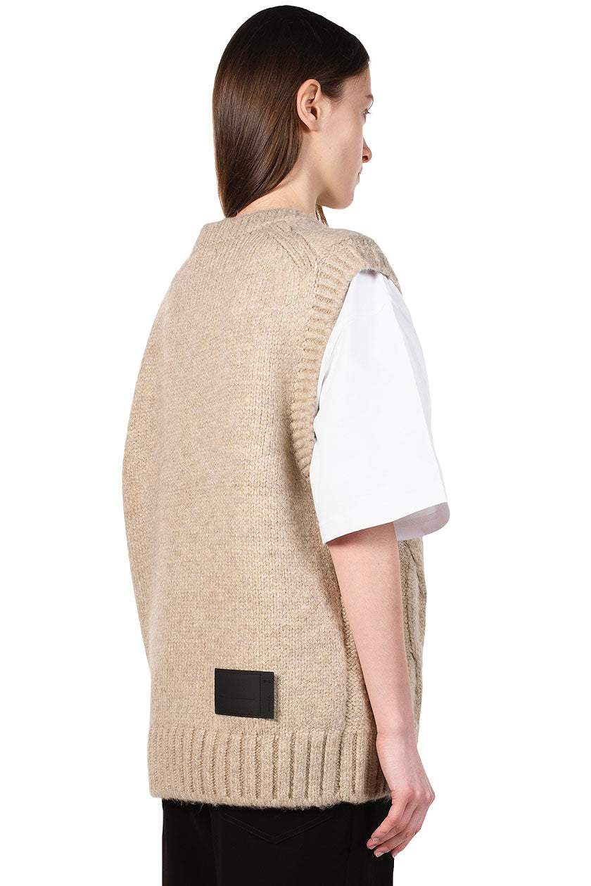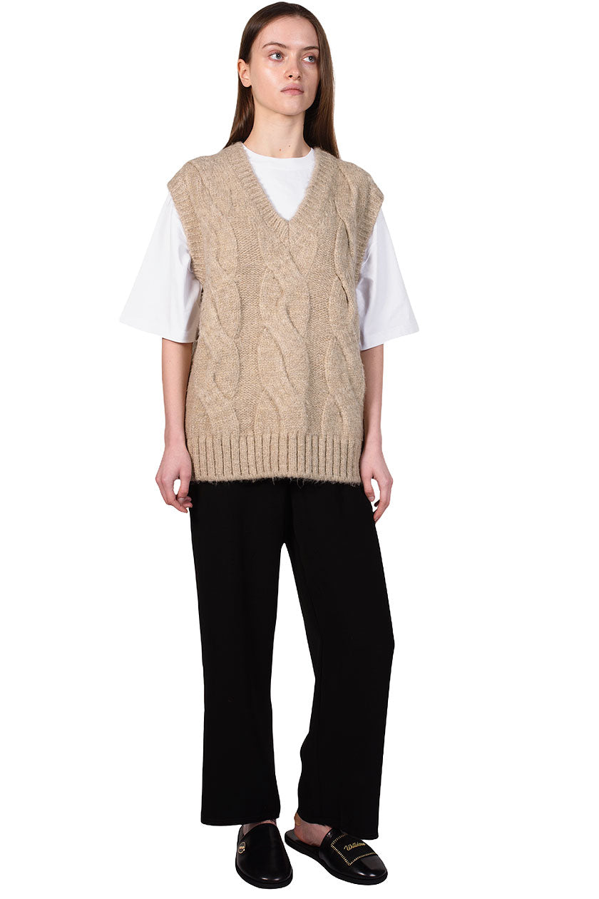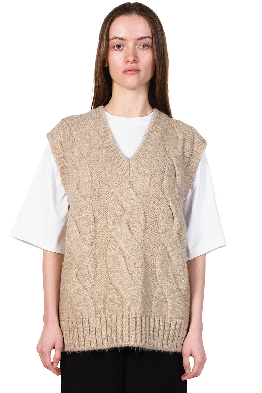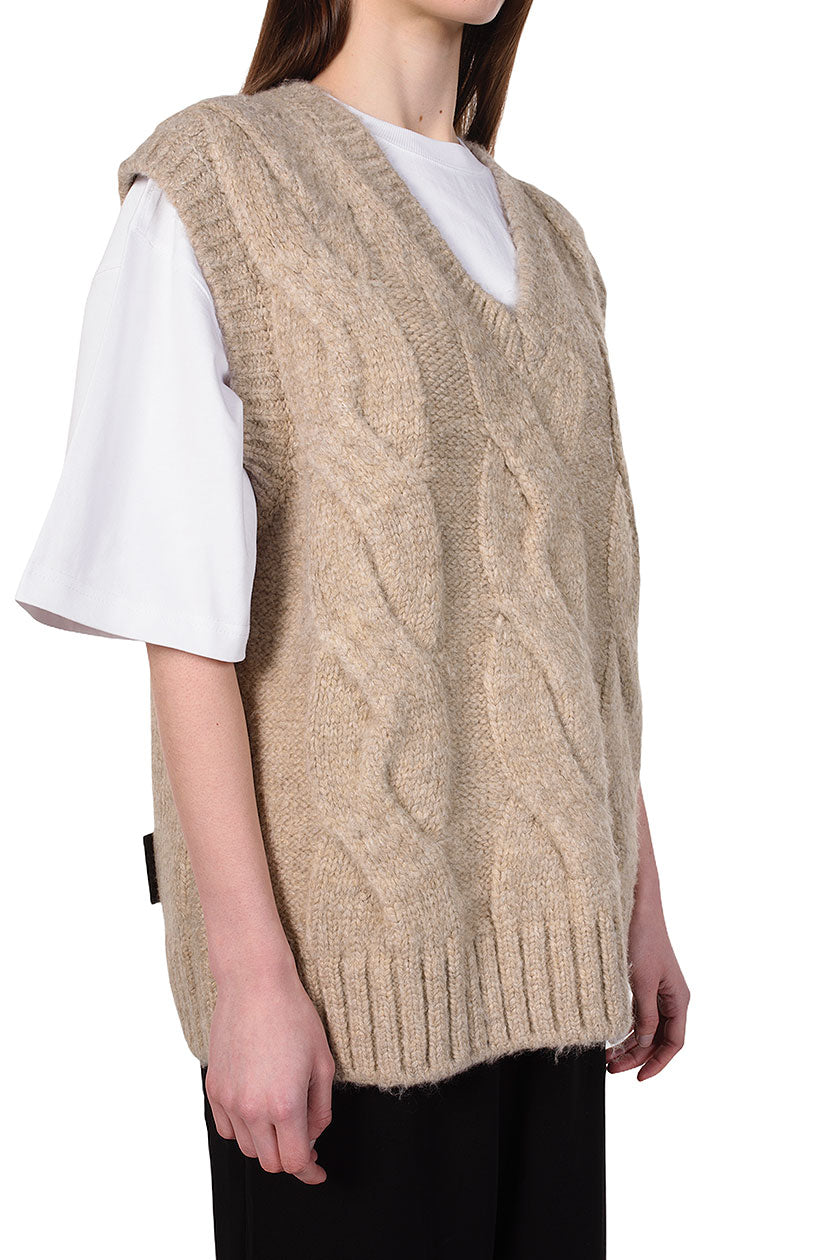 We11done sleeveless cable knit brushed wool-blend vest in beige. Rib knit V-neck collar, arms and hem.