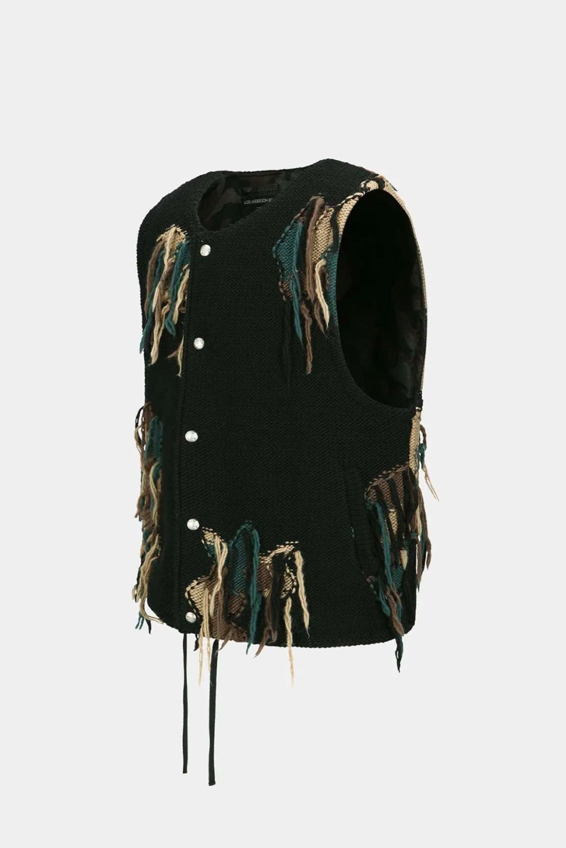 Camouflage Reversible Knit Vest. 3G roving wool, intarsia-fringed knitting. ADSB House developed camouflage printed fabric. 3M Thinsulate quilting. Snap closure. Built-in drawstring at the hem.
