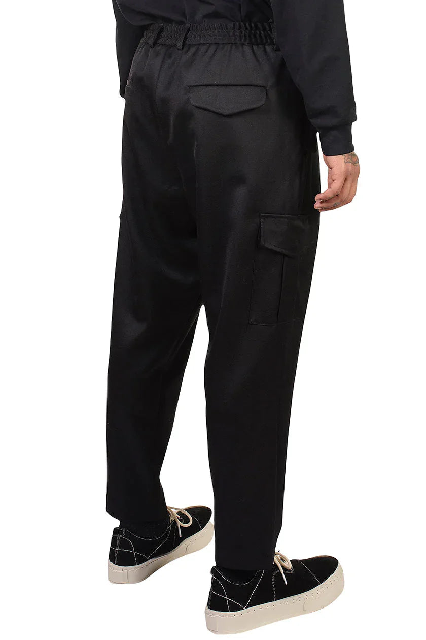 Lownn Cargo Pants in Black. Two side pockets. Elastic waist. Drawstrings at waist. Tappered.
