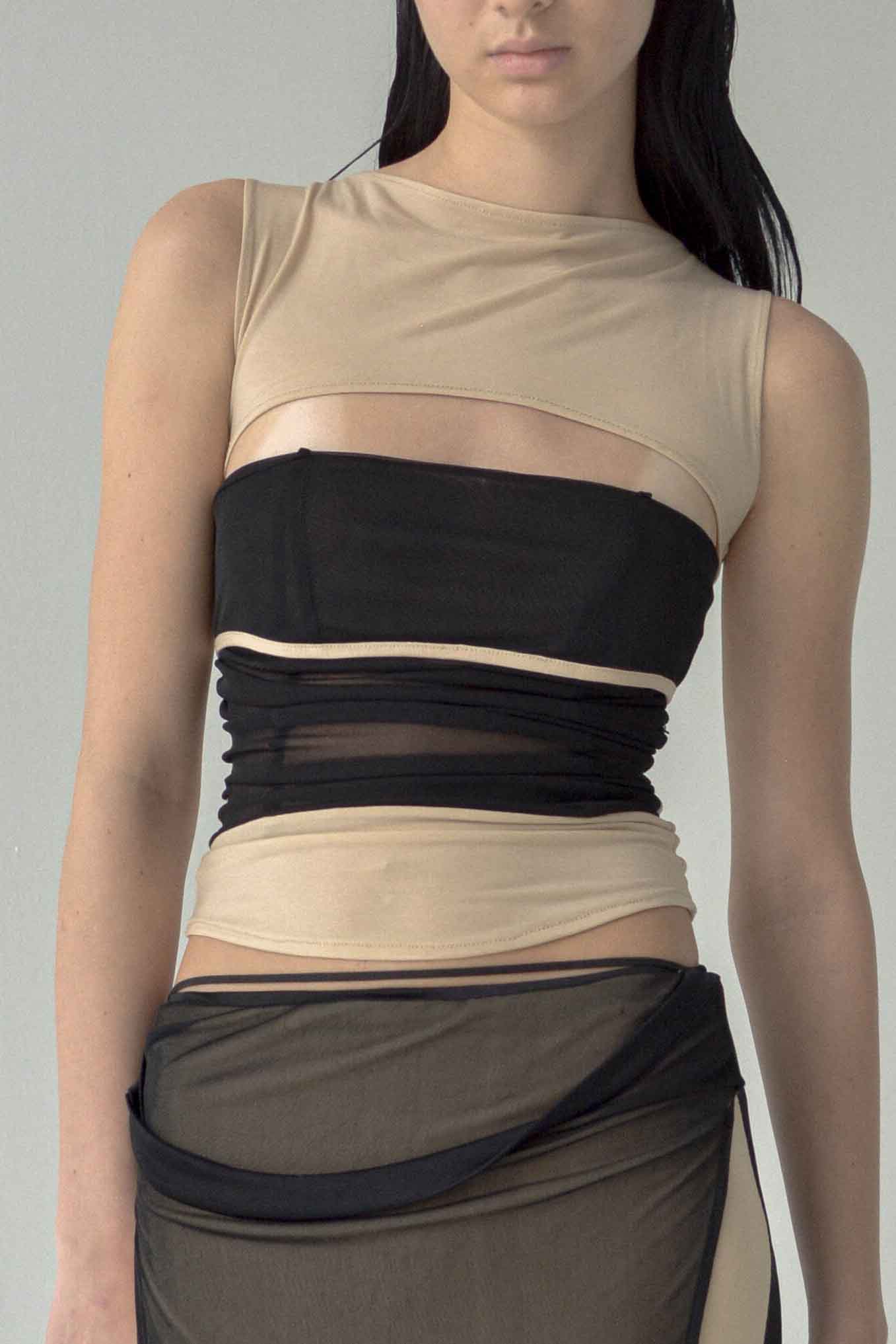 Cavallo Nude Top is a stretchable tank top with fold-over details on the chest. Pullover style. Stretchy nude mesh with black netting.