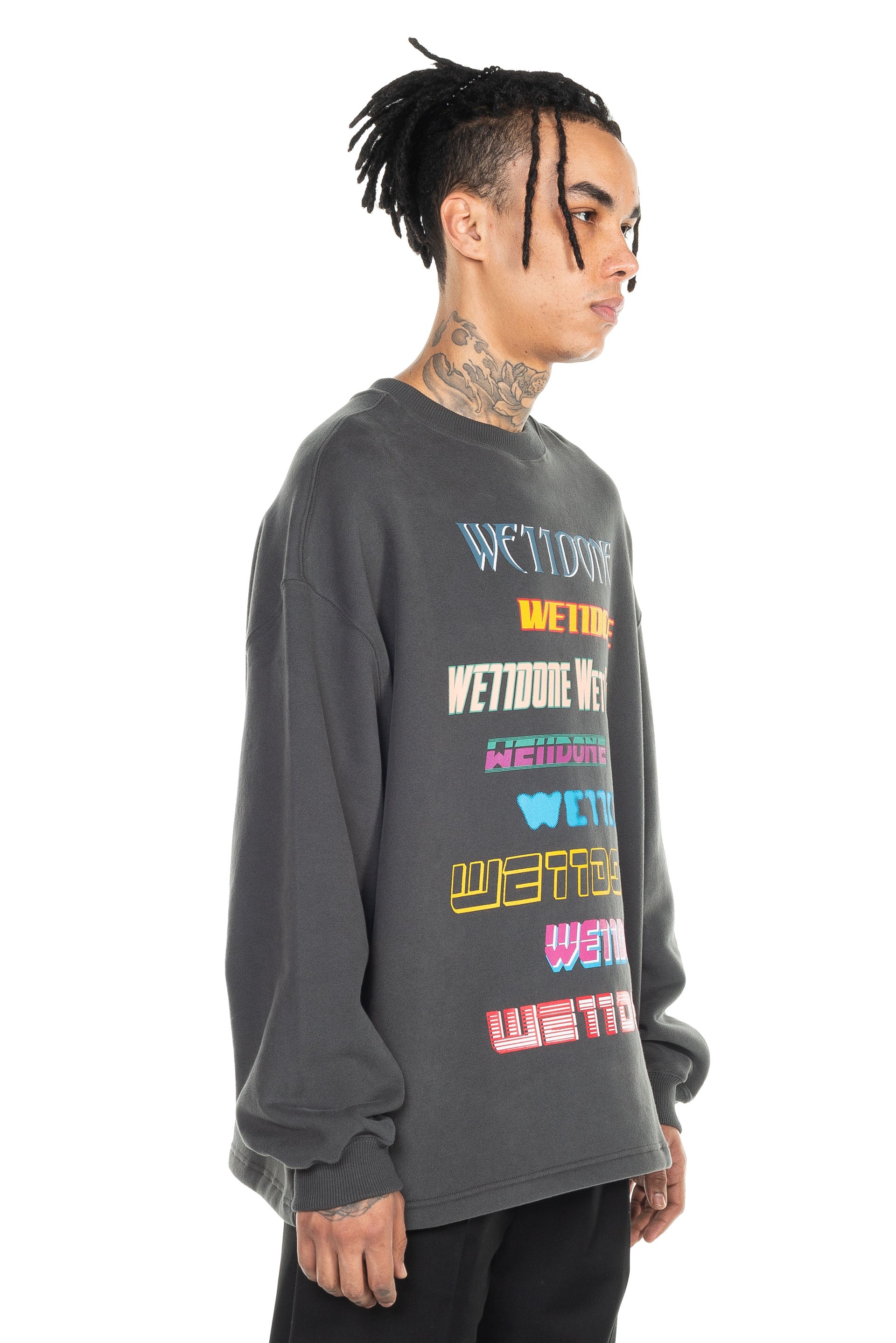 We11done Grey Front Logo Sweatshirt Long sleeve cotton-blend fleece sweatshirt. Rib knit crewneck collar and cuffs. Logos bonded in multicolour at front. Rubberised logo patch at back.