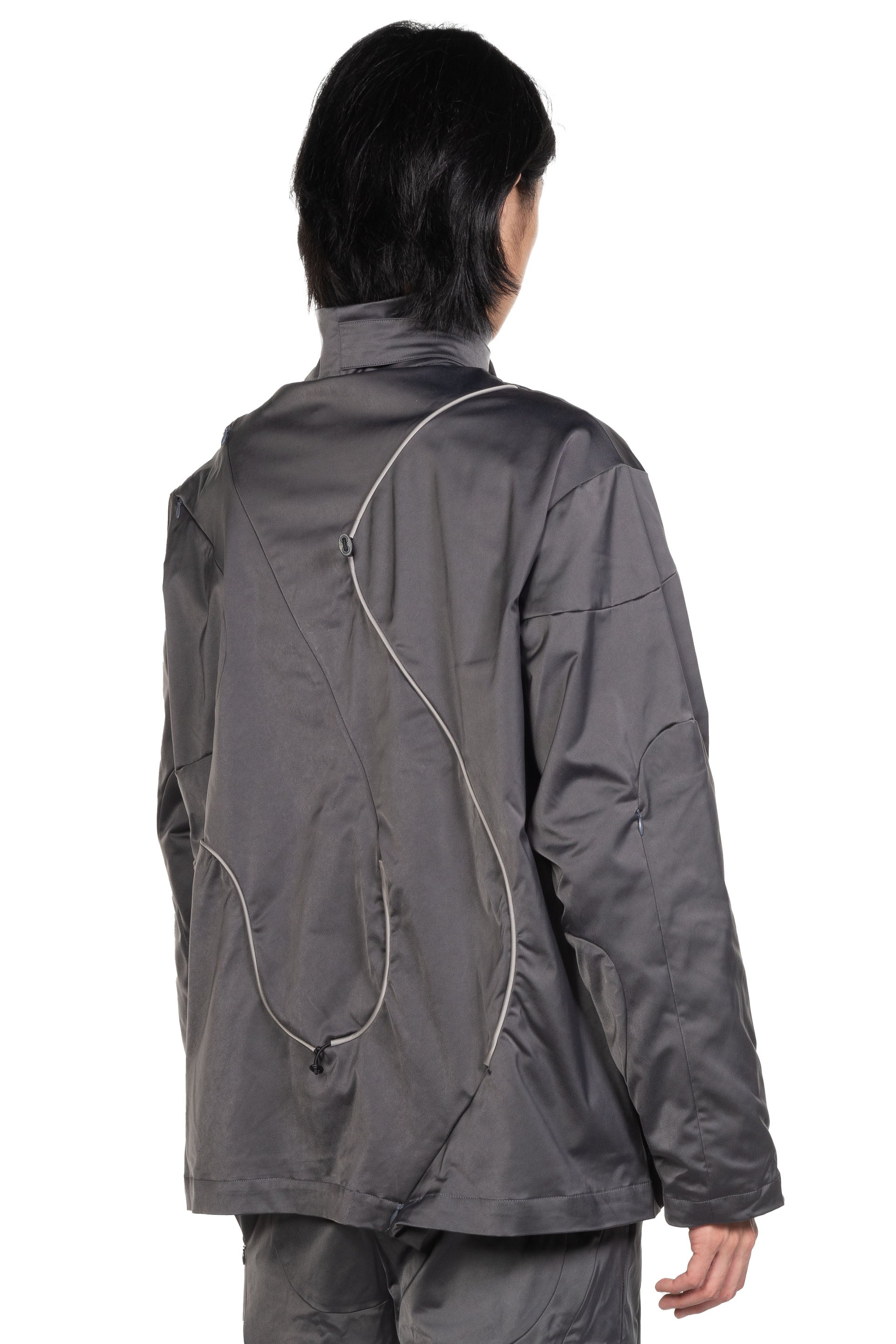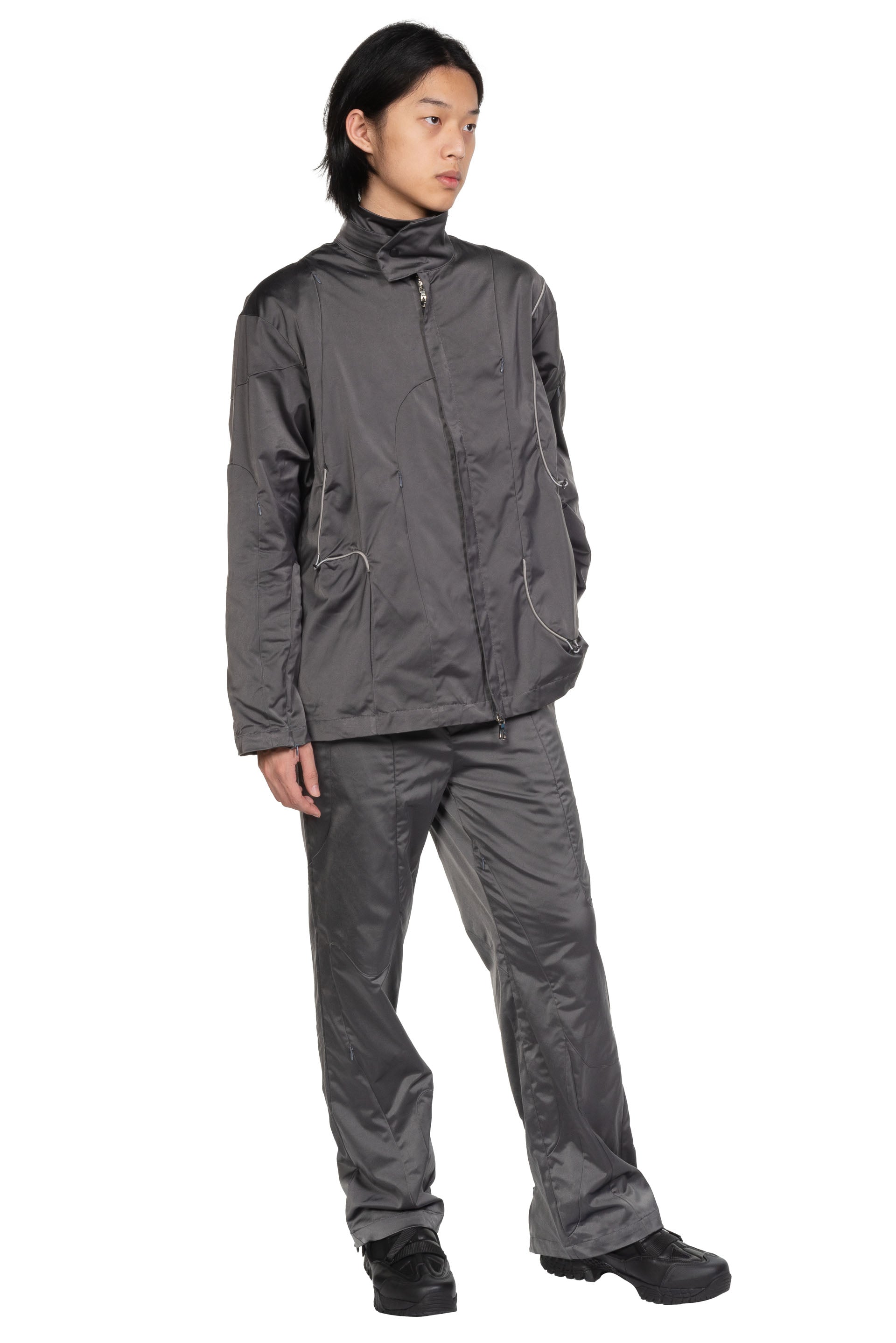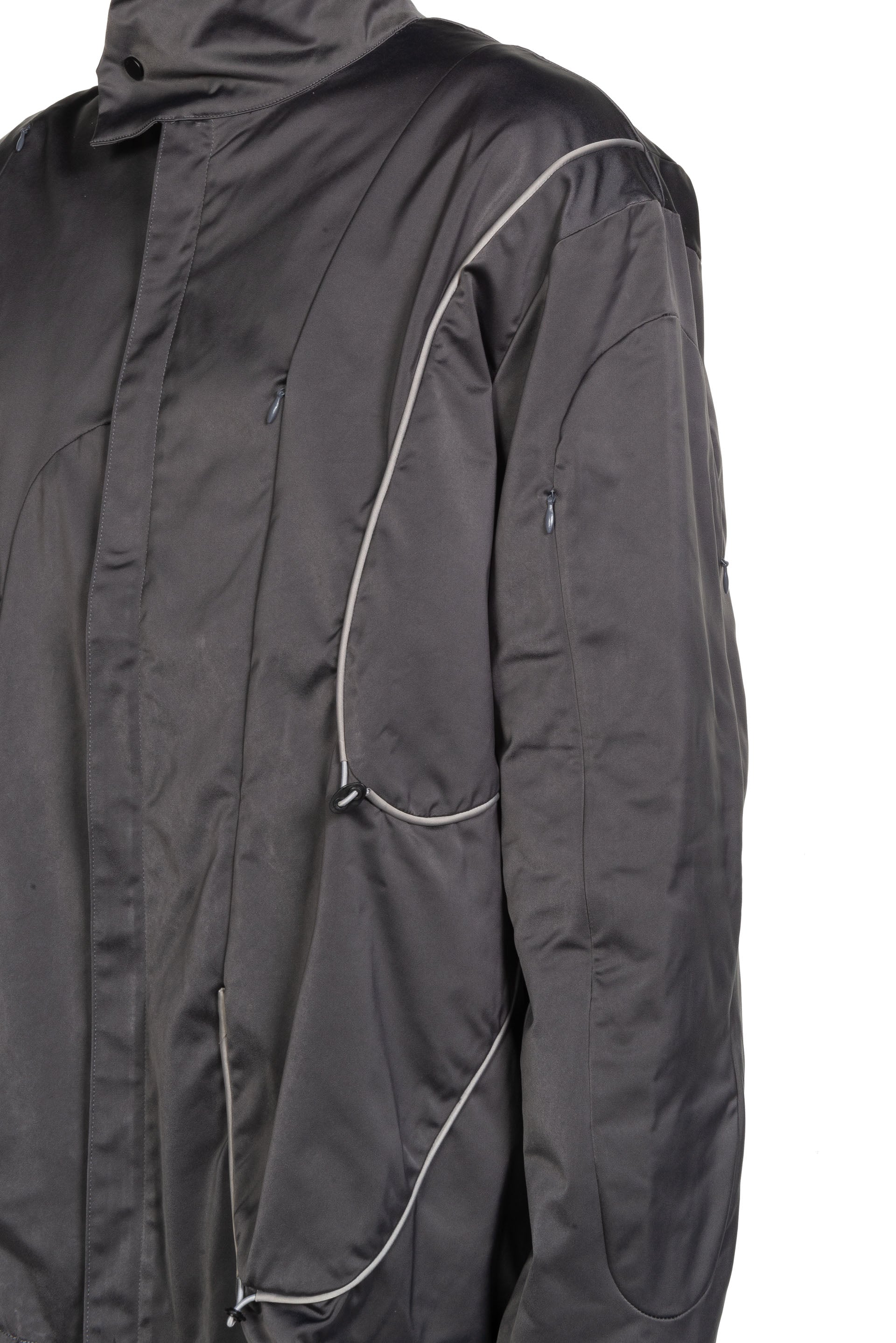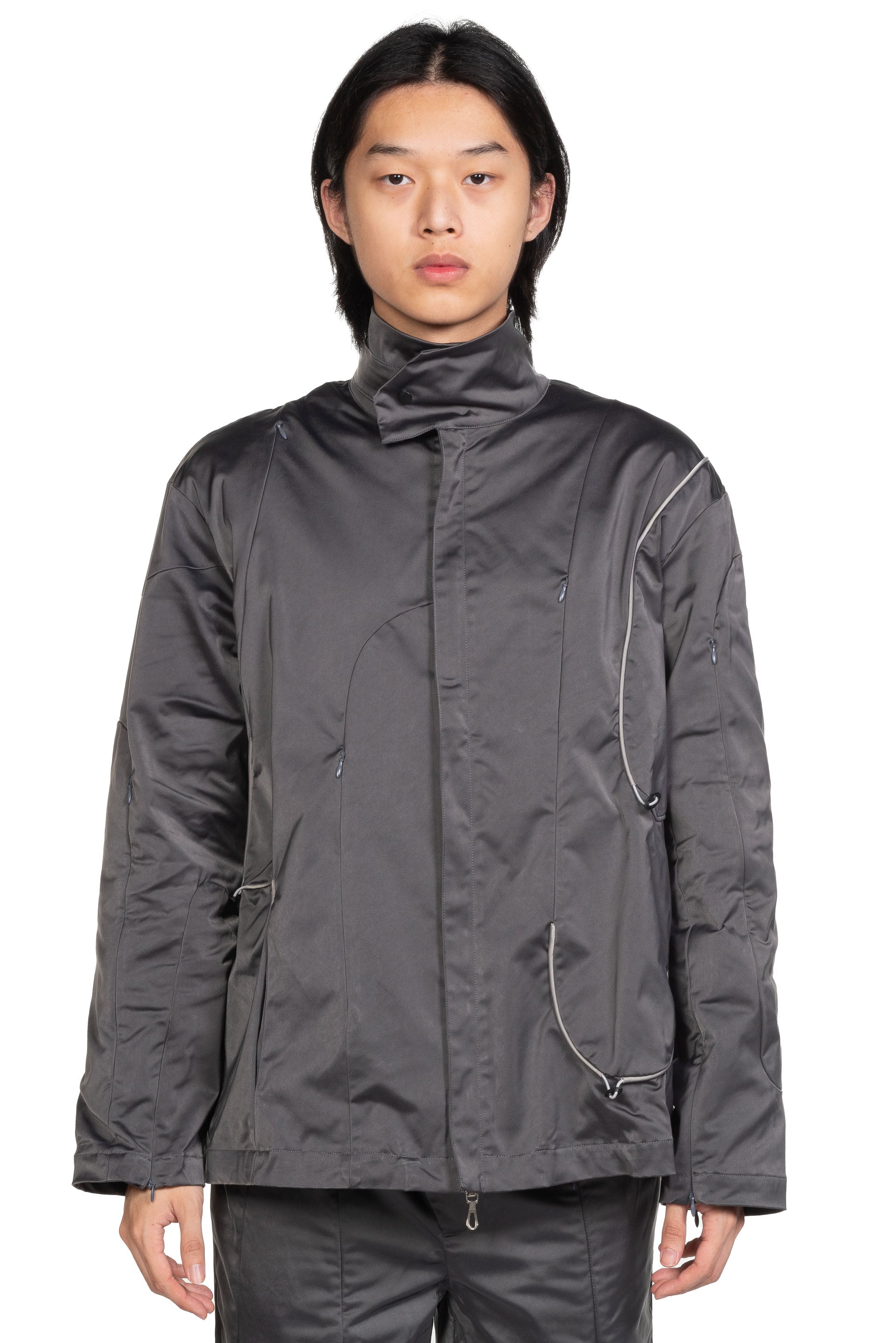 Nylon and polyester-blend satin jacket. Piping, bungee-style drawstring, and concealed zip pockets throughout. Paneled construction · Throat guard at stand collar. Concealed two-way zip closure. Seam pockets. Zip expansion panel at cuffs and hem. Patch pocket at interior. Full cupro taffeta lining. Black and silver-tone hardware.