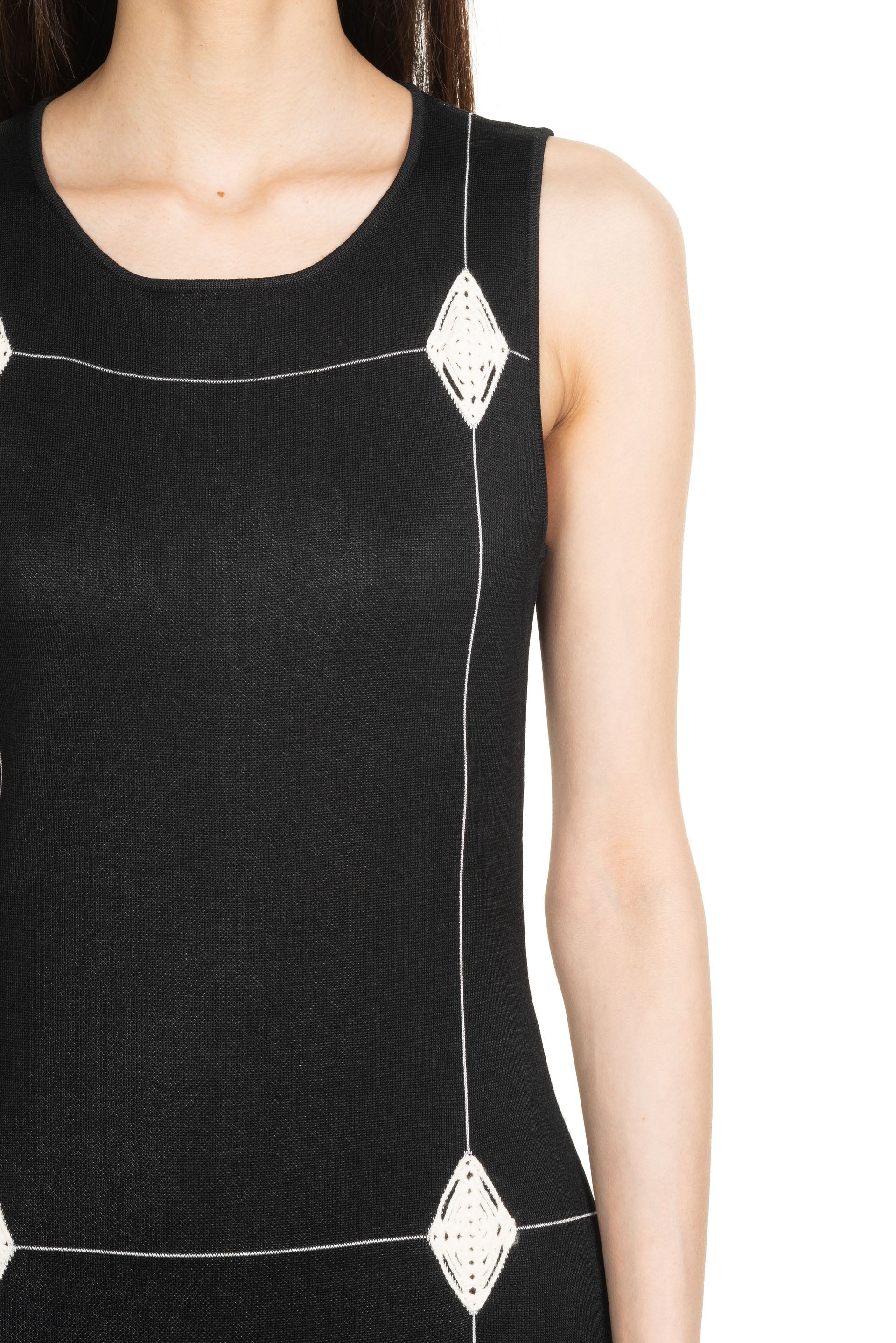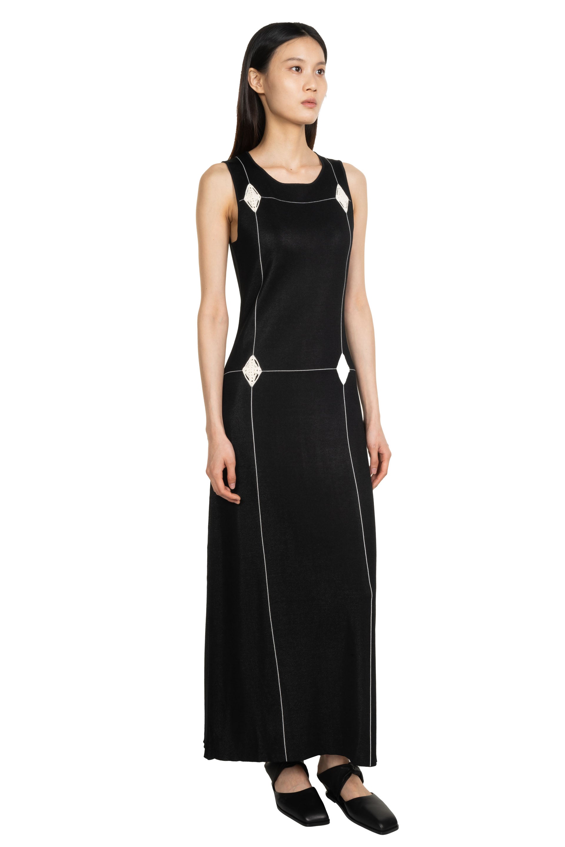 Swaying Check Crochet Embellished Vest Dress in Black. Knitted dress. Sleeveless. Round neck. Embroidery details throughout. Soft and stretchable fabric. Long fit.