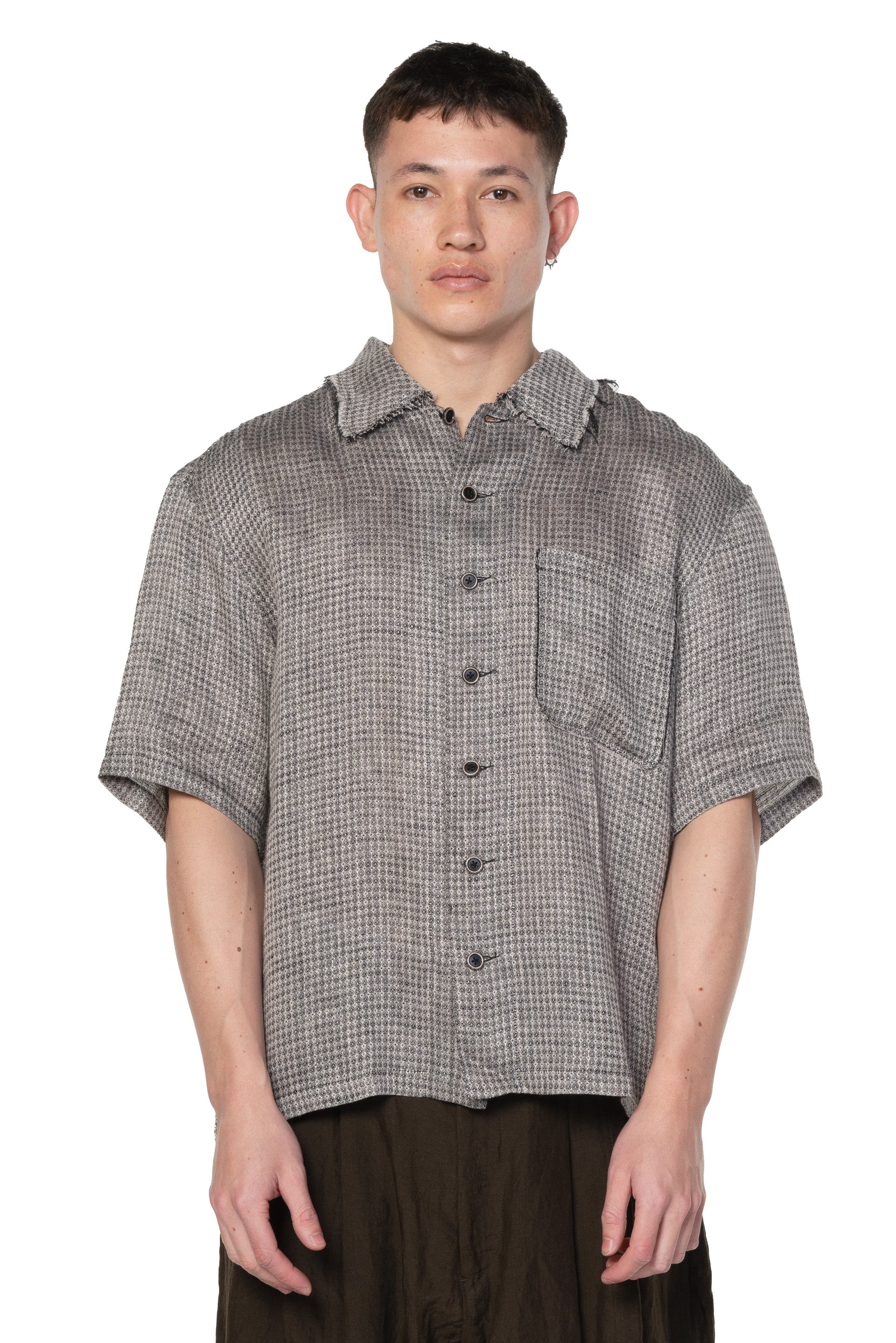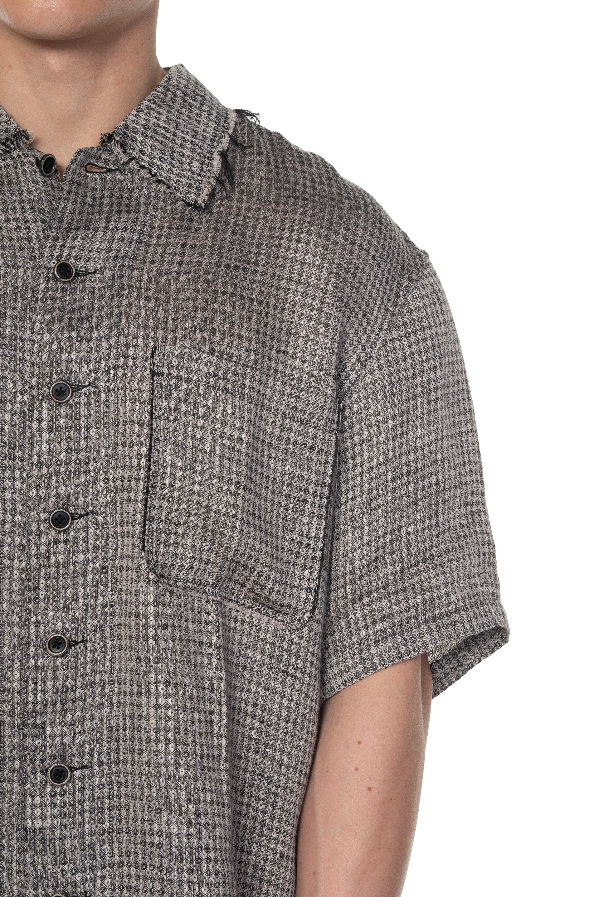 Short sleeves. Button closure at front. Classic collar. Raw edges throughout. Boxy fit. Pocket at front.