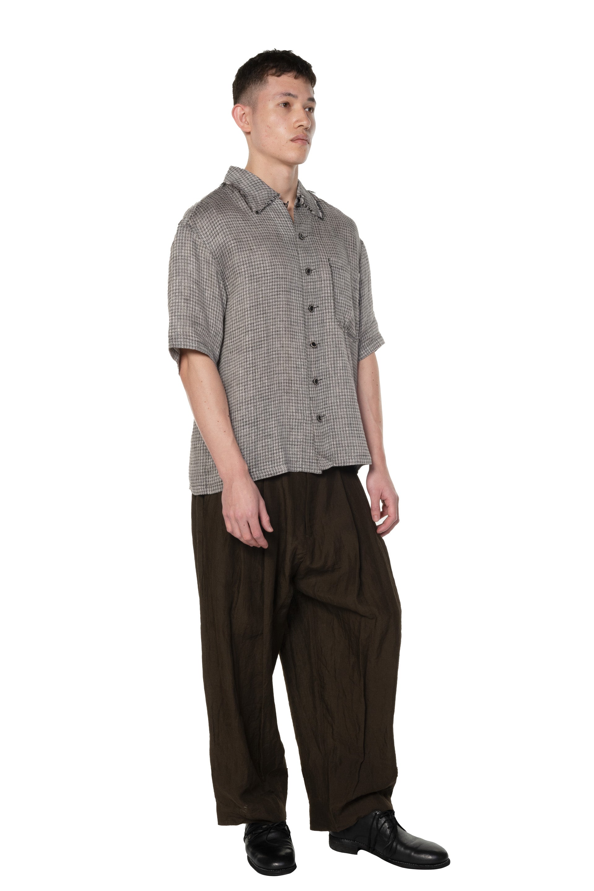 Peng Tai creates modern silhouette with traditional chinese philosophy. Inspired by how Chinese herbal medicine regulates the body from the inside out, Peng Tai aims to research and develop a way to boil Chinese herbal medicine with fabrics, to create clothes that feel like a second skin as seen with the Checked SL Shirt.