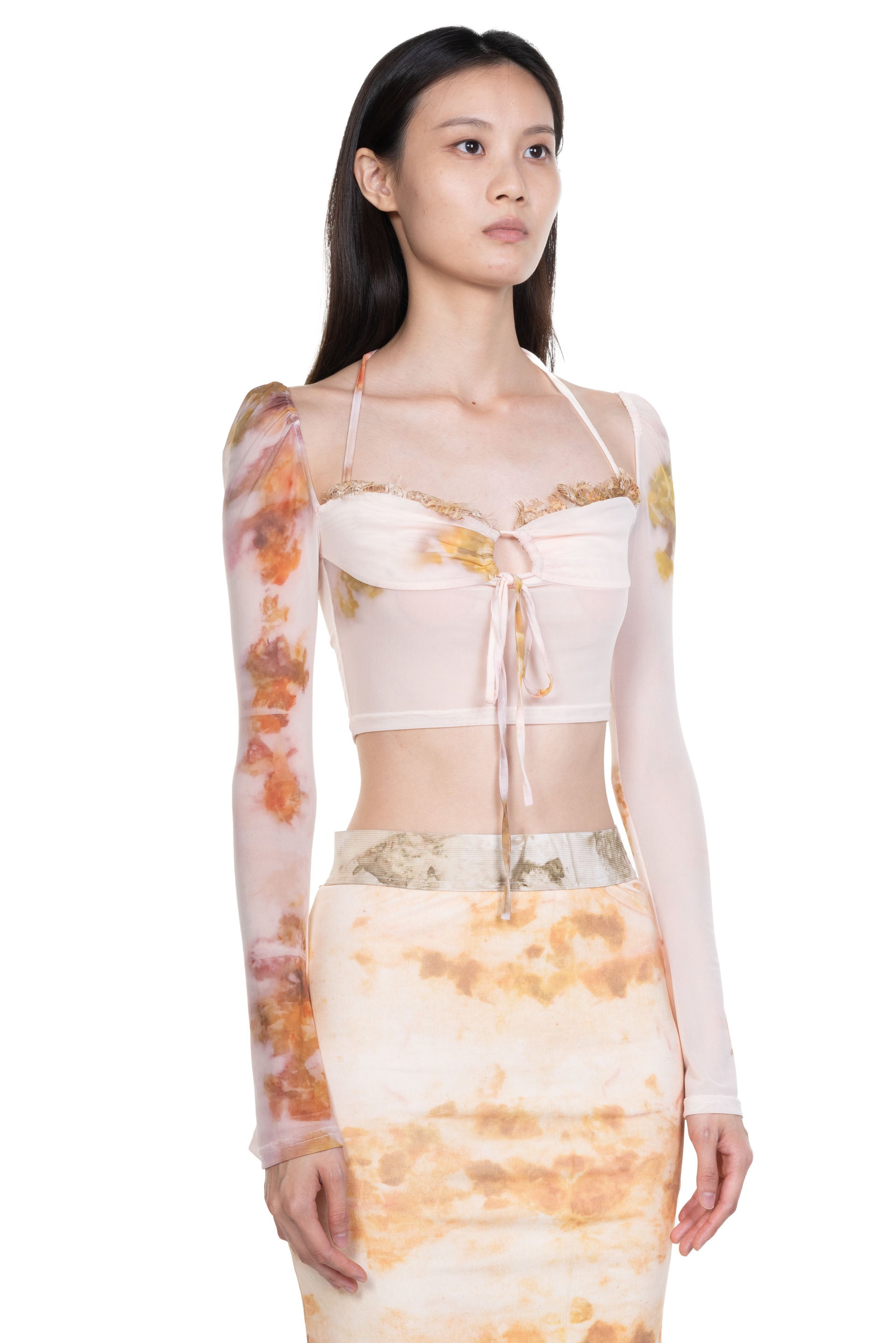 Printed lace top. Cropped. Signature print throughout. Long sleeves. Straps at shoulders.