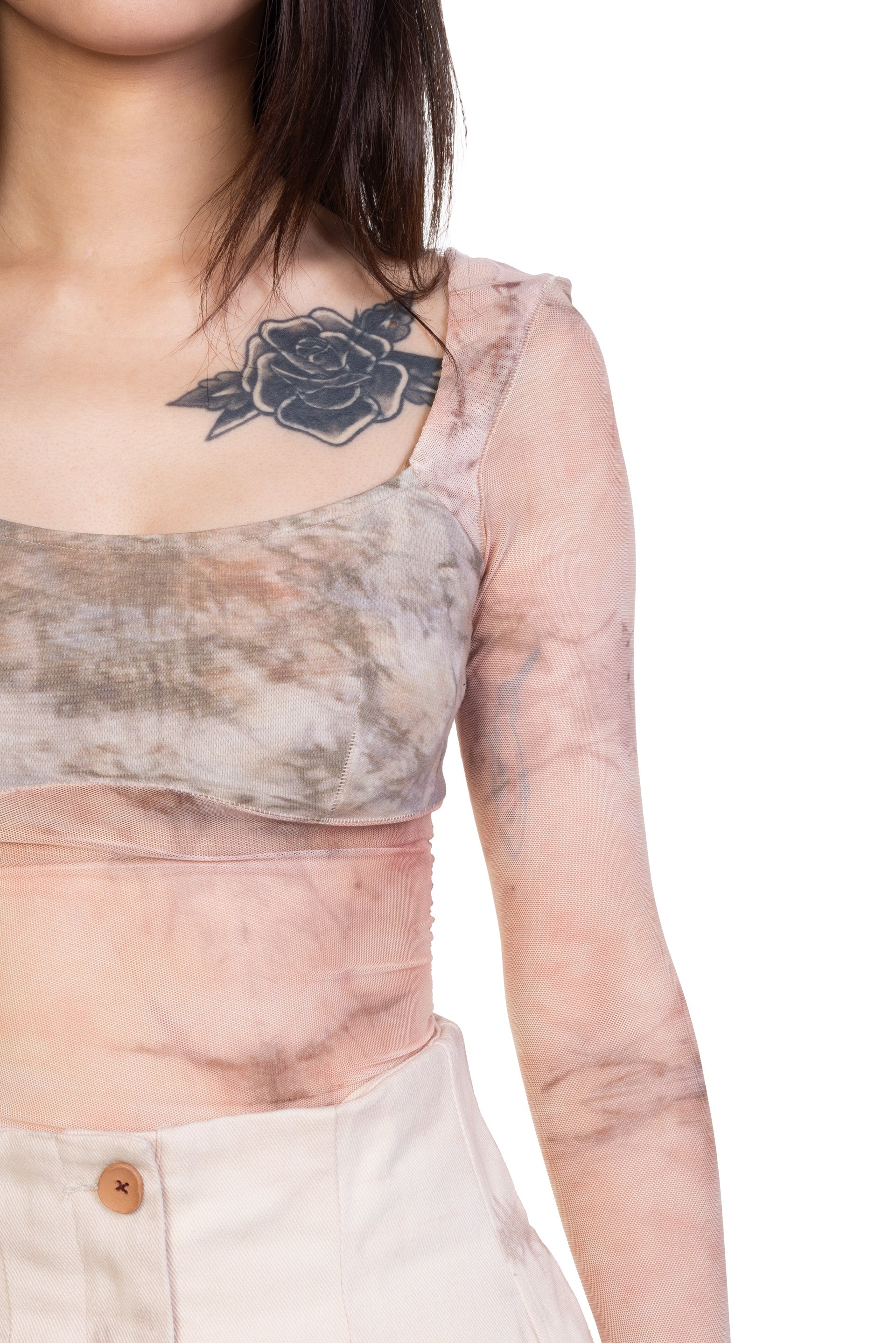 Peng Tai creates modern silhouette with traditional chinese philosophy. Inspired by how Chinese herbal medicine regulates the body from the inside out, Peng Tai aims to research and develop a way to boil Chinese herbal medicine with fabrics, to create clothes that feel like a second skin as seen with the Chinese Medicine Print Square NL Top.