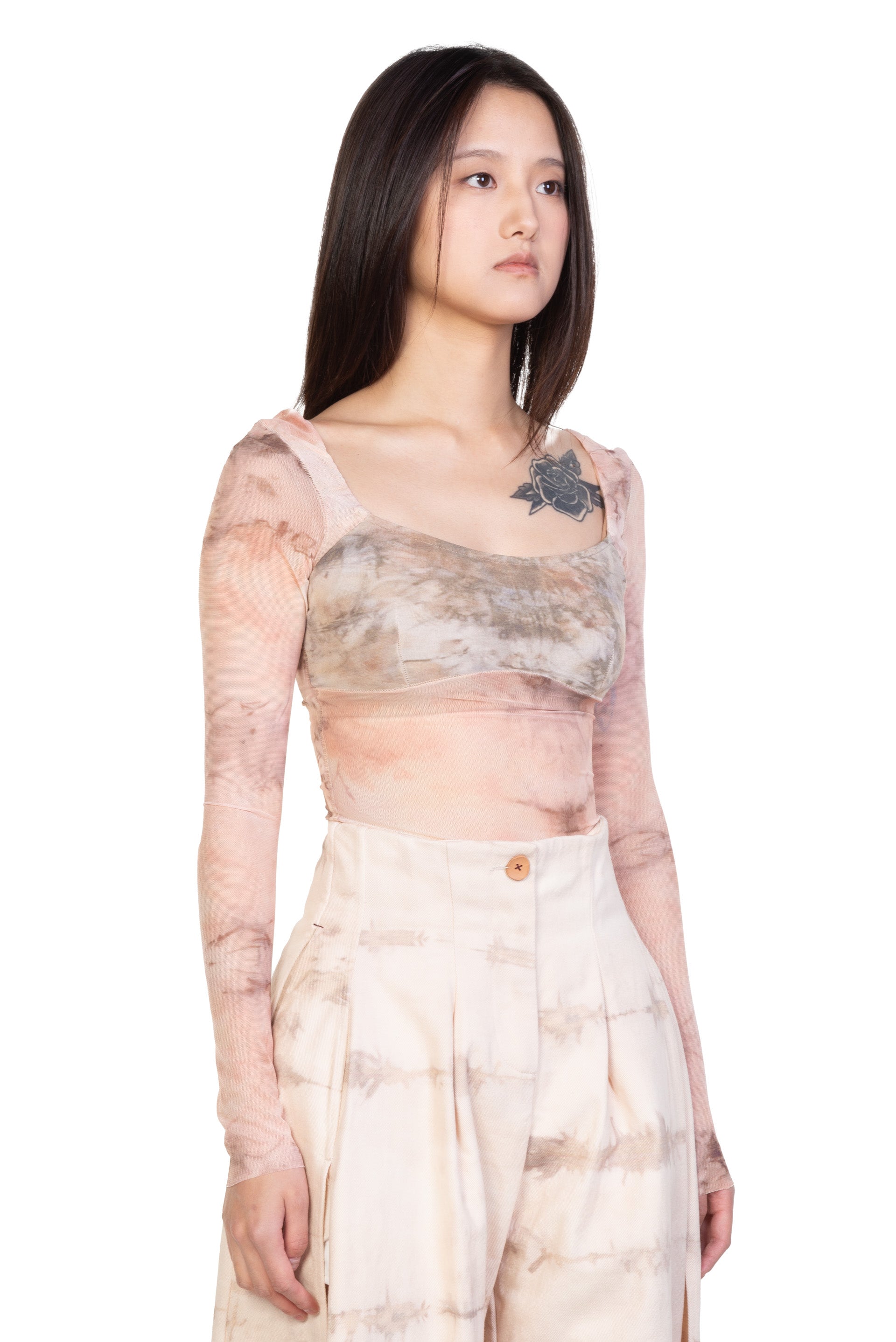 Long sleeves. Cropped. Sheer fabric with signature print throughout.
