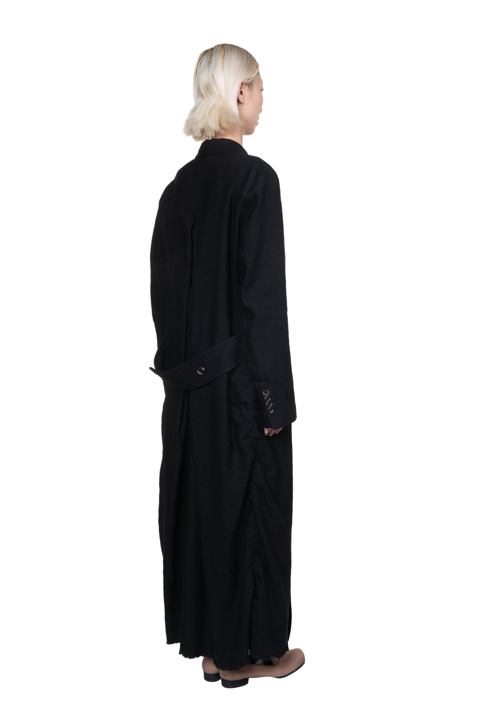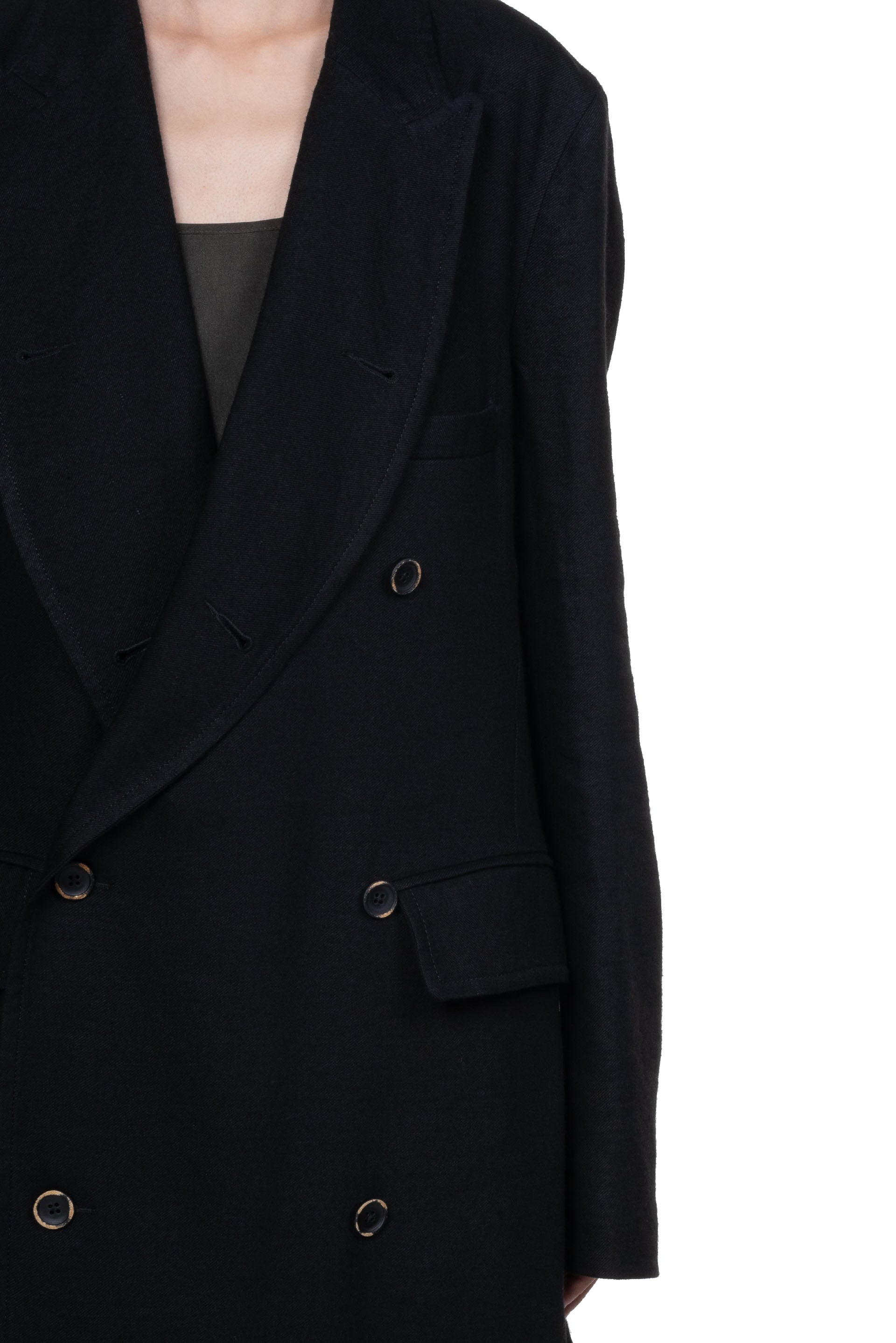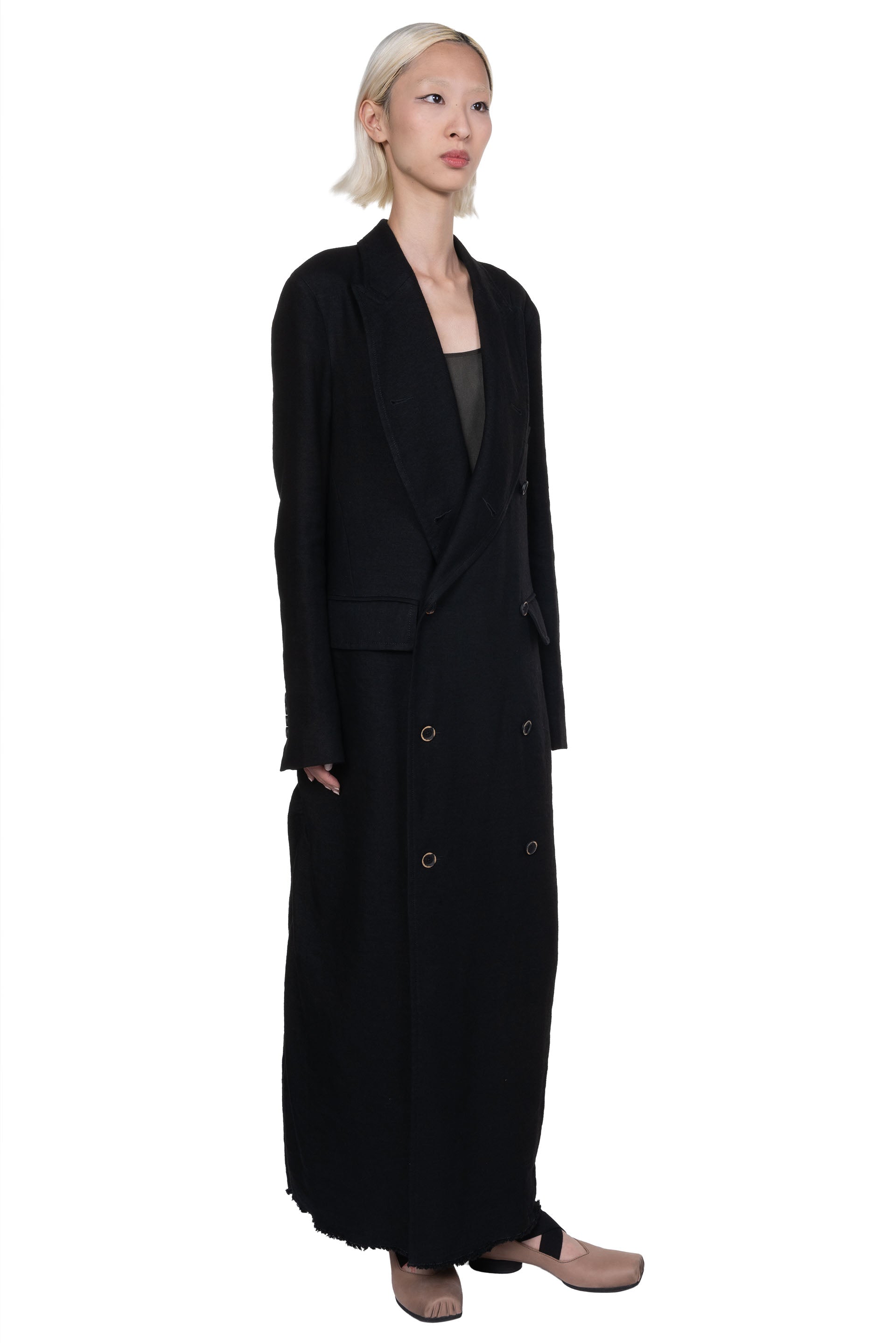 UMA WANG Cigna Coat Black. Double breasted. Long sleeves. Two pockets at front. cupro lining. Long fit. Soft textural wool fabric.