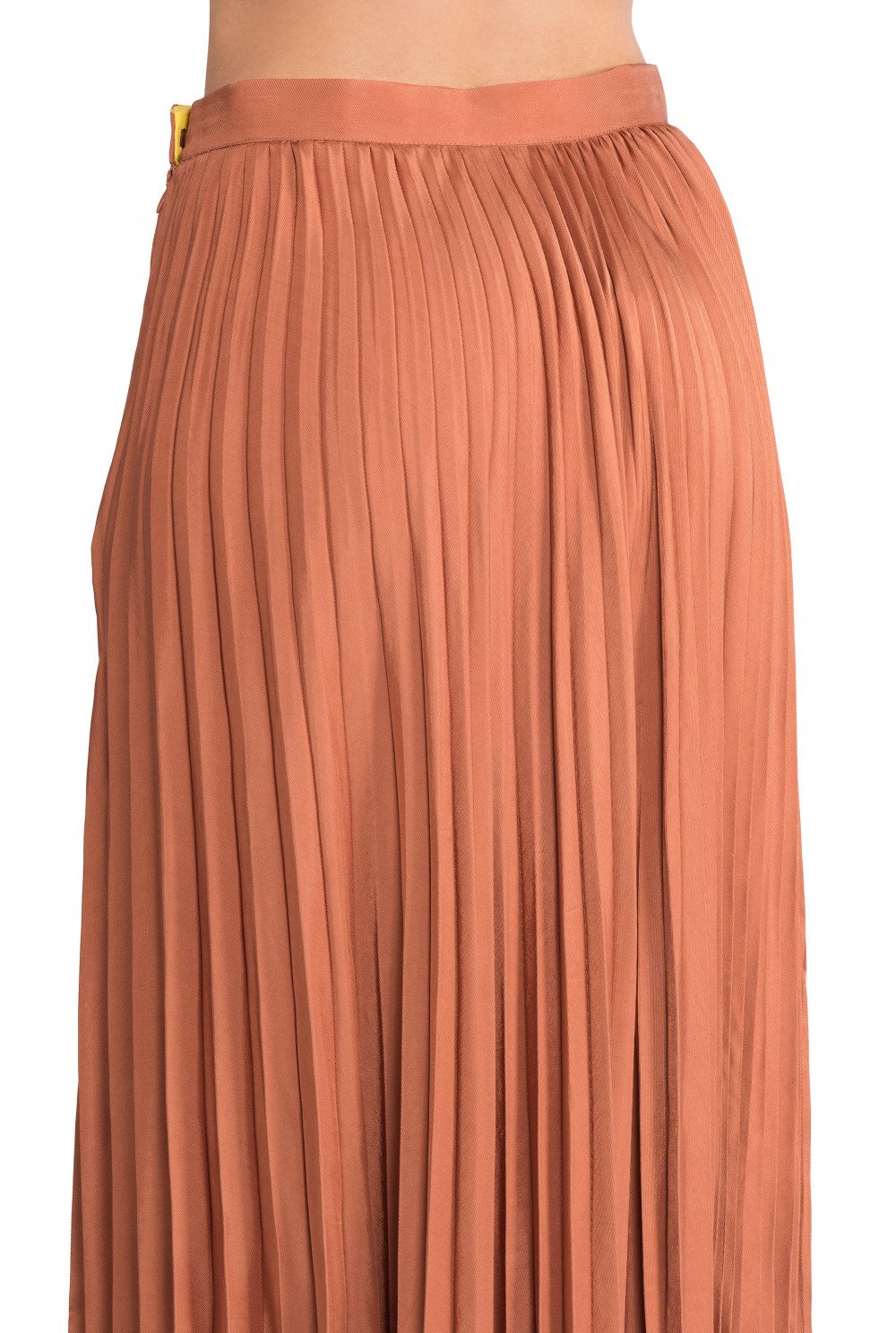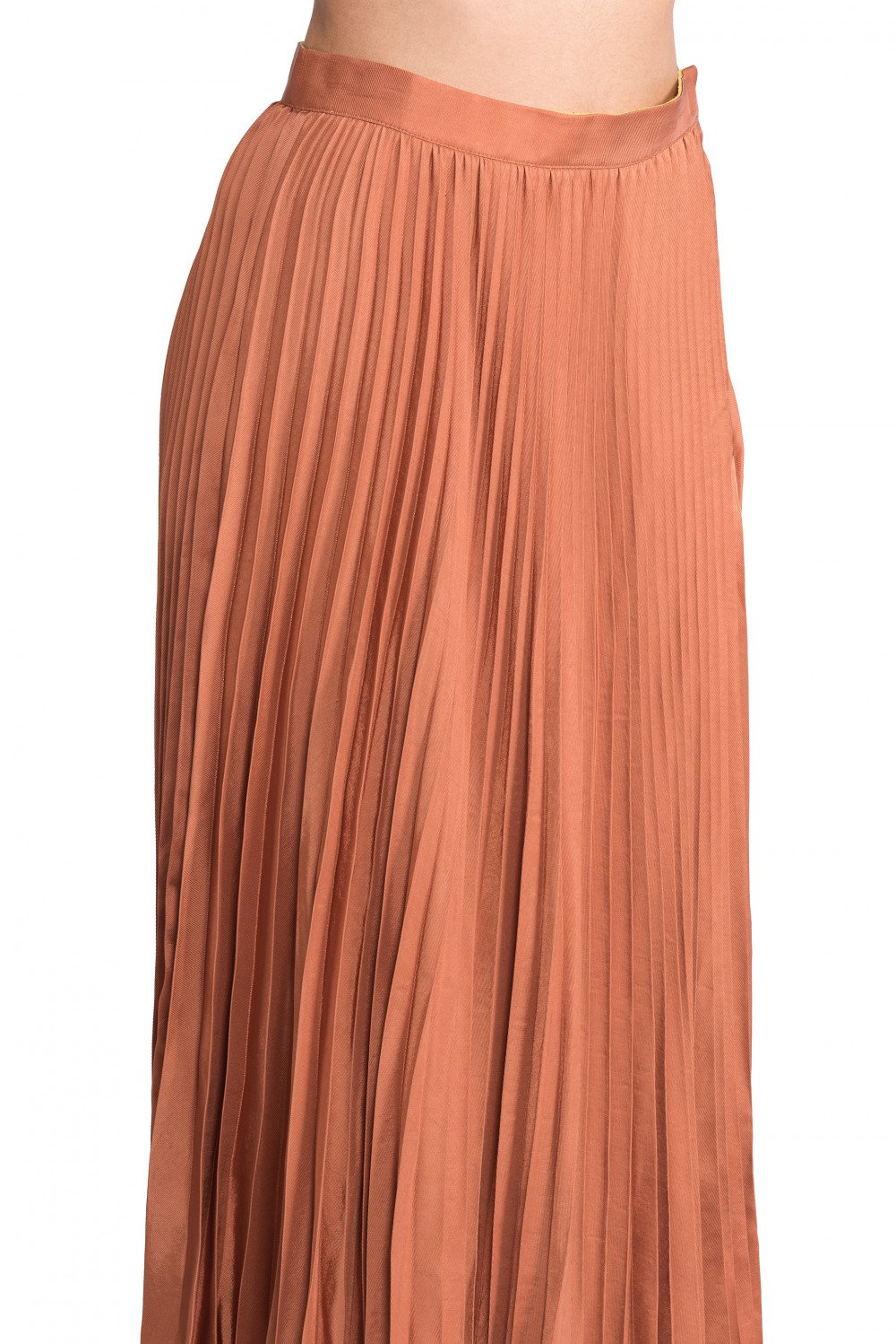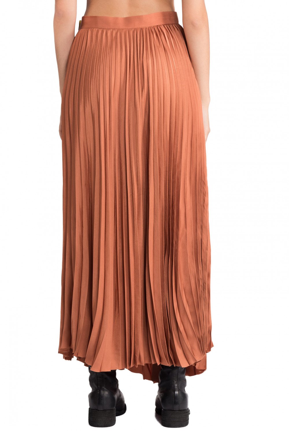 It is a pleated skirt that falls naturally. It features a soft texture and regular wrinkles, providing a comfortable fit.