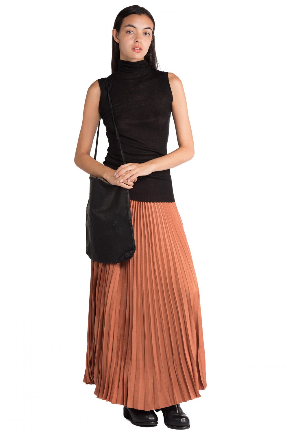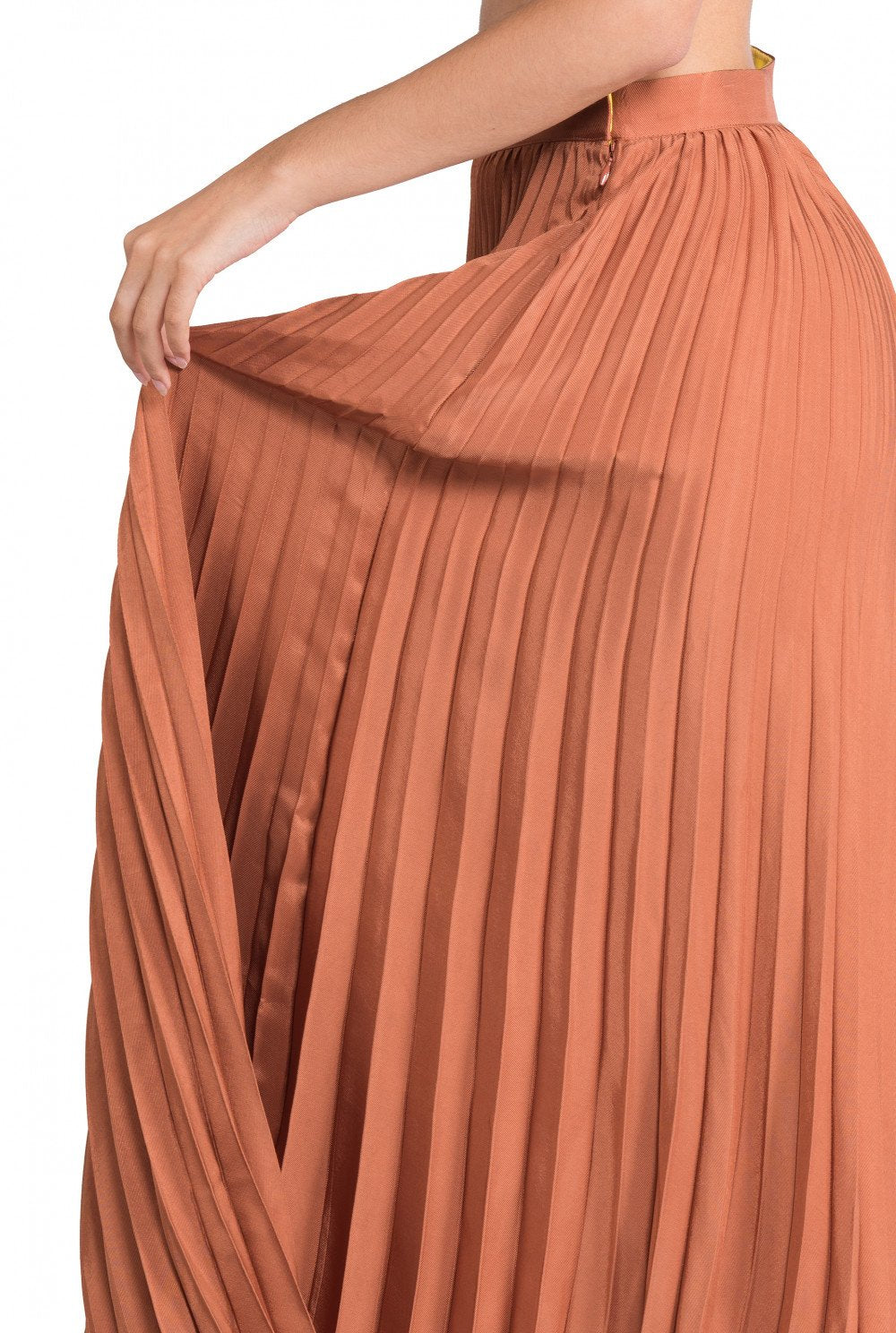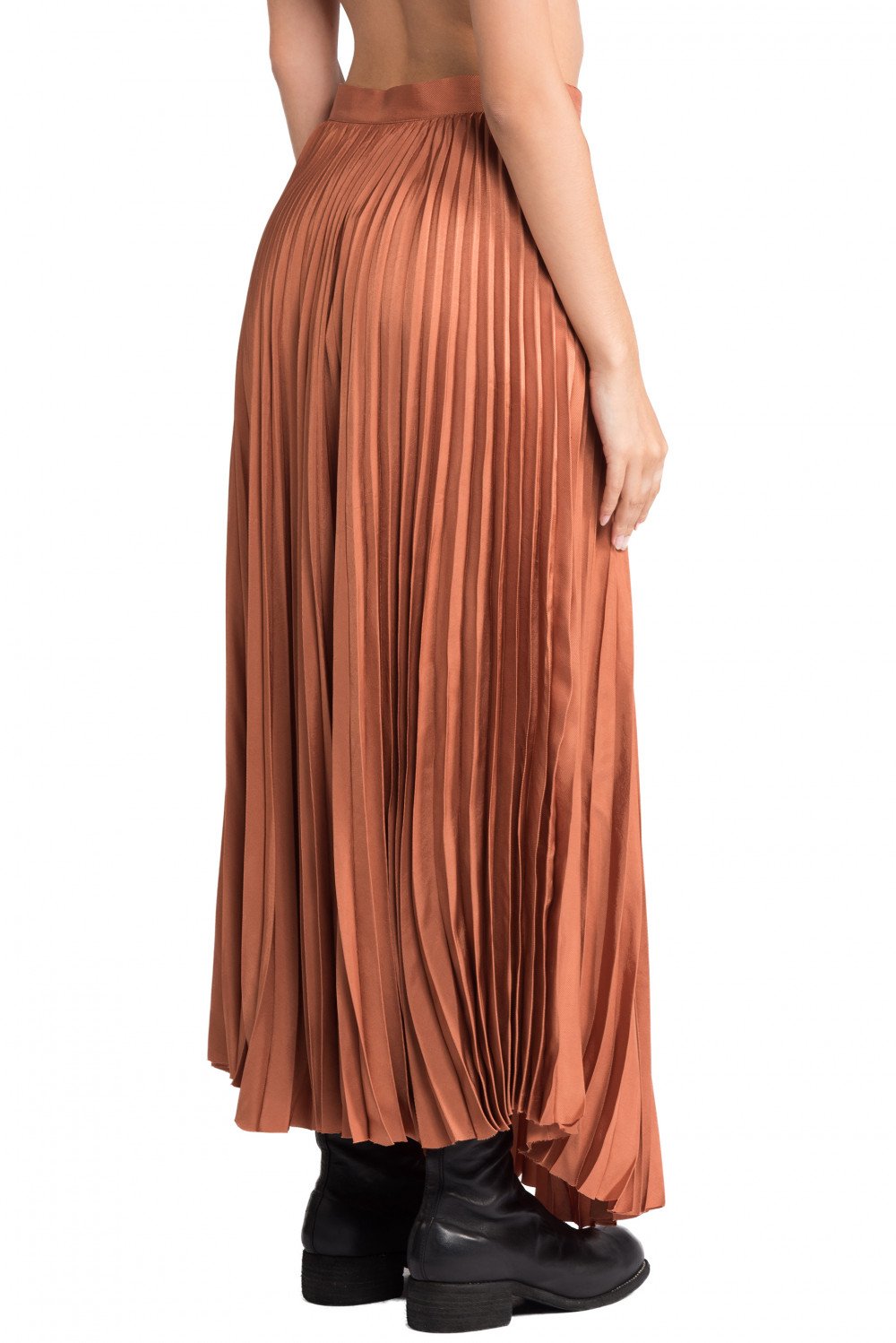 It is a pleated skirt that falls naturally. It features a soft texture and regular wrinkles, providing a comfortable fit.