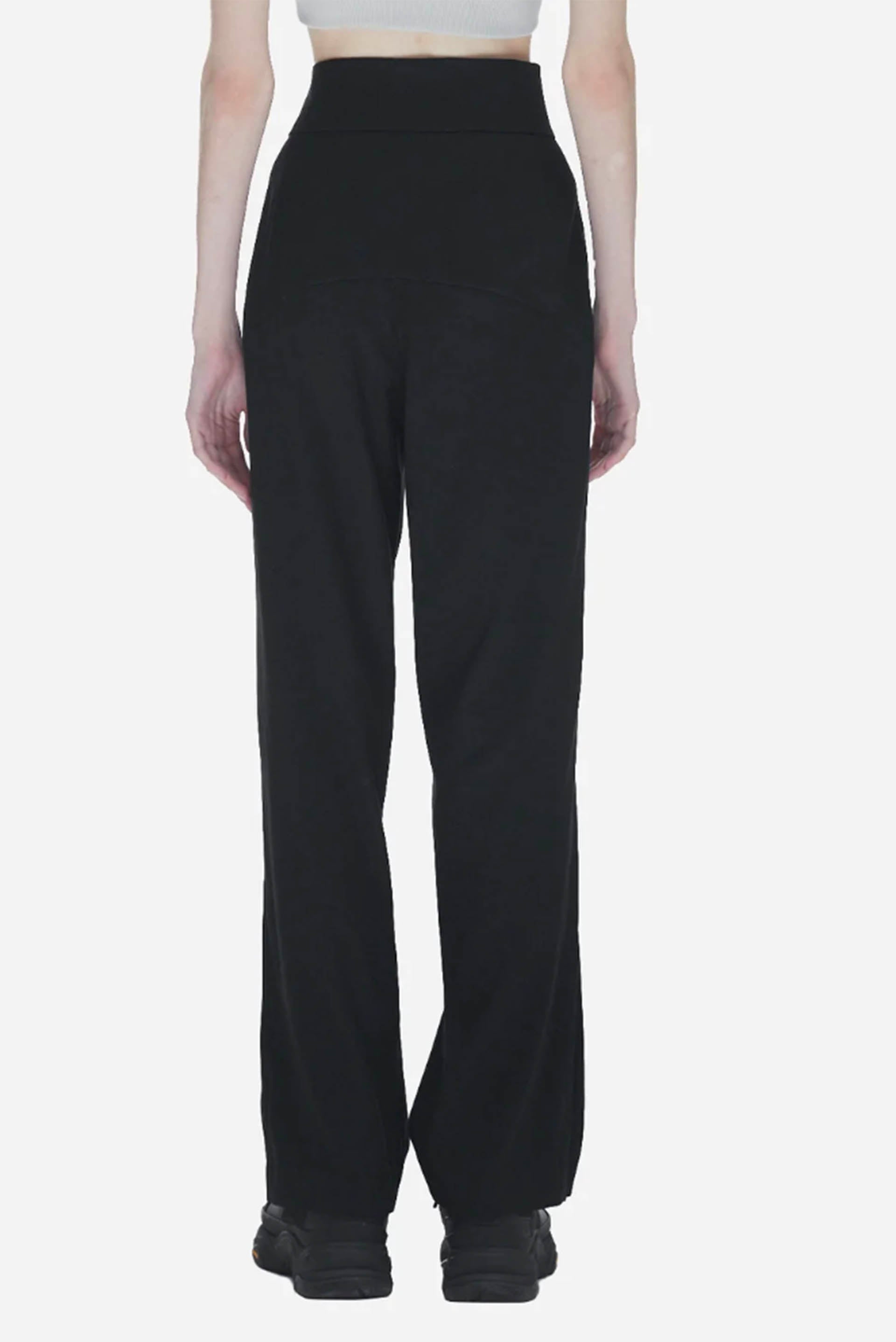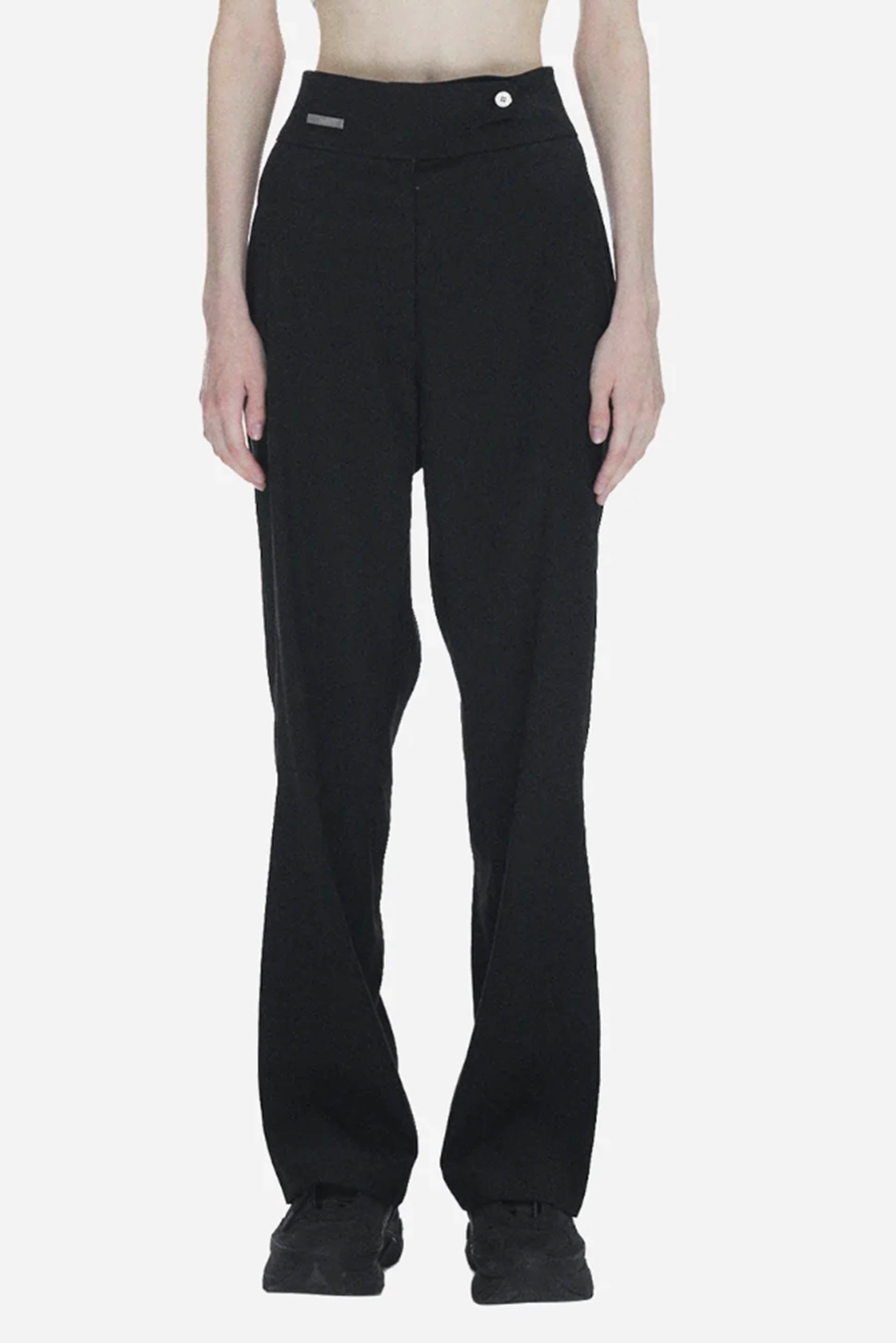 Wide-leg wool-blend tailored trousers in black. High-rise. Four-pocket styling. Logo engraved metal tag at waistband. Zip-fly. Unlined. Metal-tone hardware.