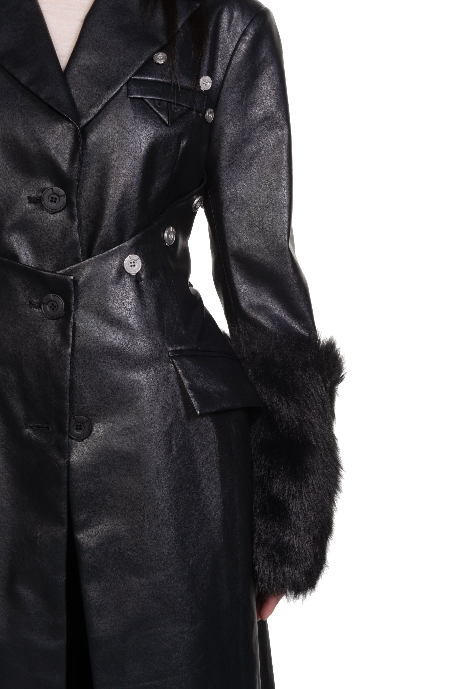 Circular Arc Buttoned Leather Coat from C2h4. Button details throughout. Detachable fur details on sleeves. Button closure. Detachable belt closure at waist. Two side pockets.