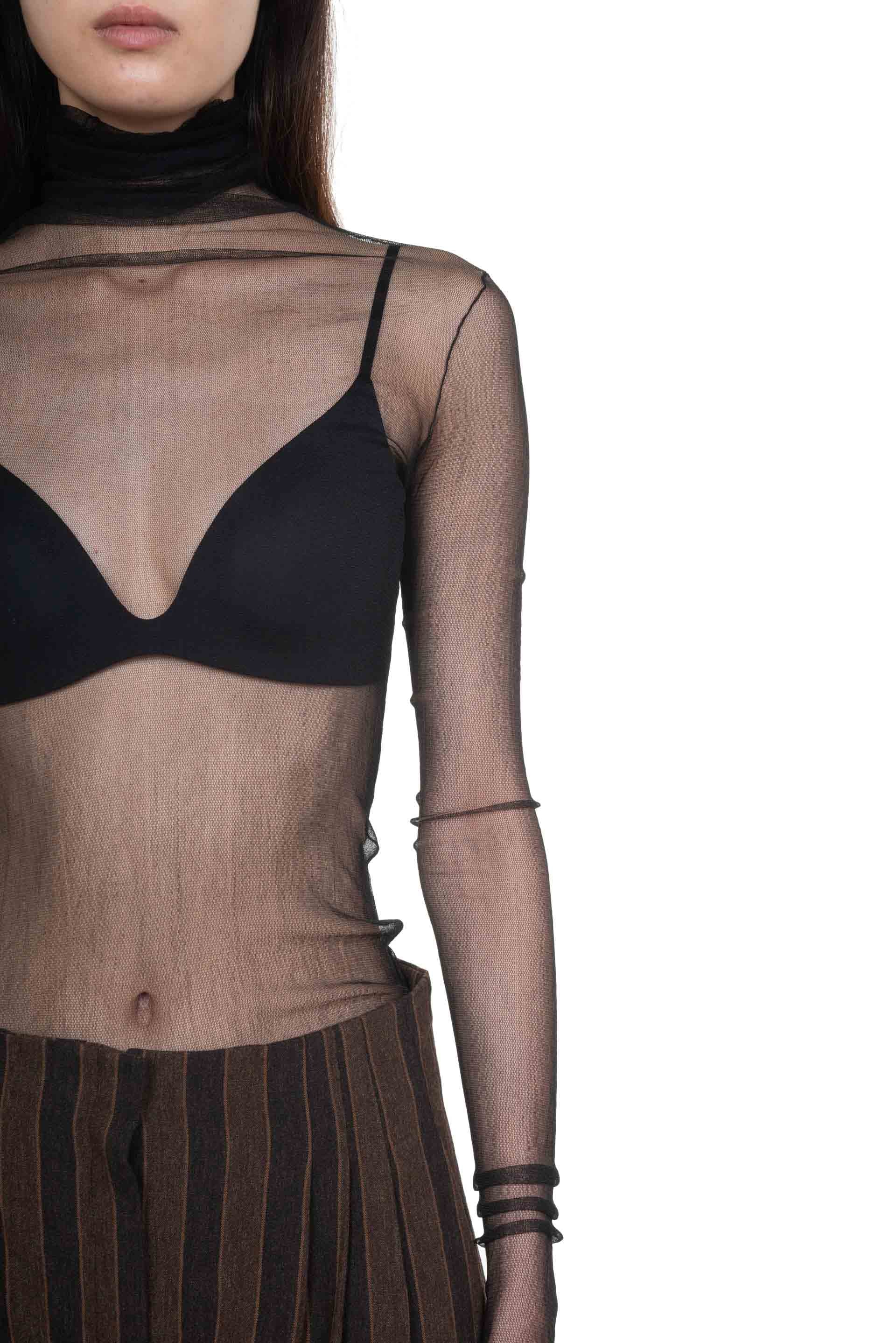 Sheer natural silk tulle top, with a high neck and long sleeves. Perfect to wear with sleeveless dresses or to let it peek under any garment.