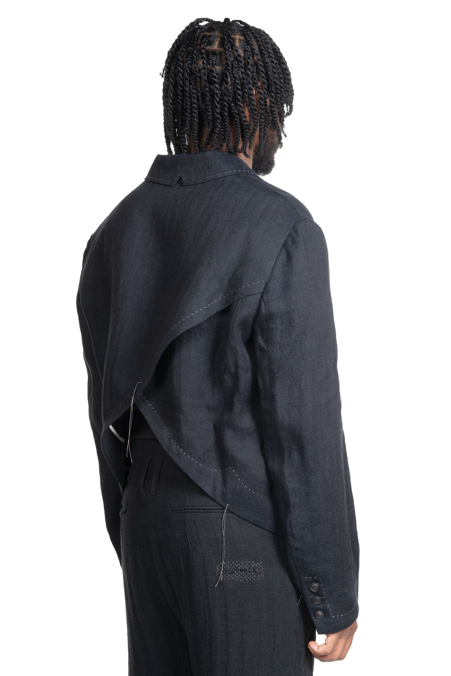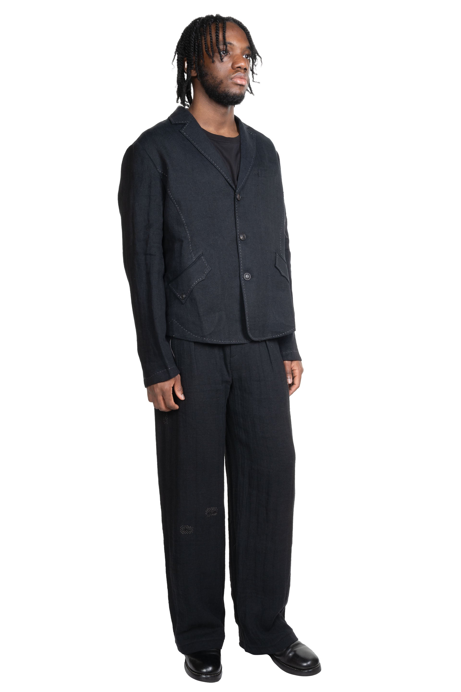 Professor e Civilian Jacket Black. Long sleeves. Three button closure at front. Two side pockets. Stitching details throughout. Signature overlapping back design.